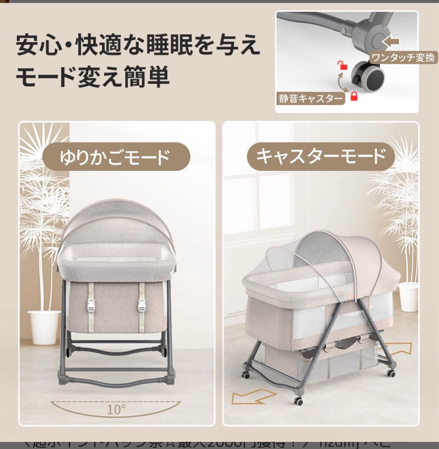 楽天で大人気1位のベビーベッドです! 移動もできるし、ゆりかご機能、下に荷物も入って便利でした! 我が家は2ヶ月くらいしか使わず、吐き戻しはお漏らしもベッドではなかったため大変綺麗なままです。 マットレスは別売りのものを使っていて、必要な方は一緒にお譲りします!シーツもついています* ・折り畳み式 ・持ち運び便利 ・キャスター付き ・収納ボックス付き ・新生児〜24ヶ月におすすめ 中古品であることをご了承ください。