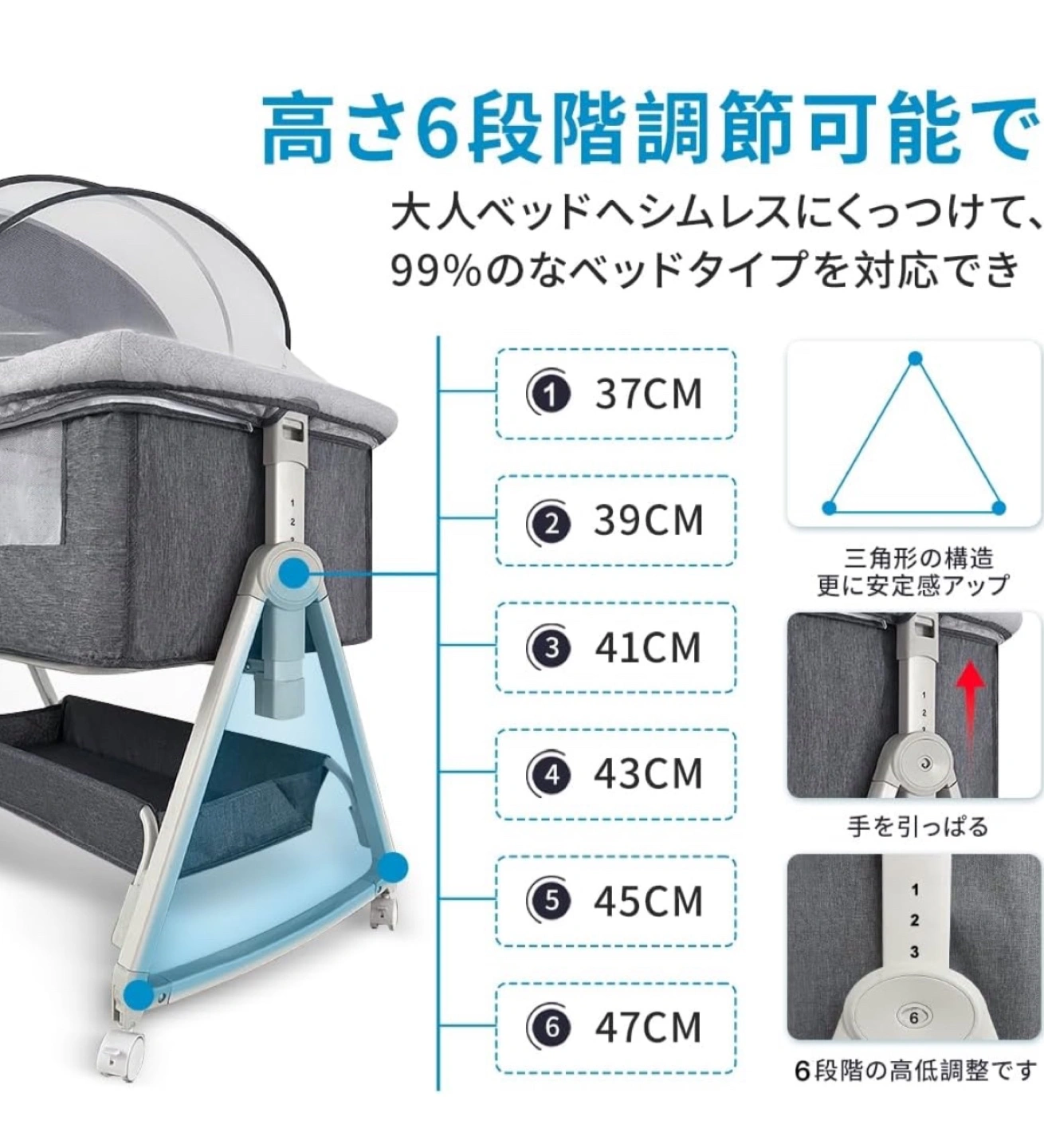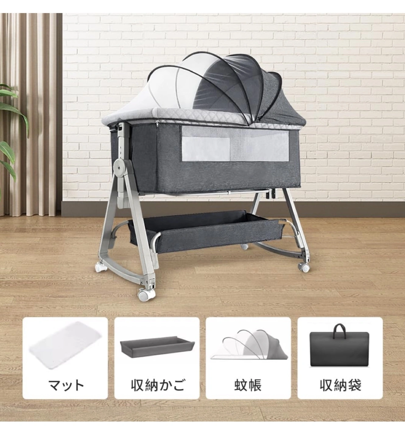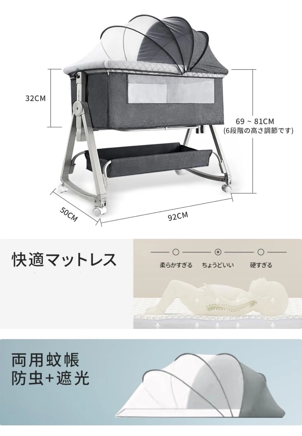 【商品仕様】セット内容:本体、マット、蚊帳、収納バスケット、収納袋。素材:高炭素鋼+綿+メッシュ 重さ:7.4kg 耐荷重:20kgサイズ:92×50×81cm 折りたたみ時:92×55×12cm 通気性優れるリネン 適用年齢:0ヶ月~24ヶ月 【高さ調節可能】高さ6段階調節可能で、添い寝として大人ベッドの高さ同じに調節できます。