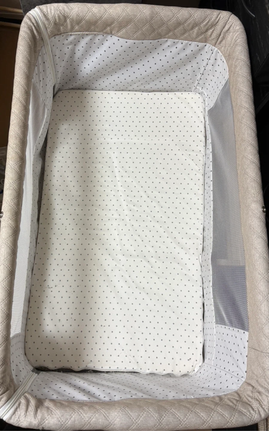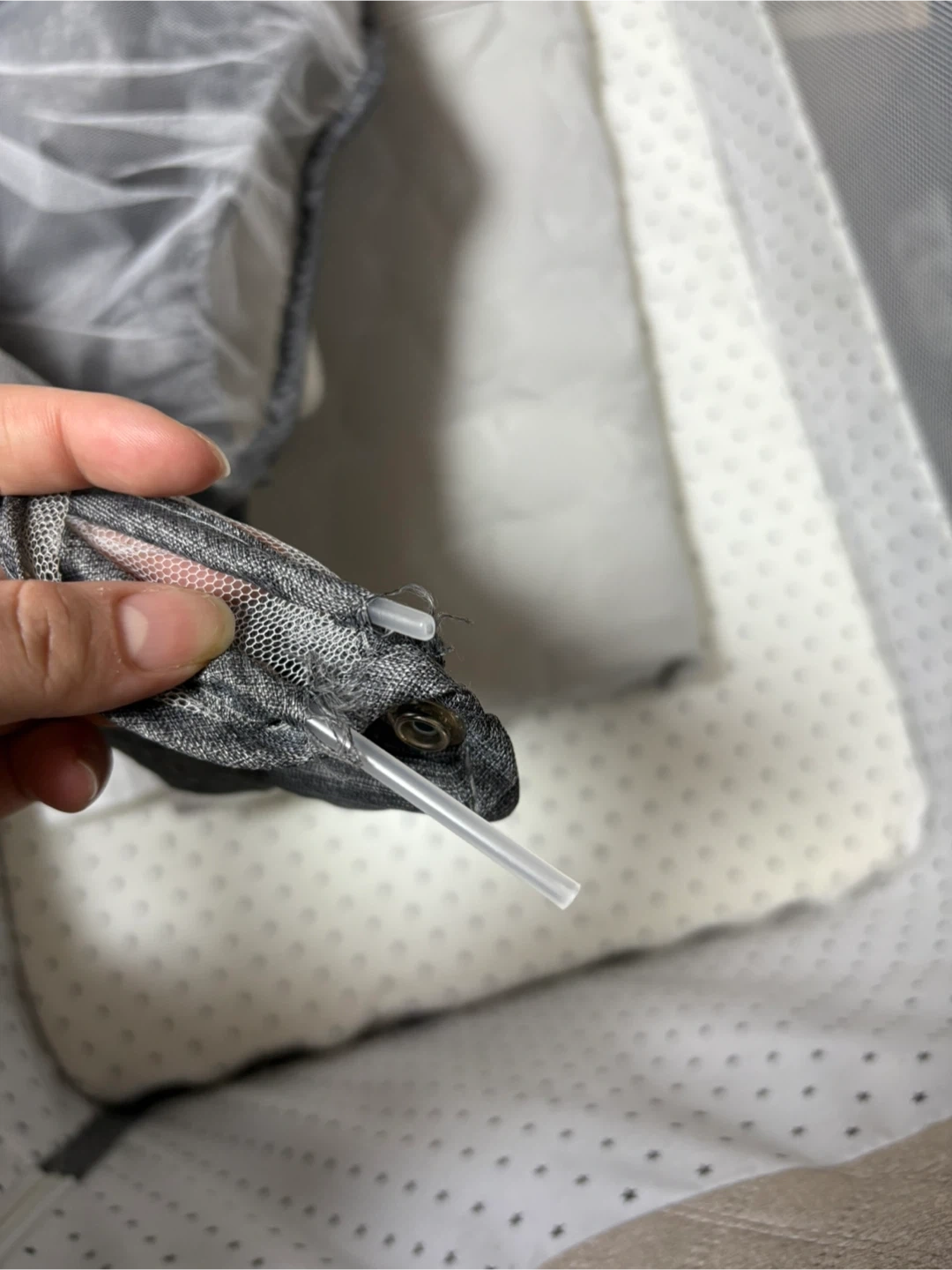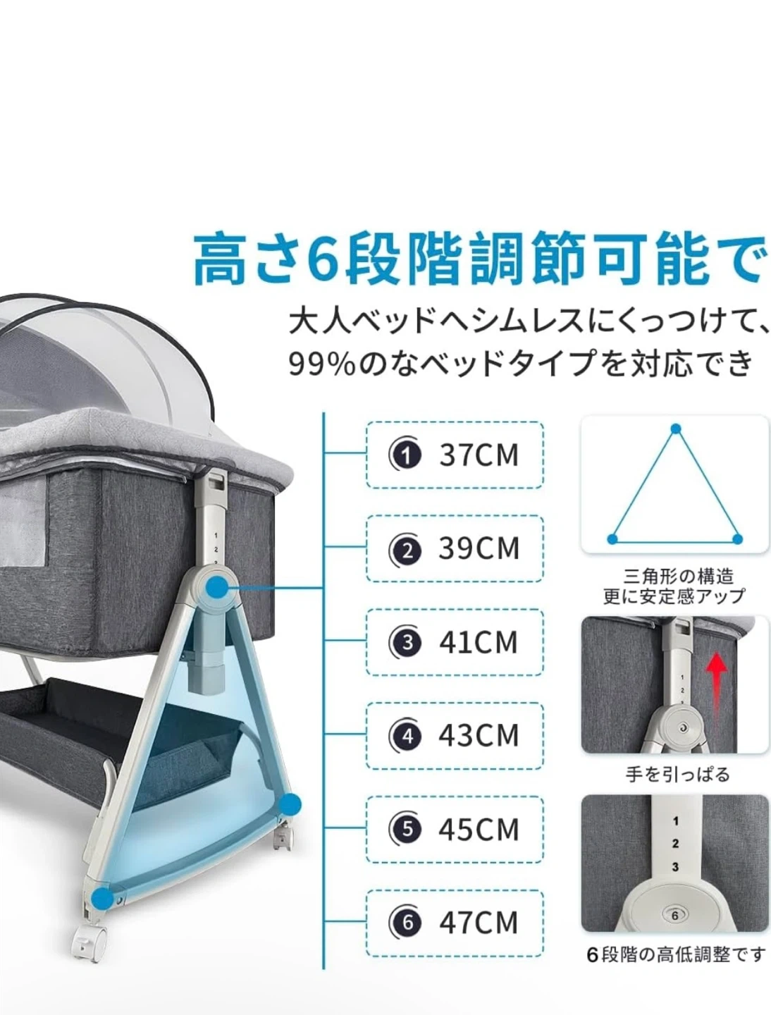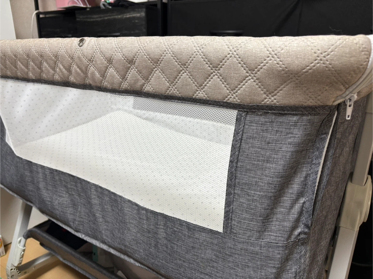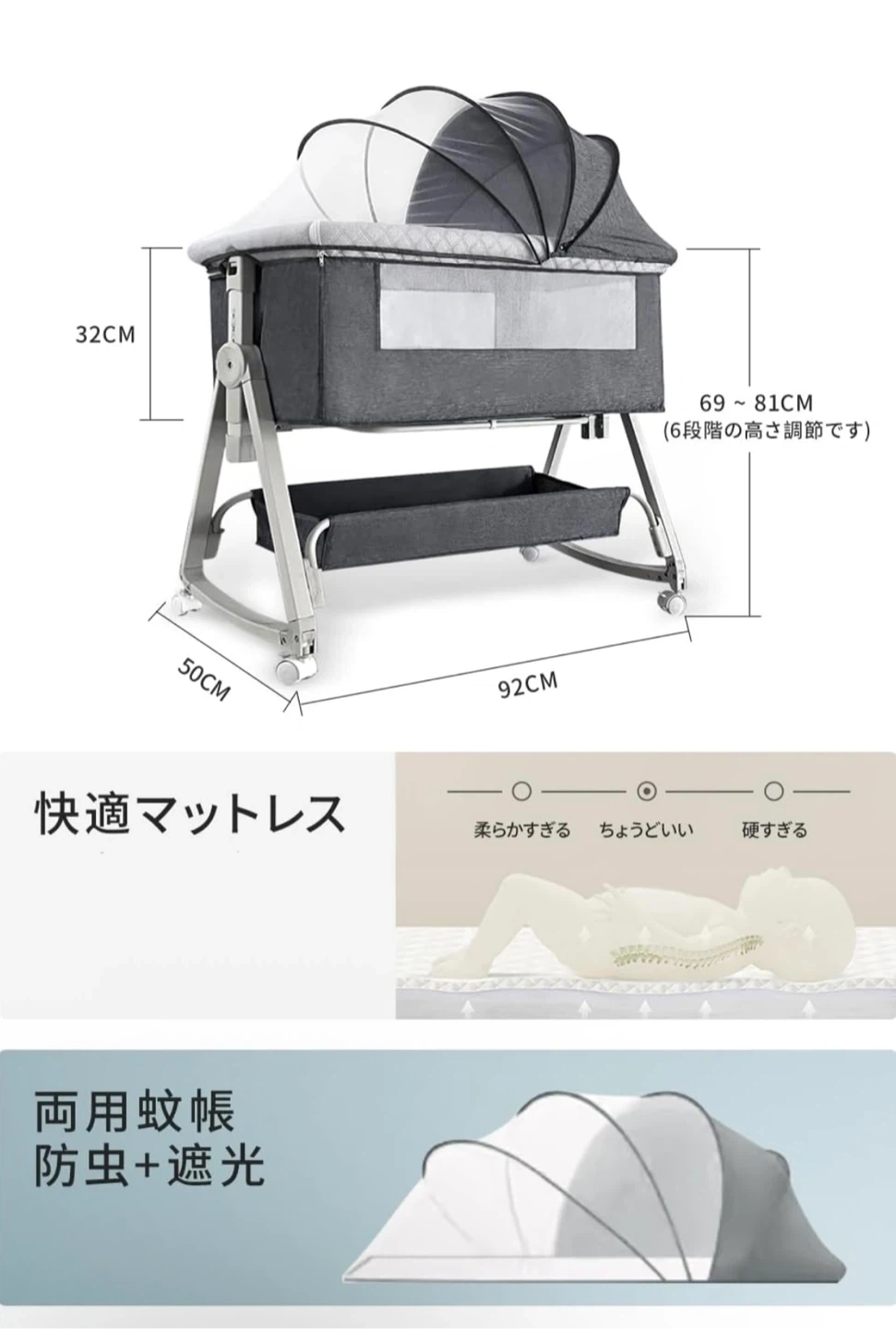 添い寝できるベビーベッドです。 ・高さ6段階調整可能 ・蚊帳付き(破れあり) ・マットレス付き ・サイズ:幅約92cm、奥行約50cm、高さ約69〜81cm ・Amazonで【Kino Linpo ベビーベッド 添い寝】と検索していただくとさらに詳細見れます 5月〜10月まで使用していました!大人ベッド購入につき高さが合わなかったため出品します🍀*゜ 常に防水シート・敷パットをして使用していたため全体的に美品です☺️ 乗ったりは一度もありませんが、同部屋に猫が出入りしていたため神経質な方はお控えください🙇‍♂️ お渡しは持ち運びバッグに入れてお渡し。 蚊帳は写真の通り部品が飛び出していますが、押し込めば使用可能です。 度々飛び出してくるので縫うのが手っ取り早いかもしれません! 使用していた90×60の防水パッド、敷きパッドもお渡し可能ですがこちらは使用感ありますので必要な方のみお付けします! モラージュ柏、ららぽーと柏の葉近辺でお渡し可能