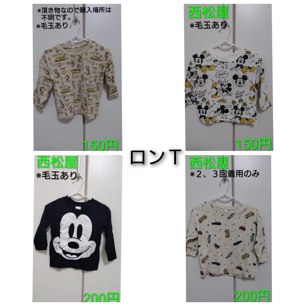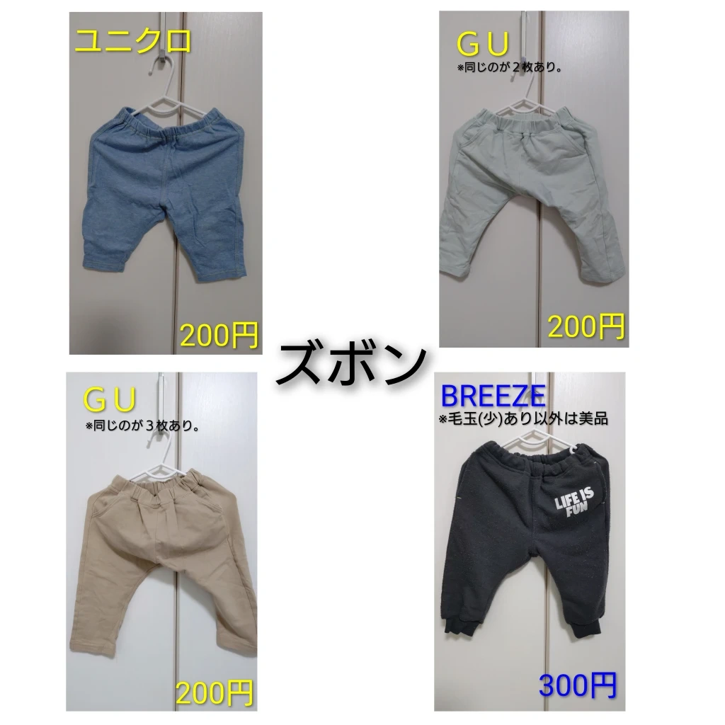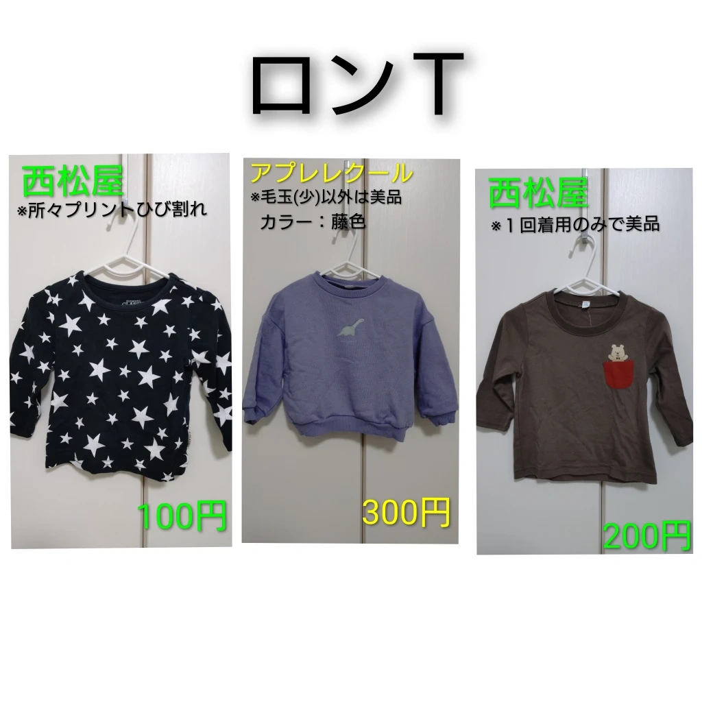 購入店舗:西松屋、BREEZE、ユニクロ等 素 材:綿やポリエステル(裏起毛は出品していません。) *スリーパー(1枚目の右)、100サイズですが、80のぽっちゃりの息子で少し余裕があるくらいです。 *着用モデル* 息子 80cm/12kg ※同じようなサイズのお子様にはだいぶ小さいかもしれません。 *注意書き* ・ほぼ新品の服〜傷があるものまで幅広く置いています。 ・中古品であることをご了承ください。 ・1点購入〜まとめ売り可能。 ・引き取り時に見ていただいての購入も可能。 *引き取り場所* 和田町駅もしくは他駅 他サイトでも出品しています🌻 気軽にお問い合わせ下さい😊