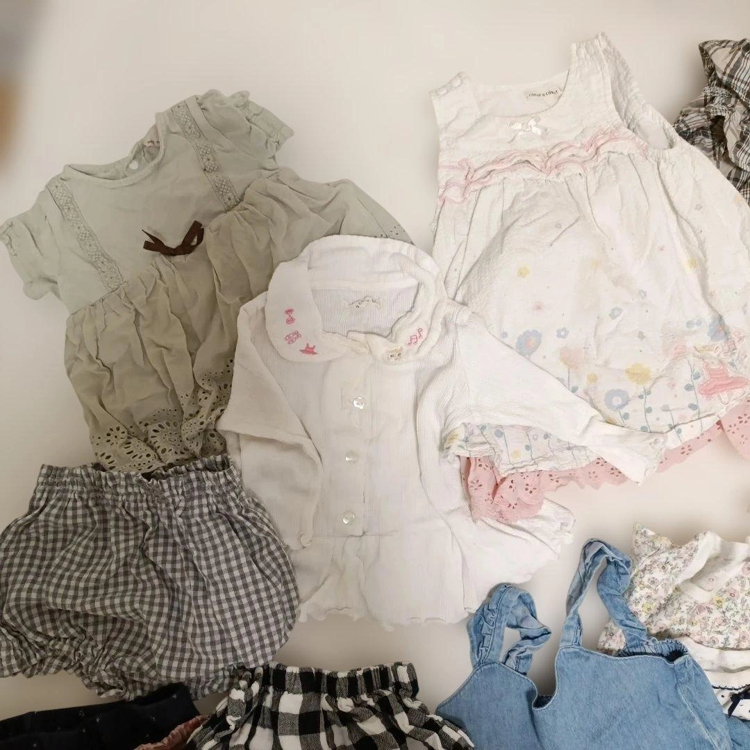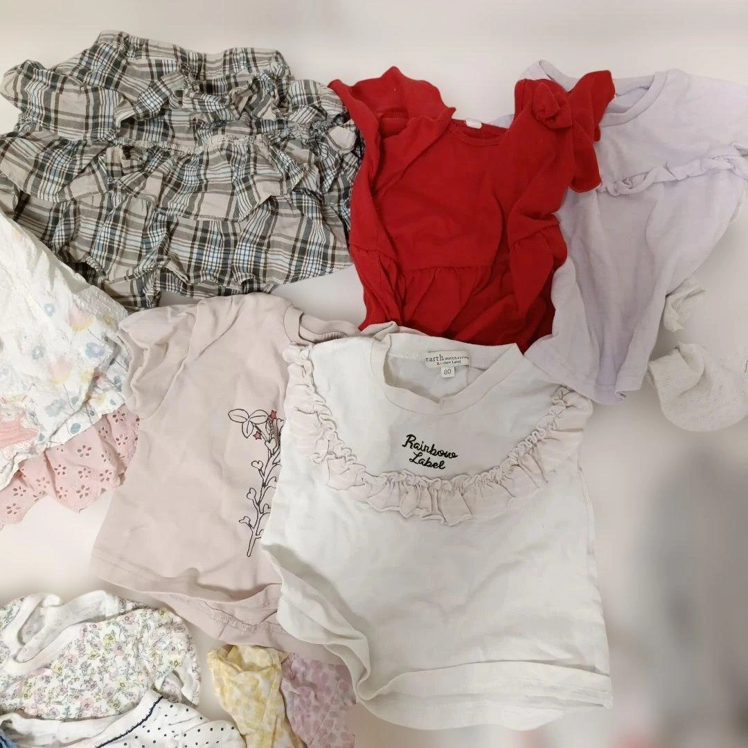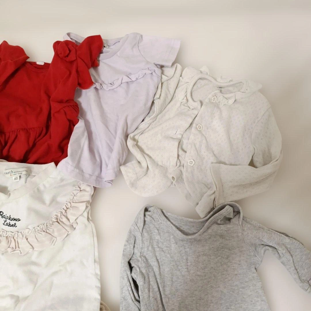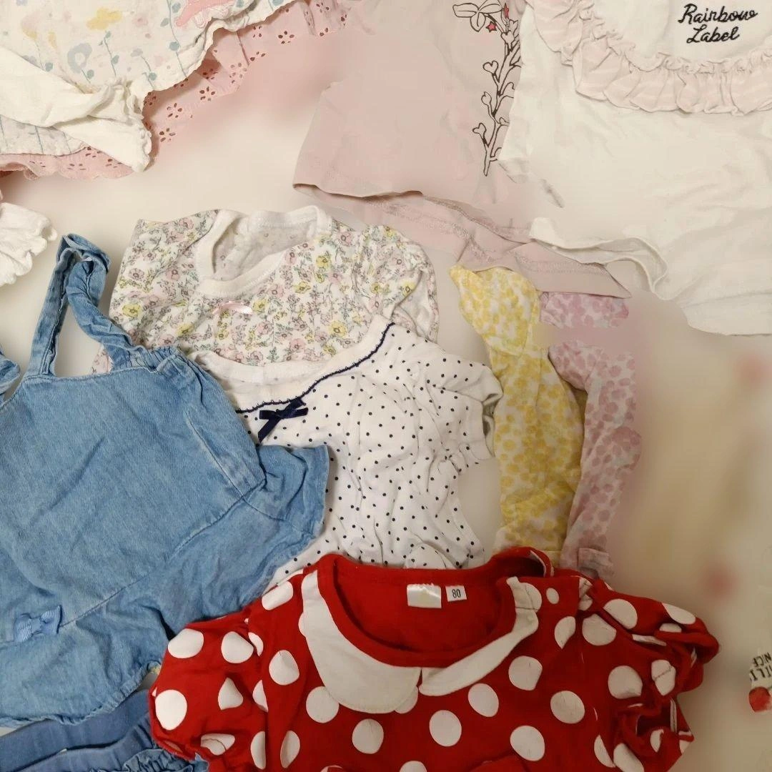 80センチのお洋服をまとめました。 いくつか染みが見えたところはペンで指して撮影しておりますのでご確認お願いいたします。 ・二枚目の写真の4点がアプレレクールです。特にワンピースが可愛すぎて、お散歩中に通行人の方に沢山褒めていただきました。 ・チェックのフリルスカートはブランシェスのsサイズで90-100センチ相当?らしいのですがゴムが太くキツイといわれ一度しか着てくれなかったので丈は長いかもしれませんが、こちらにいれております。 ・半袖、長袖ロンパースも入れております。 ・ミニーちゃんのデザインはディズニーにぴったりでした!少しプリントが割れています。 多様なデザインのベビー用トップスセット、フリルやチェック柄が特徴。 バラ売りは1枚400円、2点目600円、3点目800円、5点1000円で承ります。その際は少しお時間ください。m(_ _)m ご覧いただきありがとうございます。