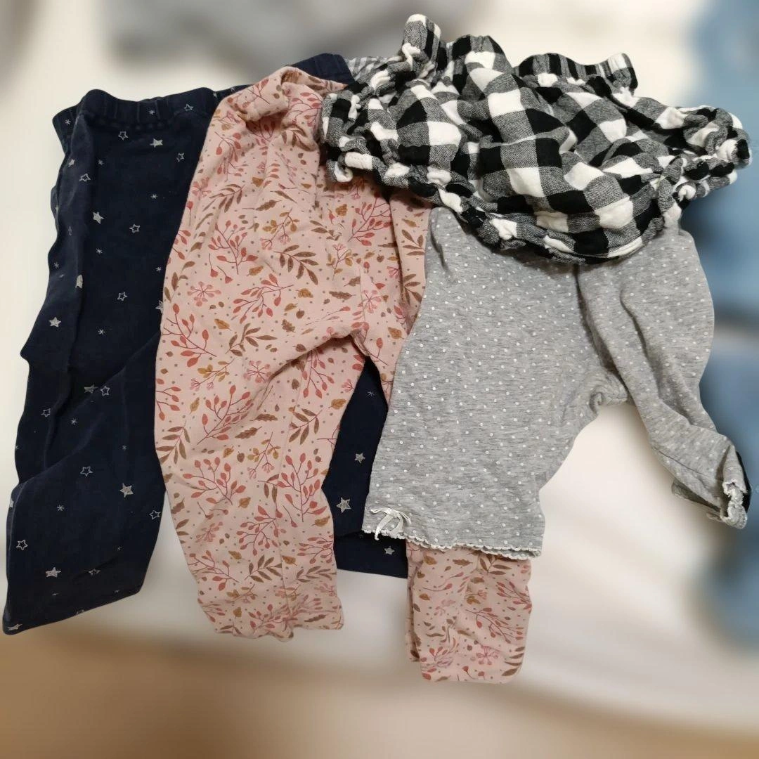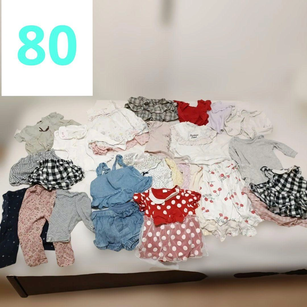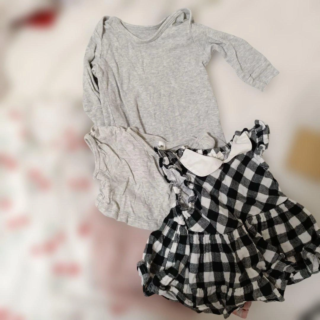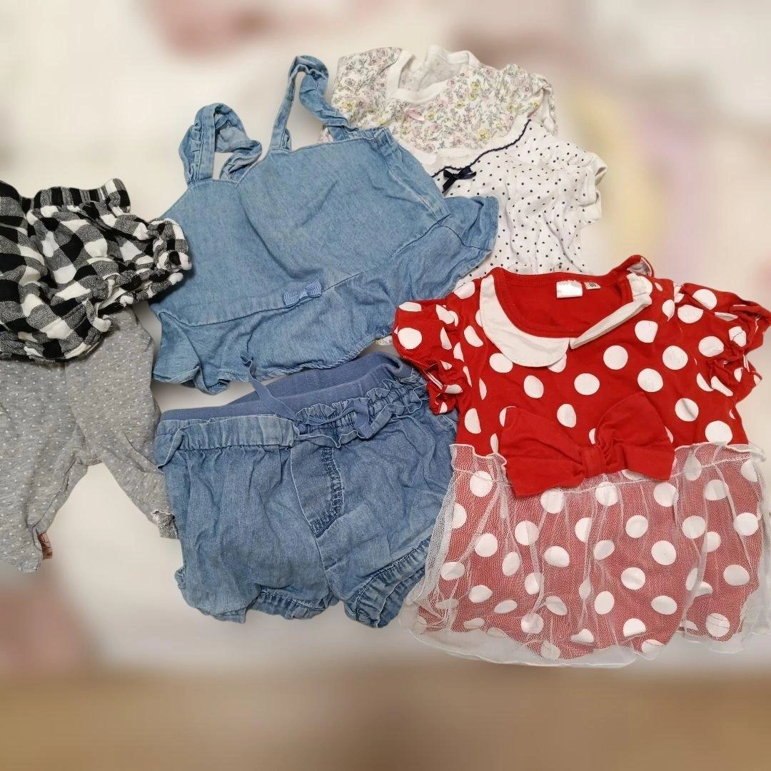 80センチのお洋服をまとめました。 いくつか染みが見えたところはペンで指して撮影しておりますのでご確認お願いいたします。 ・二枚目の写真の4点がアプレレクールです。特にワンピースが可愛すぎて、お散歩中に通行人の方に沢山褒めていただきました。 ・チェックのフリルスカートはブランシェスのsサイズで90-100センチ相当?らしいのですがゴムが太くキツイといわれ一度しか着てくれなかったので丈は長いかもしれませんが、こちらにいれております。 ・半袖、長袖ロンパースも入れております。 ・ミニーちゃんのデザインはディズニーにぴったりでした!少しプリントが割れています。 多様なデザインのベビー用トップスセット、フリルやチェック柄が特徴。 バラ売りは1枚400円、2点目600円、3点目800円、5点1000円で承ります。その際は少しお時間ください。m(_ _)m ご覧いただきありがとうございます。