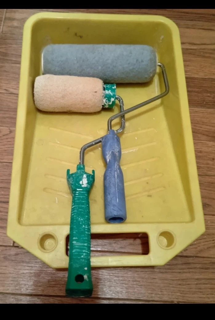 そんなに遠くなければ指定場所までバイクでお届け可能です (ご相談ください) ★ペイントローラー2個 (長さ18cmと10cm)ローラーは綺麗に洗浄しています。 ★手が汚れな いように新品ゴム手袋2個お付けいたします ★ローラー用トレイ 黄色 (長さ32cm.横幅22cm) ★使用感あり ローラー部は破損もなく確りと洗浄しています (使用には問題ありません) ★壁や家具などの塗装やDIYにローラー2個セットで ※中古品であることをご了承ください。