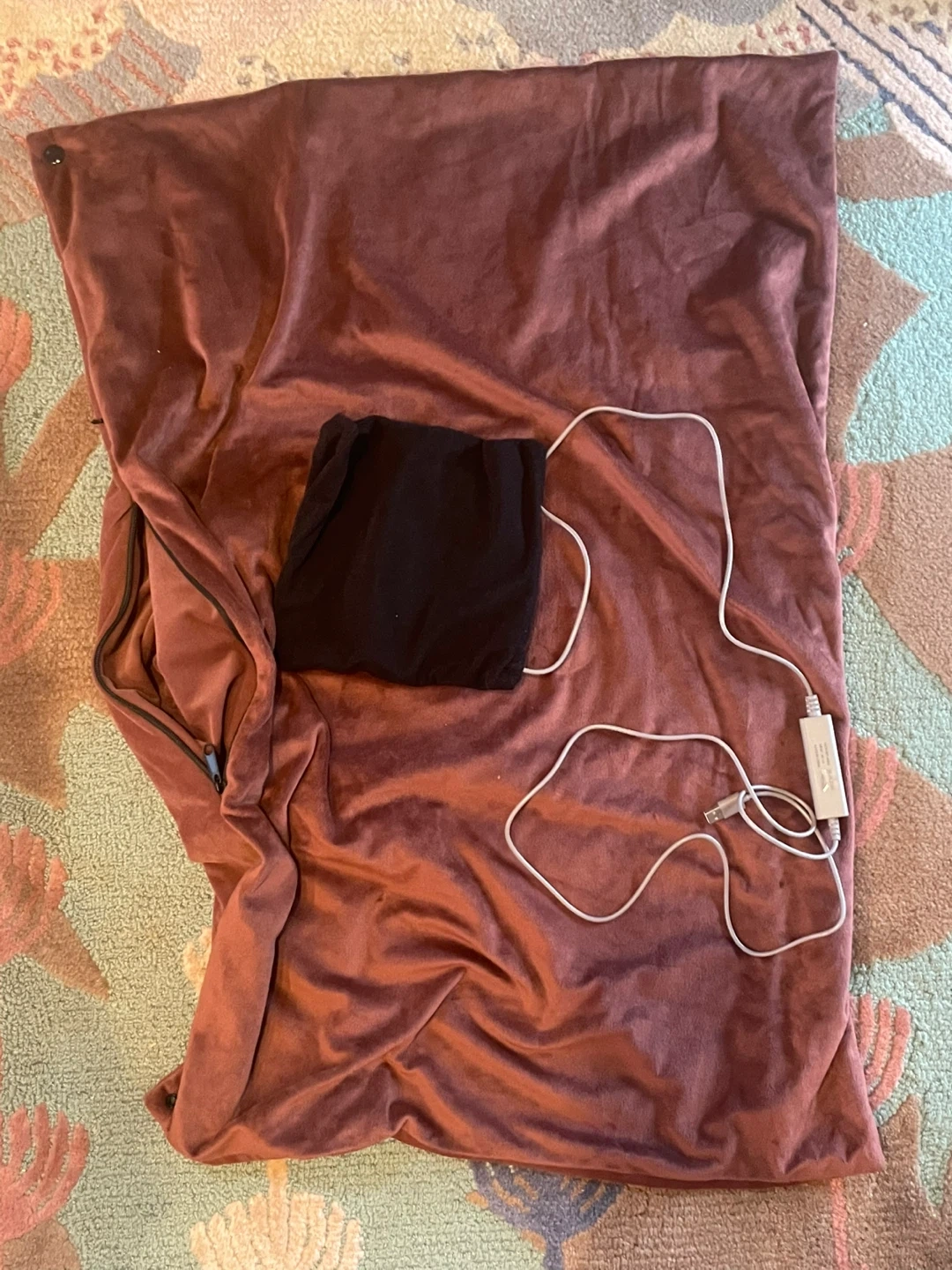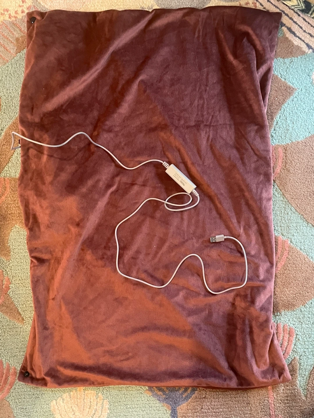 USB式ホットブランケットです。 ・カラー:ブラウン/ビロードの様ななめらかな      生地です。 ・USB給電式/全体が温かくなるのではなく、2   枚目の写真の黒い面積部分が温まります。   例えば、この部分を首の後ろに当てて、身   体をくるんだり、肩にかけたり、椅子の上   に乗せて、お尻の下に敷いて膝掛けにした   り、寝る時に首の下から肩に掛けるなど、   使い方は色々です。  ・サイズ:全体60✖️85cm       黒色部分22✖️22cm お受け渡しは、千歳烏山駅西口改札ほか、粕谷図書館、千歳船橋駅、芦花公園駅、祖師谷大蔵駅、三軒茶屋駅(夕方6時前後など、限定的)など、あります。