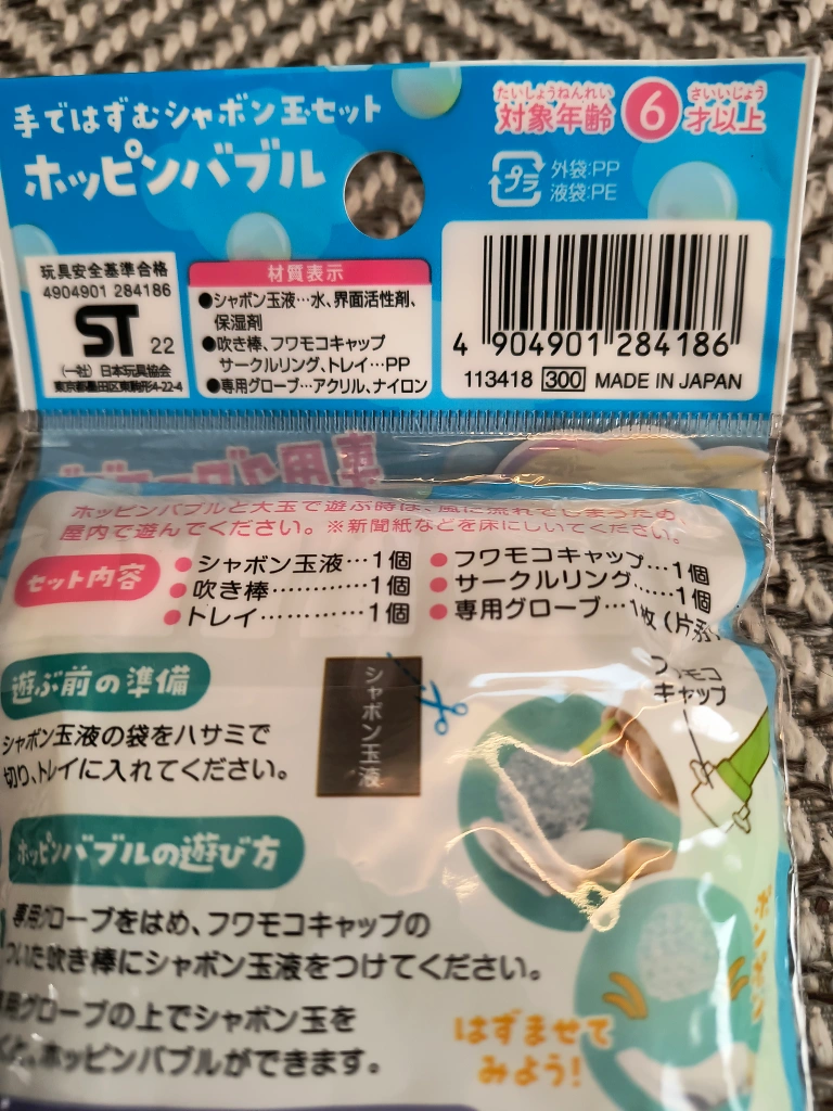 シャボン玉セットです。 ・シャボン玉液、吹き棒、フワモコキャップ、サークルリング、トレイ、専用グローブのセット ・対象年齢6歳以上 ・MADE IN JAPAN 中古品であることをご了承ください。