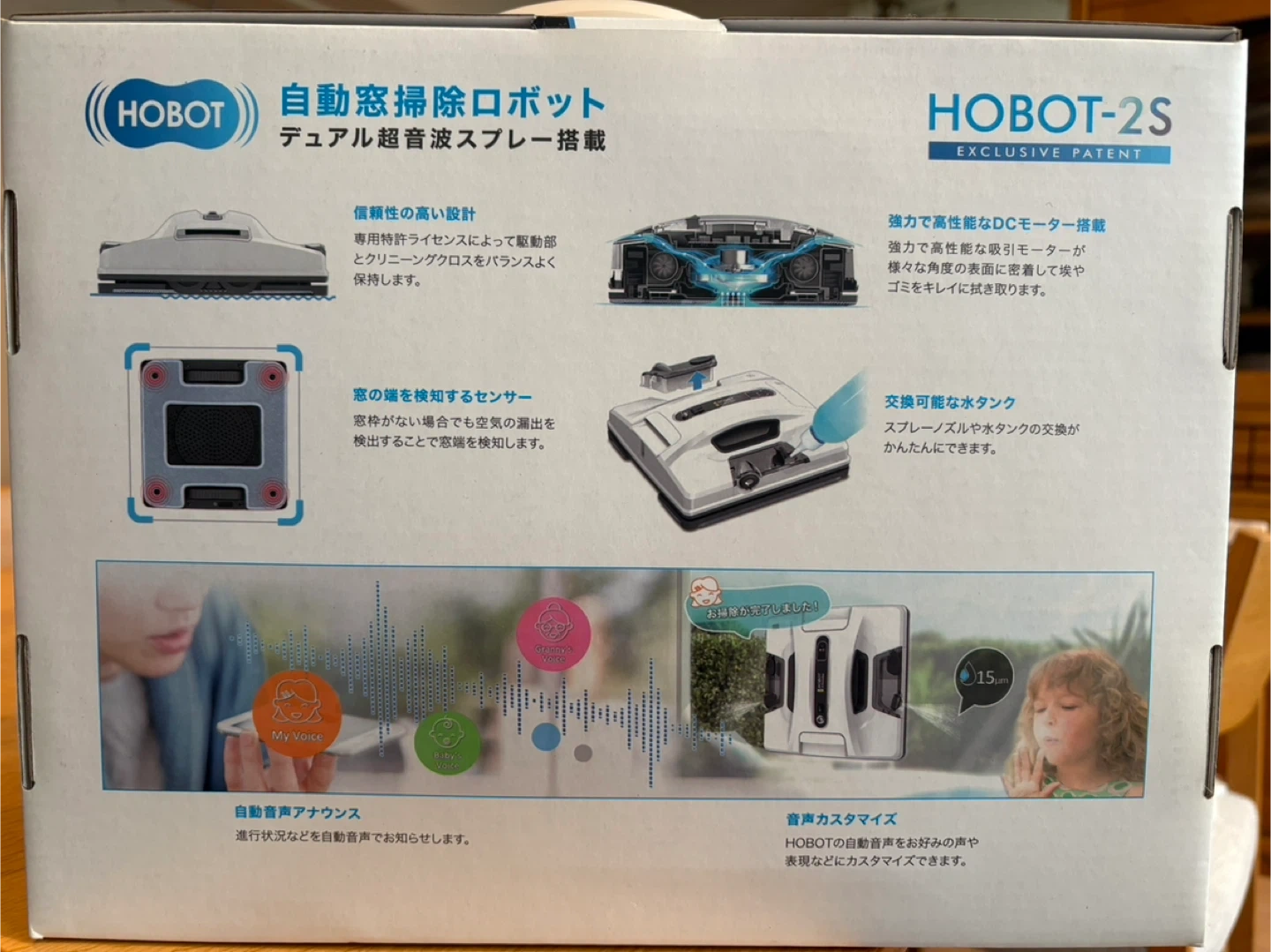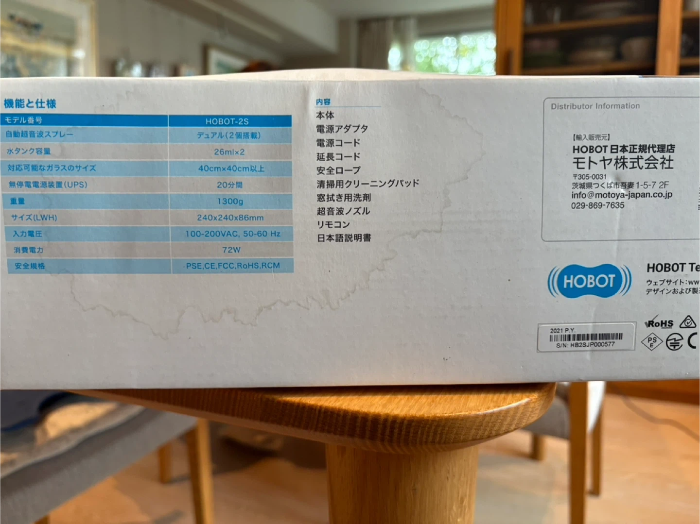 ホボットの窓掃除ロボットです。 【情報】 ブランド:ホボット(HOBOT) 型番:HOBOT-2S 【仕様】 水タンク容量:26mlx2 対応可能なガラスのサイズ:40cmx40cm以上 無停電電源装置(UPS):20分 重量:1300g サイズ:240x240x86mm 入力電圧:100-200VAC,50-60Hz 消費電力:72W 【付属品】 本体、電源アダプタ、電源コード、延長コード、安全ロープ、清掃用クリーニングパッド、窓拭き用洗剤、超音波ノズル、リモコン、日本語説明書 2回ほど使用しました、中古品であることをご了承ください。