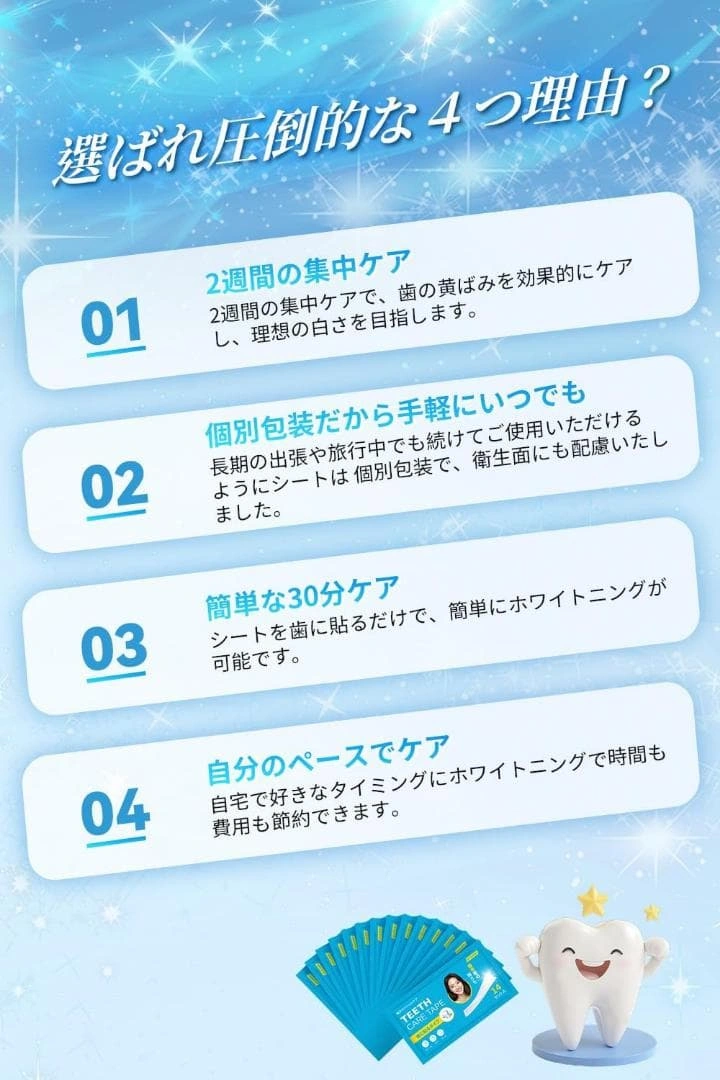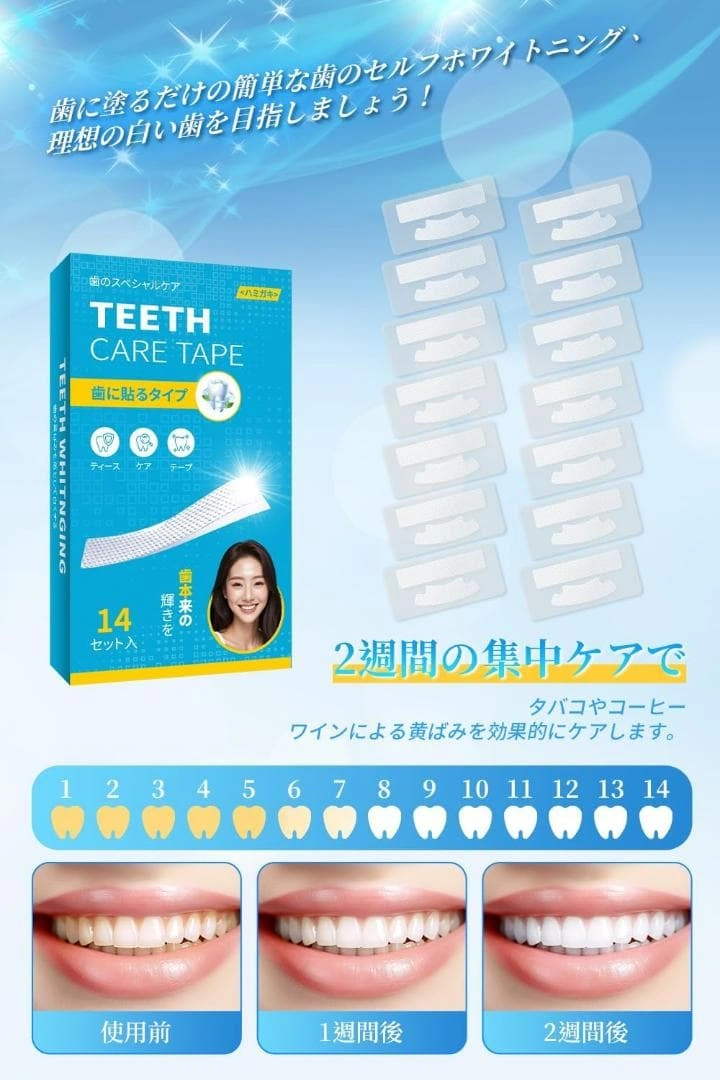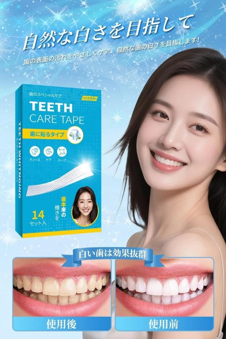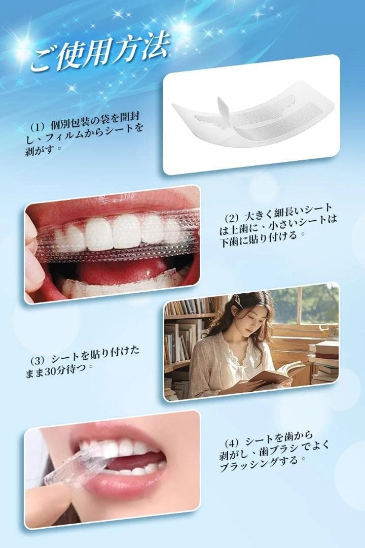 歯専用ホワイトニングシートで、歯の表面の汚れをやさしくケアします。貼りやすいシートで、歯にしっかりと密着させられます。 【2週間の集中ケア】 歯に30分貼るだけで、歯の表面の汚れを効果的に除去し、口内を清潔に保つことを目的としています!歯を2週間集中ケアできます。 【衛生的携帯しやすい】 内容量:14セット/28枚入(上歯用+下歯用)個別包装。 【無添加設計】 タバコ、コーヒー、ワインなどによる歯の黄ばみが気になる方に。無添加設計で歯に優しいケアを実現します。 【簡単な使用方法】 ご使用前はブラッシングを行い、口腔内を清潔にしてご使用ください。 ① 個別包装の袋を開封し、フィルムからシートを剥がします。 ② 大きく細長いシートは上歯に、小さいシートは下歯に貼り付けます。 ③シートを貼り付けたまま30分待ちます。 ④シートを歯から剥がし、歯ブラシでよくブラッシングします。 ご希望の方はお気軽にご連絡ください。