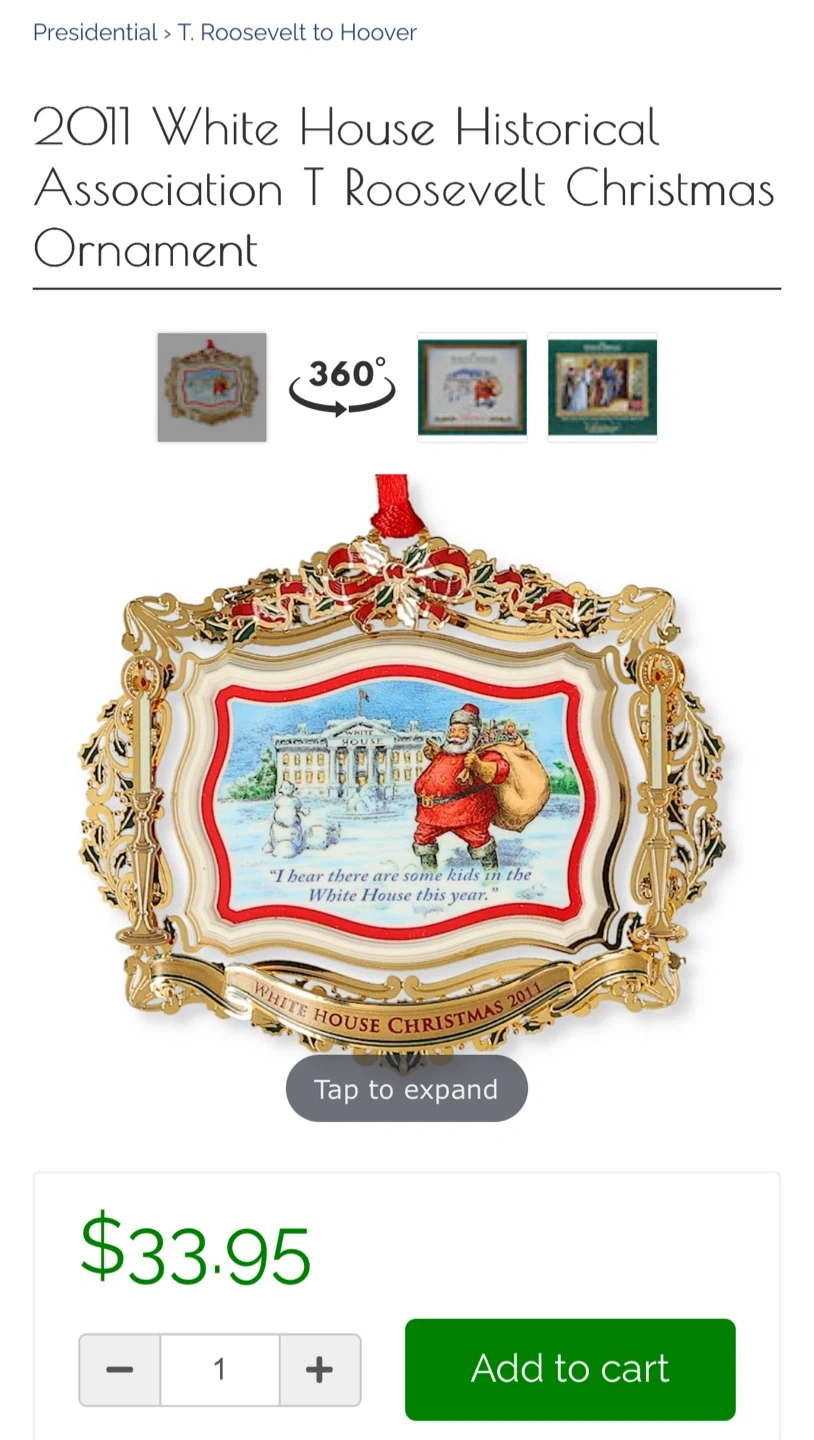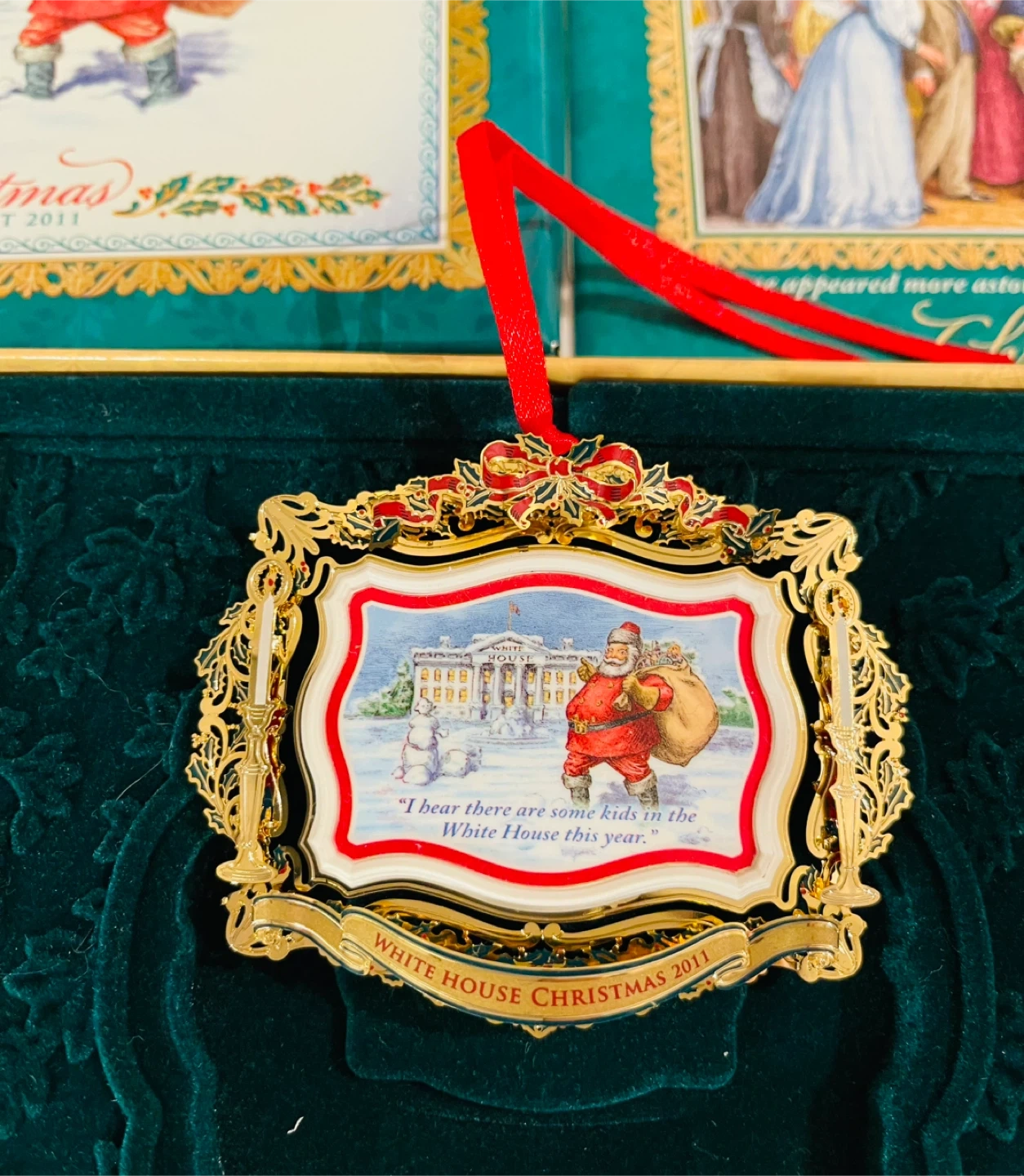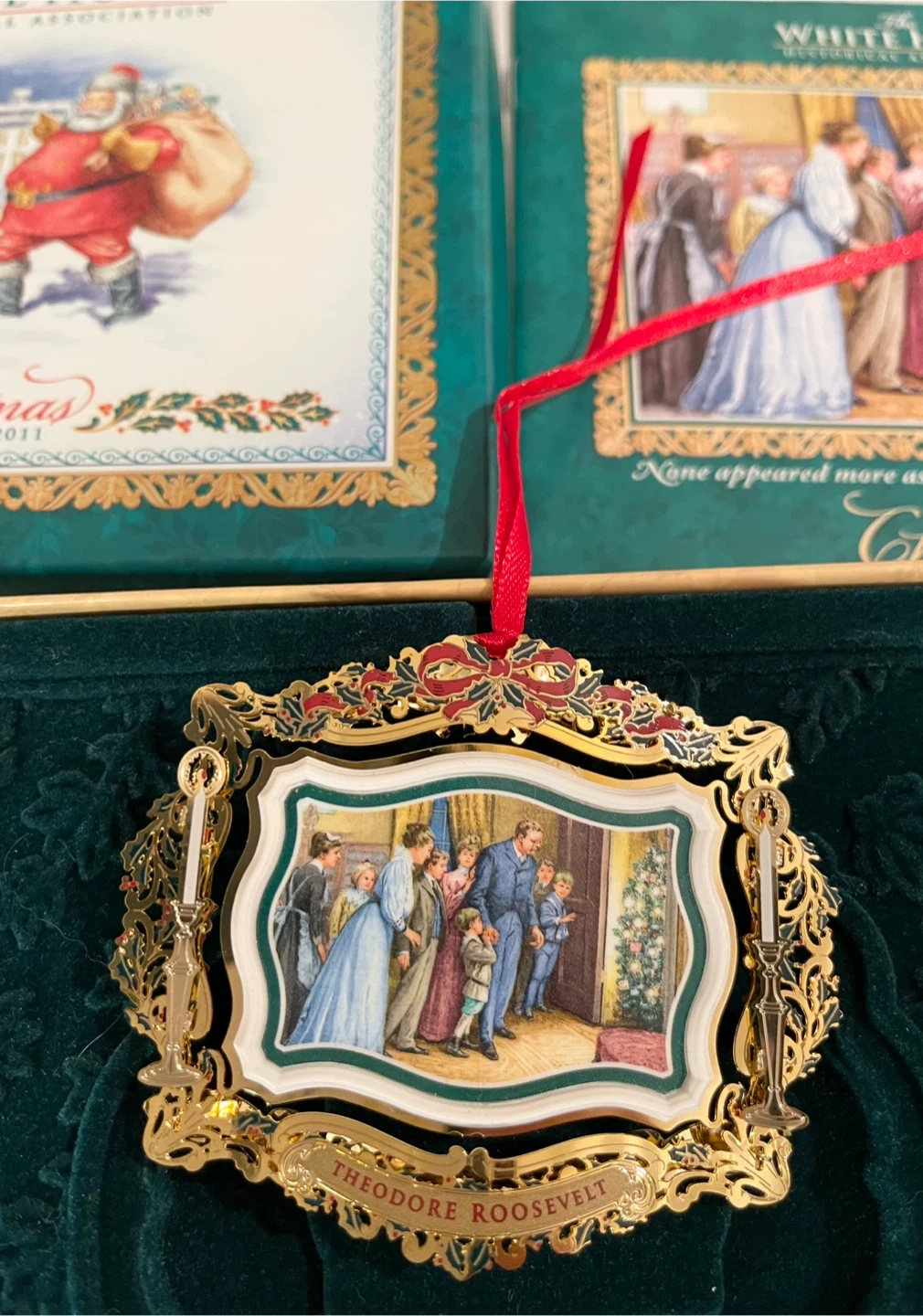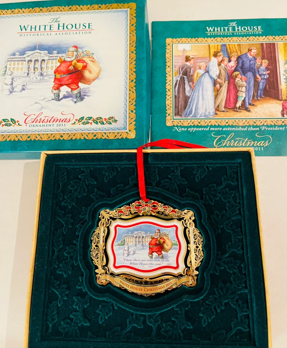 ホワイトハウスのクリスマスオーナメントです。 ⭐︎まとめてお値引きも致します⭐︎ ・ブランド:ホワイトハウス ・年式:2011年 ・状態:新品 美品 ・付属品:箱付き このオーナメントは、第26代アメリカ合衆国大統領であるセオドア・ルーズベルト政権を称えるものです。 ホワイトハウス歴史協会によって作成された公式なオーナメントです。 「サンタがホワイトハウスを訪れる」様子が描かれています。 中古品であることご了承ください。