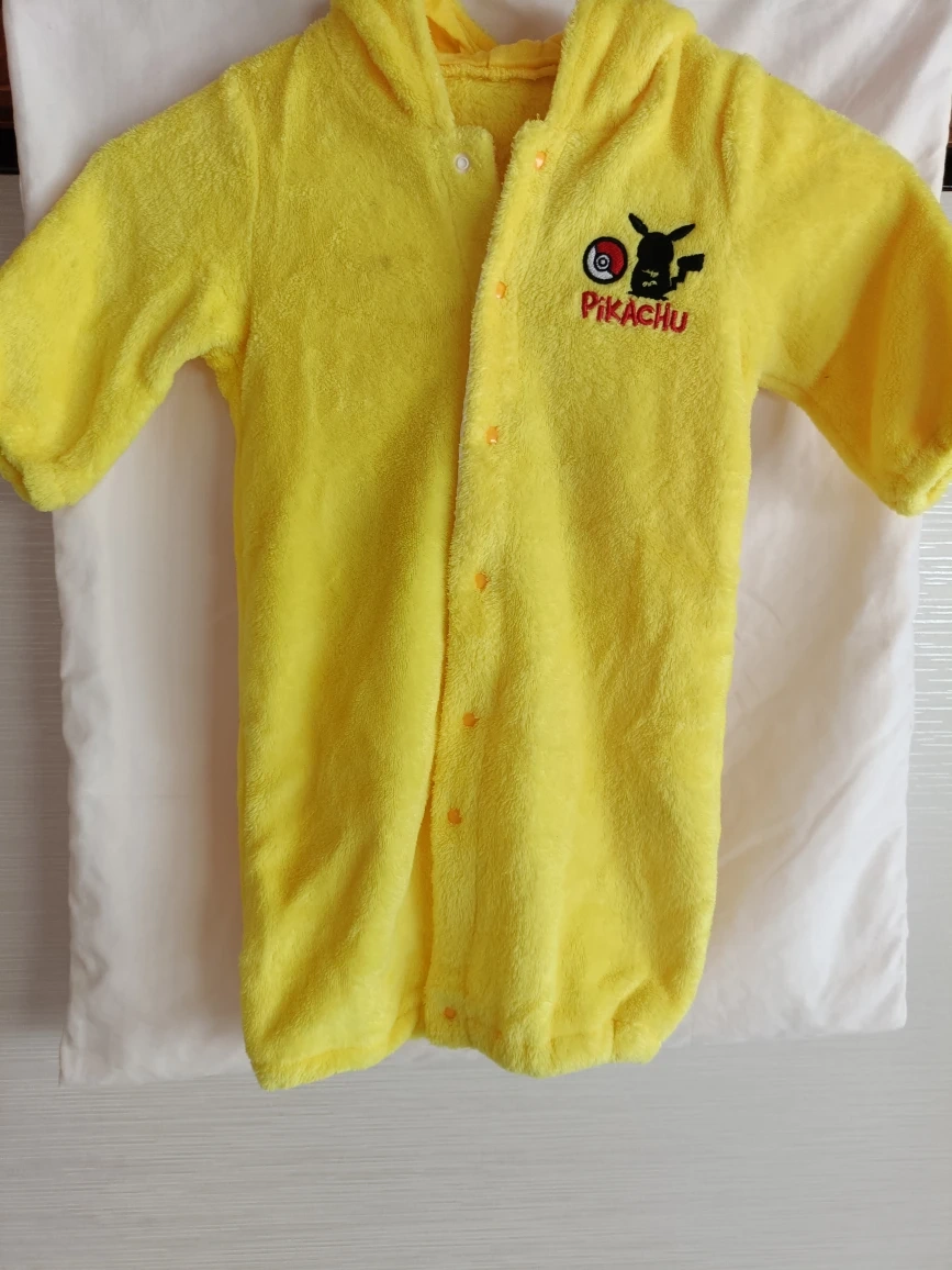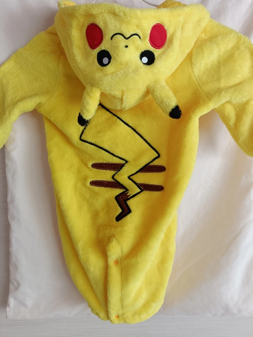 ポケモンのピカチュウのロンパースです。 ・サイズ:50-70 ・素材:ポリエステル100%、フード裏地 綿100% ・色:黄色 ・状態:使用感は少ない ご不明点があればお気軽にお尋ねください。