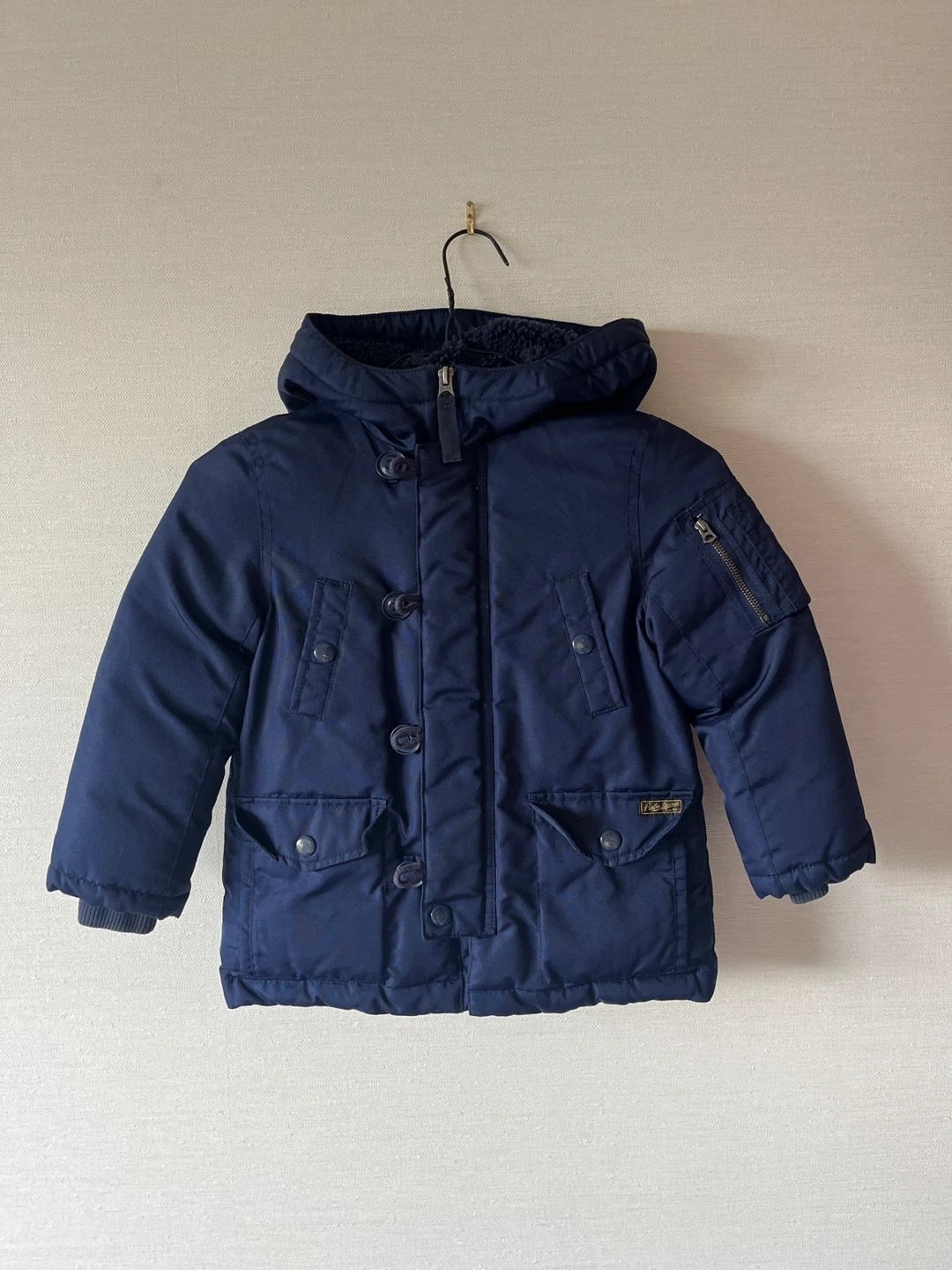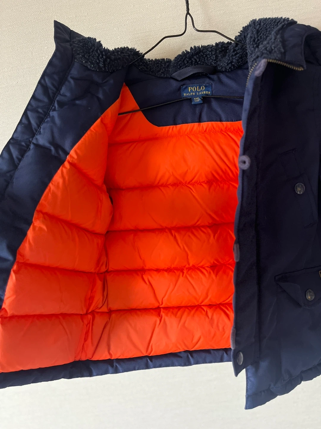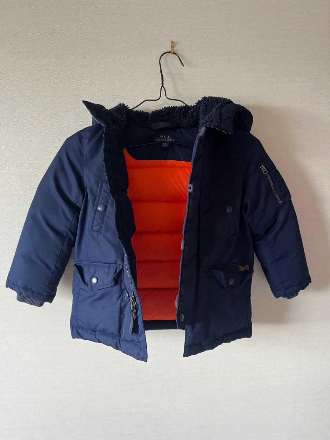 ポロ ラルフローレンの子供用アウターです ・ブランド:ポロ ラルフローレン ・サイズ:4/4T ・カラー:ネイビー、裏地はオレンジ ・フード取り外し不可 ・使用感少なめ ※一点だけ、ボタンに傷があります。じっくり見ると見えますが、着ているとあまり目立ちません。 中古品であることご了承ください。