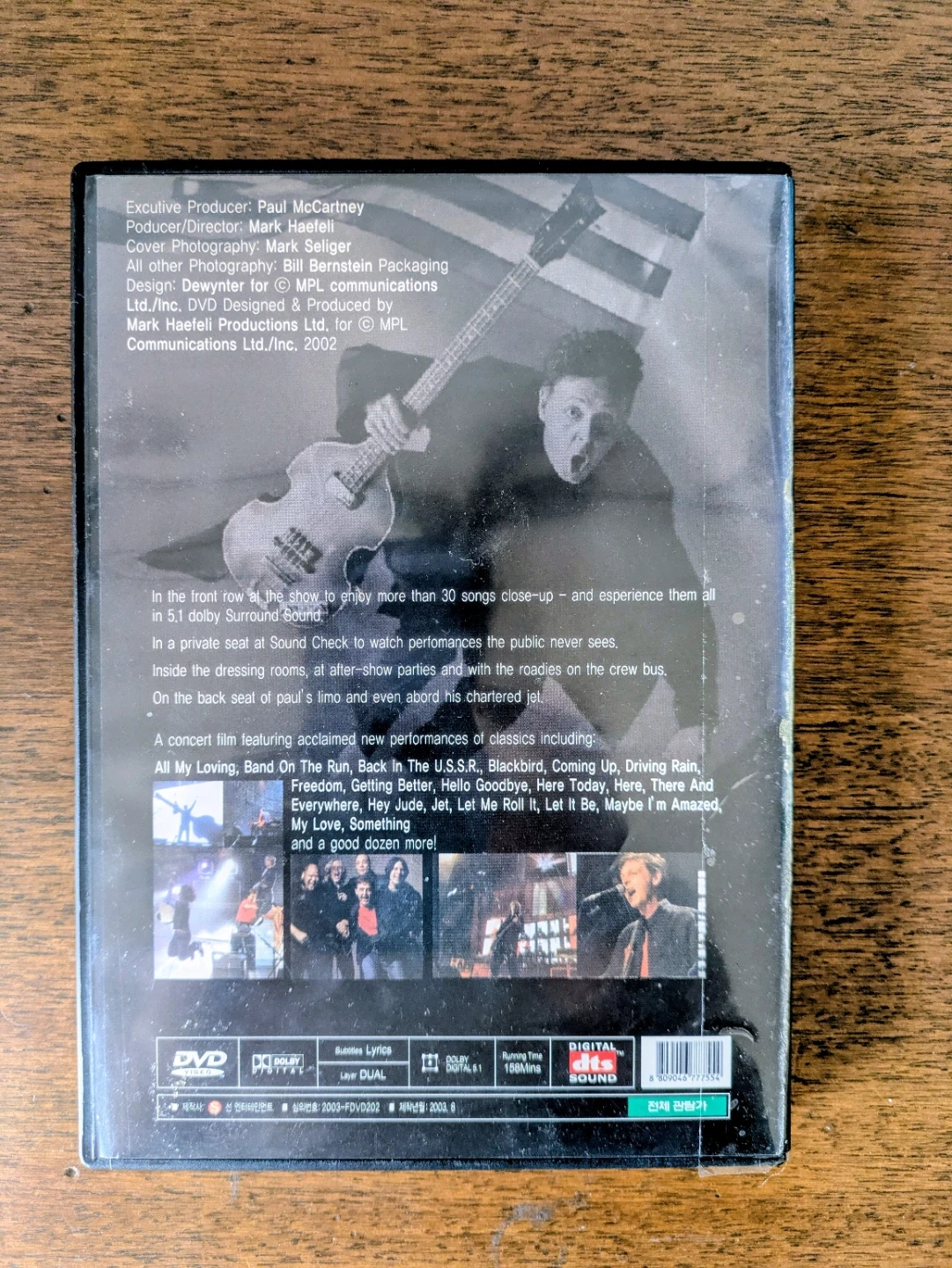 ポールマッカートニーのコンサート映像を集めたDVD(輸入盤)です。 韓国製なので字幕が韓国語です。 ライブ映像は英語です。 【情報】 アーティスト:ポールマッカートニー 商品:コンサートDVD 【状態】 ケースのビニールの補修をしてあります 中古品であることご了承ください