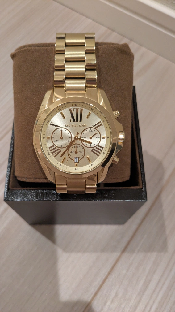 マイケルコースの腕時計です。 ■カラー:ゴールド ■ブランド:マイケルコース ■箱、説明書あり ★ムーブメント:クオーツ(電池式) ★材質:ステンレス 数年前に購入して1度のみ使用しました。 出品者には手首にボリュームがあり過ぎたため出品します。 とてもお洒落な時計だと思います。 レディース/メンズ どちらでも使用可能なサイズ感です。 電池は切れているためご自身で交換して下さい。 中古品であることをご了承ください。