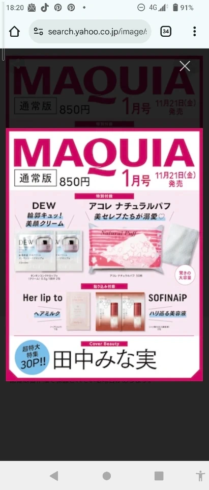 マキア 美容雑誌1月号です。 ・通常版:850円 ・発売日:11月21日(金) ・DEW 美顔クリーム ・アコレ ナチュラルパフ ・Her lip to ヘアミルク ・SOFINA iP ハリ巡る美容液