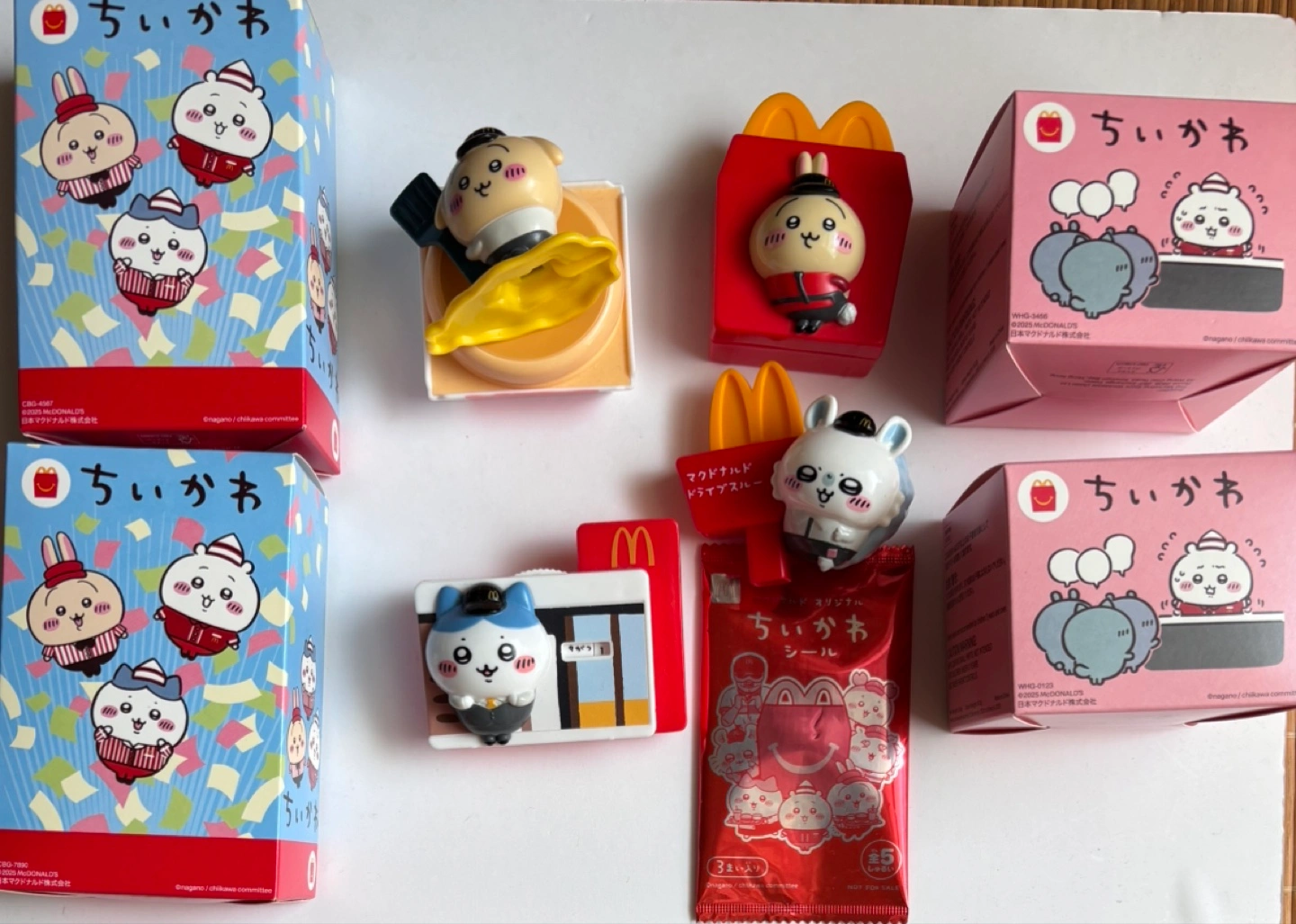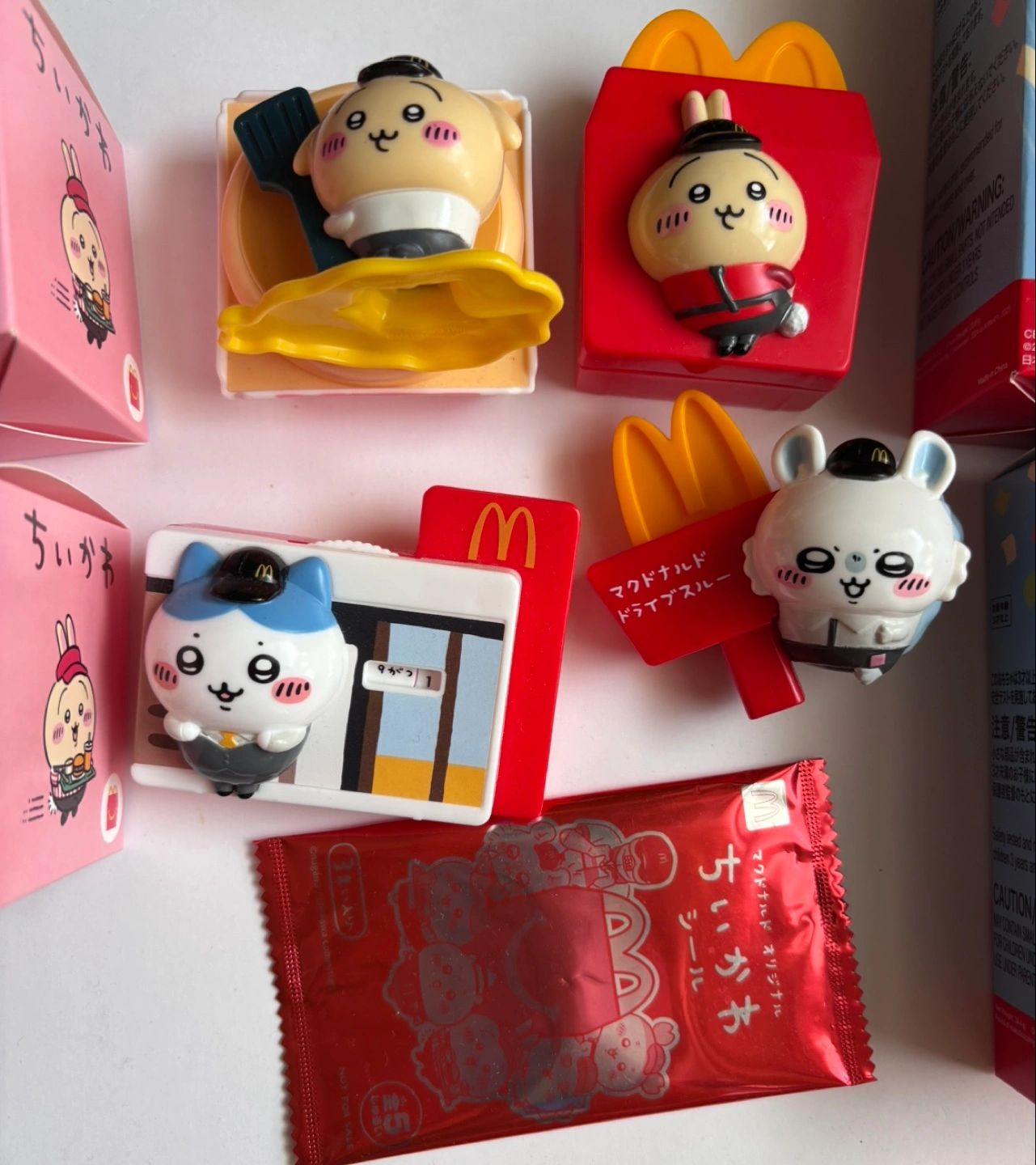 ちいかわ マクドナルドコラボ 2025年ハッピーセット4種類 +?年のちいかわ シール1種 +オマケで はらぺこあおむし1種 ・ ハチワレのマクドナルドカレンダー ・うさぎのプチパンケーキケース(ケース内にシール入ってます) ・うさぎのシールディスペンサー ・モモンガのポールサインえんぴつキャップ ・シールは1年くらい前のもの。 未開封のため、中身は分かりません。 ・はらぺこあおむし 【ふとっちょあおむし はっぱのボート】も付けます。袋開封しましたが、未使用です。 ちいかわ4種類は 箱から出して飾っていた時期があります。 シール未使用、付属品全てそろっています。 箱に入れてお渡しします。 お子さんなどにいかがでしょうか? よろしくお願いします。 ※受け渡しは、プロフィールに記載した近隣まで可能です。