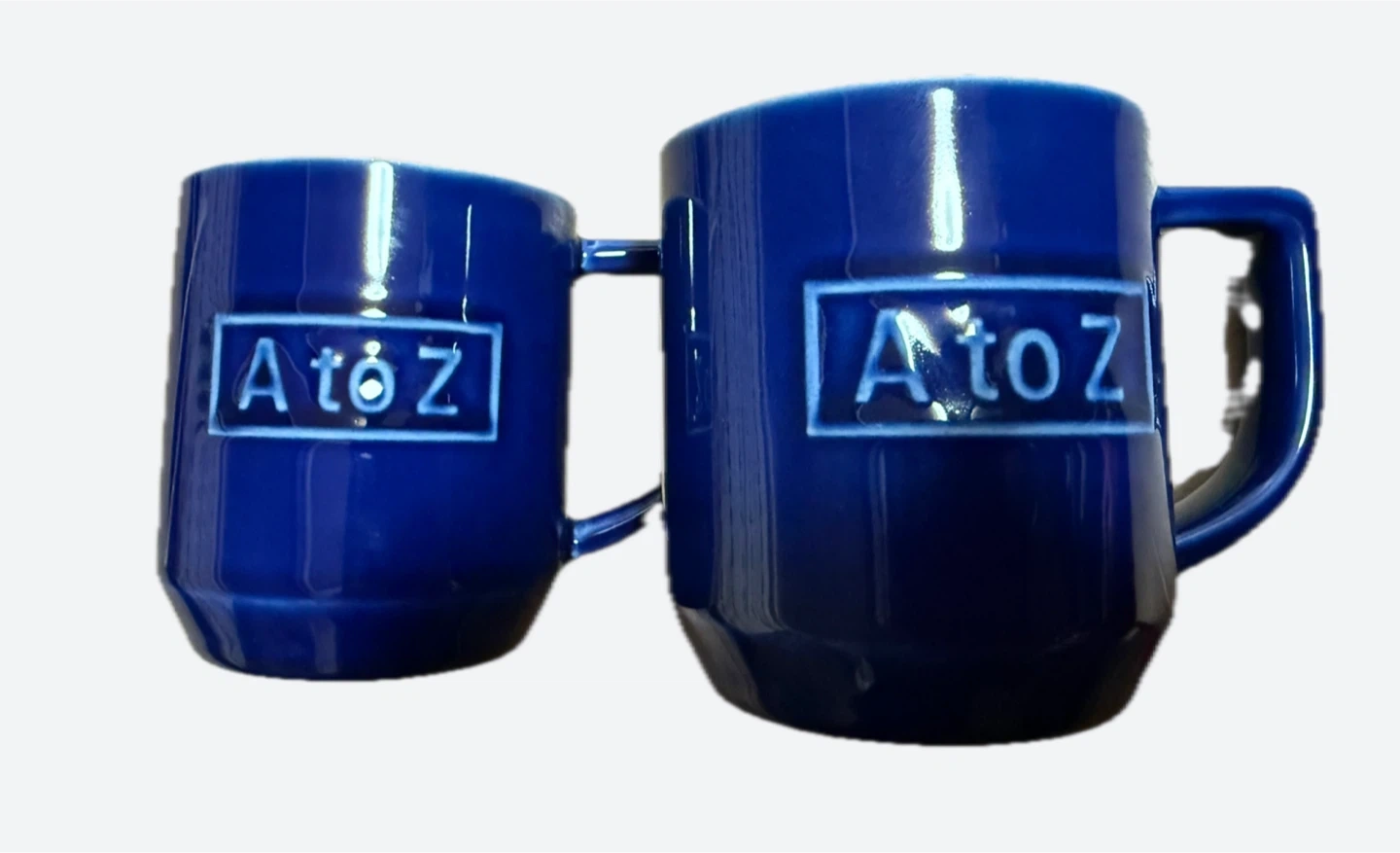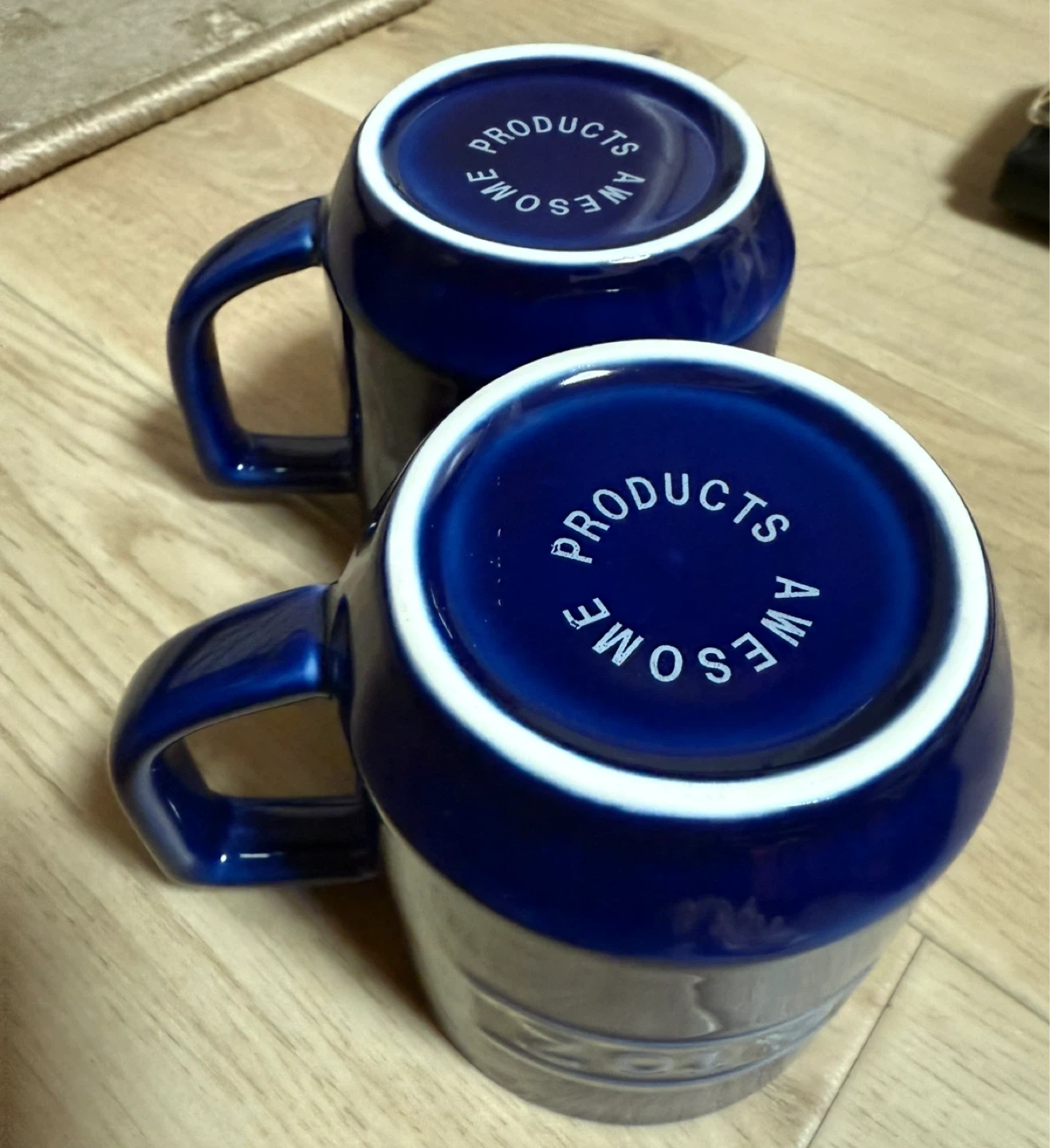 AWESOME STOREで購入しました A to Zのマークが入ったマグカップ2個セットです ・色:濃い青 ・「A to Z」と「AWESOME PRODUCTS」のロゴあり ・容量:200ml程度 使用感少なめ、目立った亀裂や破損はありませんが細かい傷が気になる方はご遠慮下さい