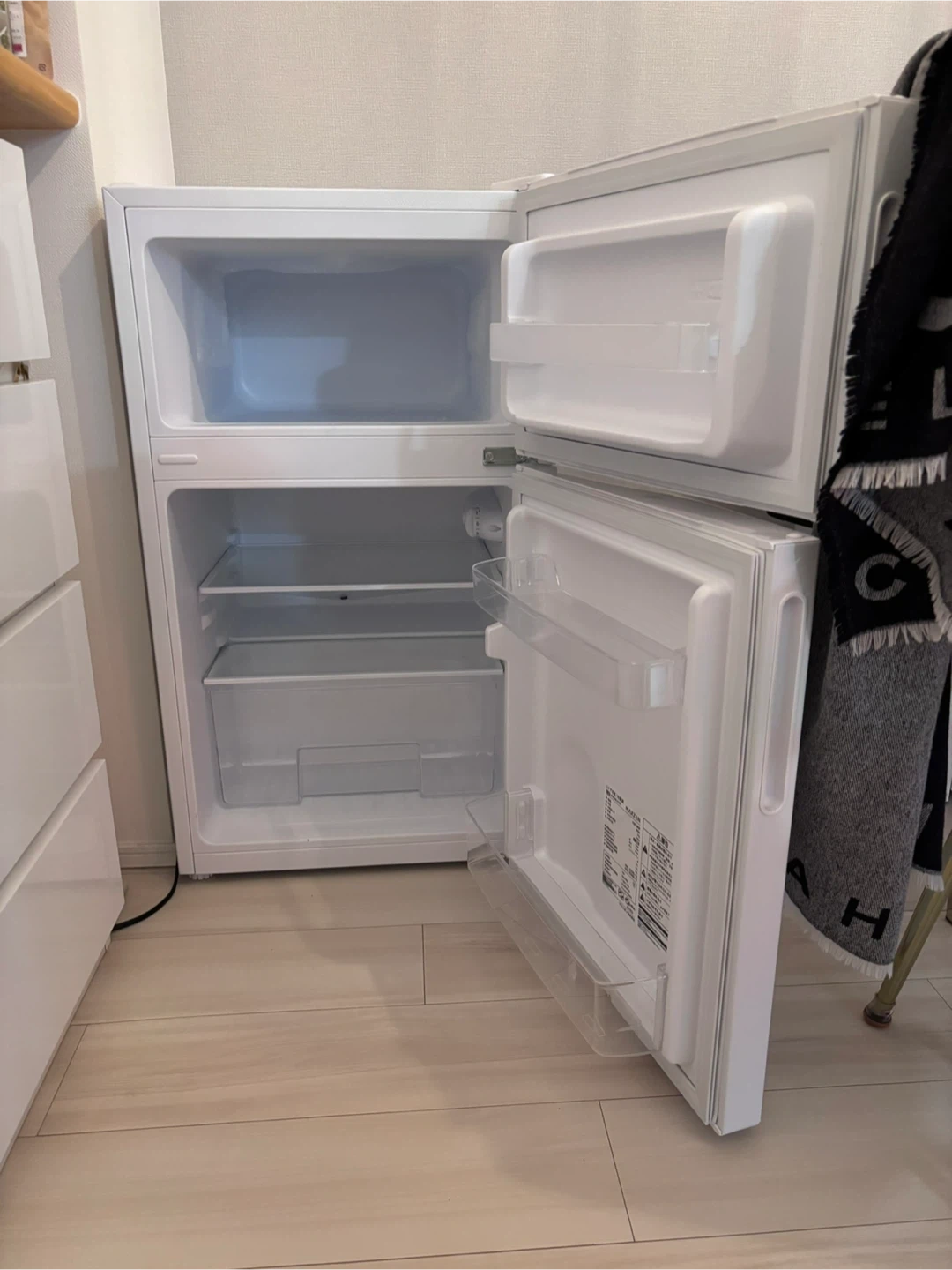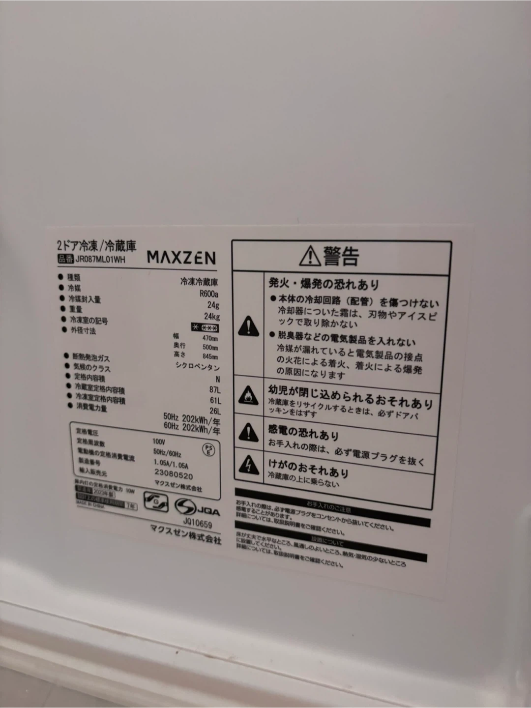 マックスゼンの2ドア冷蔵庫です。 【情報】 ブランド:マックスゼン 型番:JR087ML01WH 種類:2ドア冷凍/冷蔵庫 定格内容積:87L サイズ:幅500mm、奥行525mm、高さ845mm 【状態】 使用感少なめ ご不明点があればお気軽にお尋ねください。