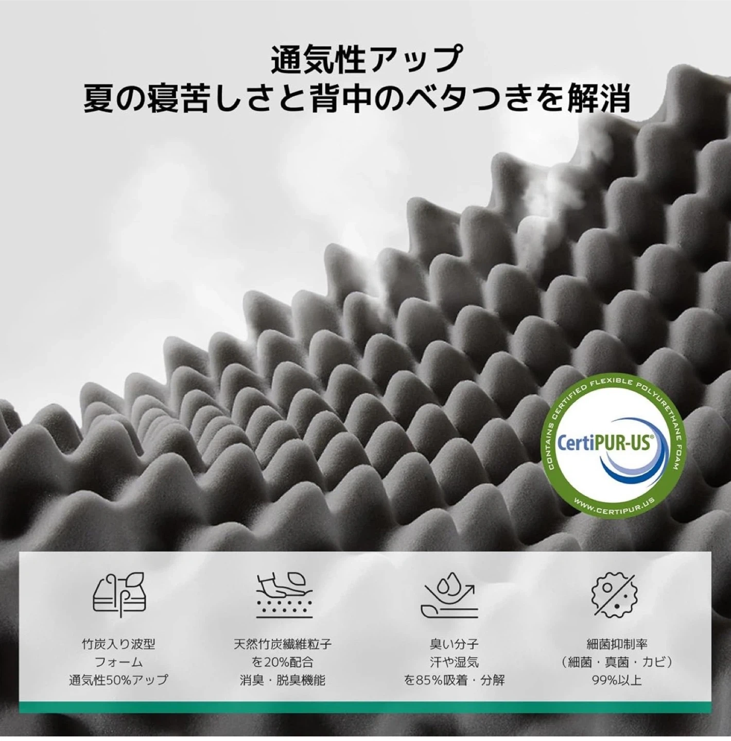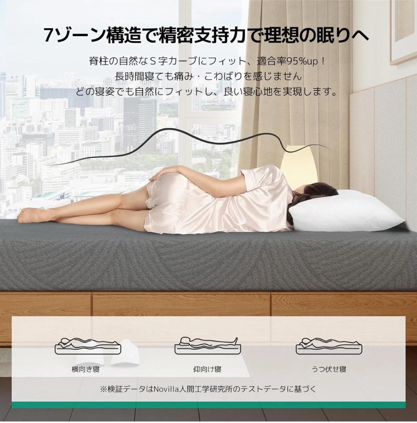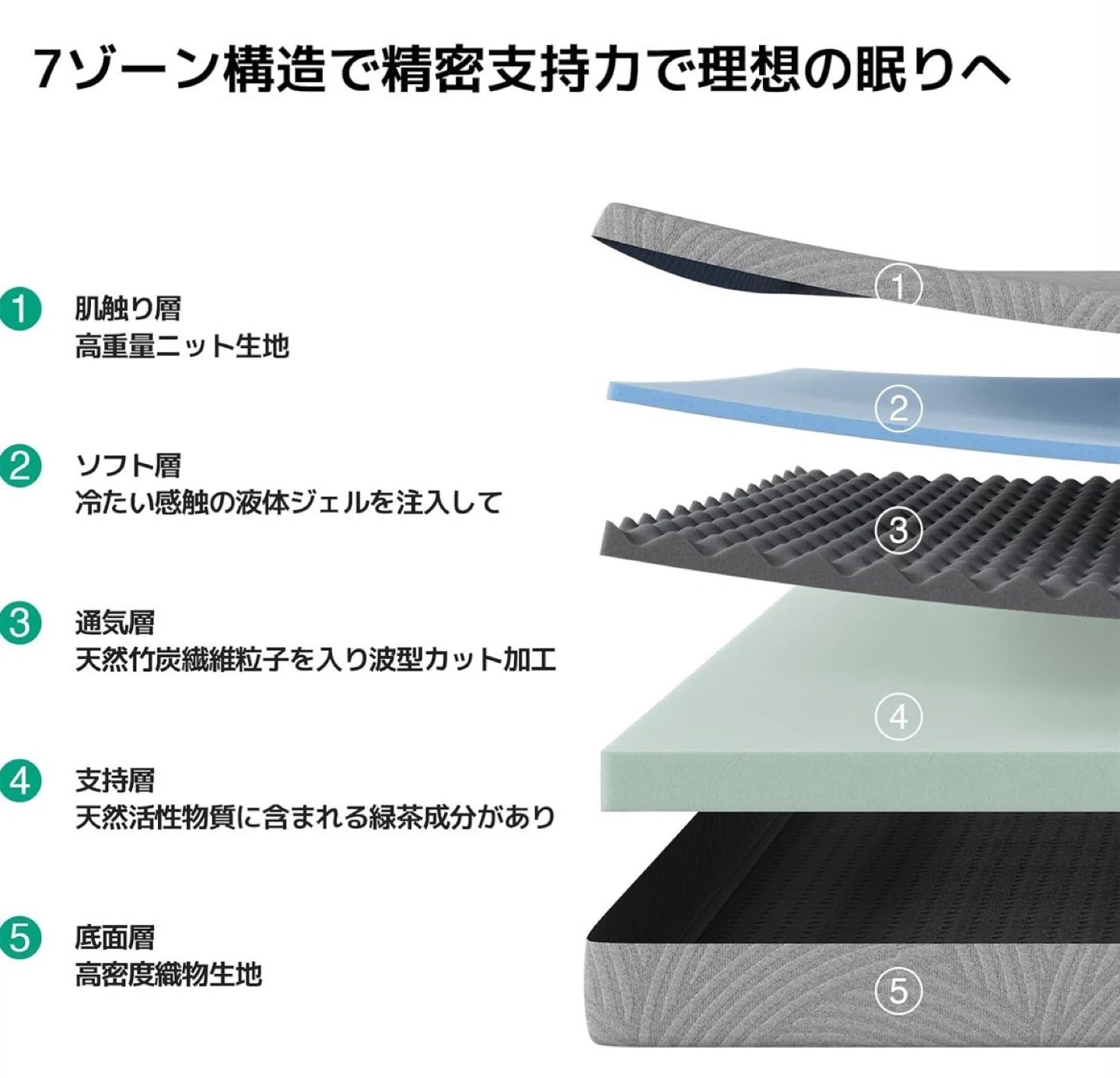 数ある中からご覧頂きありがとうございます(^○^) ◎✨️値下げ交渉◎✨️ ◎コメントなし、即購入大歓迎✧ ◎送料無料!安心の匿名配送 *。┈┈┈┈┈┈┈┈┈┈┈┈┈┈┈*。 ✨️\1品限り!!早い者勝ち!!/✨ ★商品説明★ Novilla最新作!表面は肌触りがよくて吸湿発散性に優れたニット生地です。丈夫で毛玉になりにくく、ほどよい弾力性のある生地が快適な眠りをお約束します。優れた通気性でムレ感を軽減し、高温多湿環境下でもサラリと快適、生地に敏感の方も気軽にご利用いただけます。高級感もあるグレーの見た目で汚れが目立ちにくく、ファスナー付きで簡単に脱着ができますので、簡単に洗濯することが可能です。 独自技術で体圧分散に優れた3層構造は軟すぎず、硬すぎず、整体の安定力を高めています。ソフト層には30D高密度のメモリーフォームに冷たい感触の液体ジェルを注入してあり、熱がこもりにくく、沈み込みが少ないため寝返りがしやすいです。体の疲れを緩和してくれ、睡眠の多幸感を与えます。 波型フォーム層の凹凸部は優れた調湿効果のある竹炭パウダーを練り込み、汗や皮脂の嫌な臭いを軽減します。支持層には優れた体圧分散性の高密度ウレタンフォームは緑茶成分入り、細菌・真菌(カビ類)やダニの繁殖を抑制効果もあり、マットレスの清潔さを保ちます。弾力性と反発力に優れたウレタンフォームで体圧を効率よく分散させ、体をしっかりと支えてくれます。過度な沈み込みがなく、理想の寝心地を実現します。 【商品仕様】●規格クイーンマットレス ●商品サイズ:幅160cmx奥行195cmx高さ16cm ●商品重量:約13.55kg ●梱包重量14.91kg ●硬さ:やや硬め ●表面材質:ニット生地、詰物:不織布・上層:2.5cmジェルメモリーフォーム・中層:5cm竹炭入りウレタンフォーム・下層:8.5cm緑茶成分入りウレタンフォーム 【搬入便利・圧縮梱包】:ギチギチに圧縮されたマットレスは大変コンパクトですので、お届けから設置場所までの移動もらくらく!狭い廊下や段階でも軽やかに搬入しやすくお手入れが簡単です。ご使用の環境などにより、開封から約24-72時間ほどかけてゆっくりと元のサイズに戻ります。しっかりと膨らむまでお待ちください。(定期的にベットマットを立てた状態で風通しの良い場所に置いてください。)
