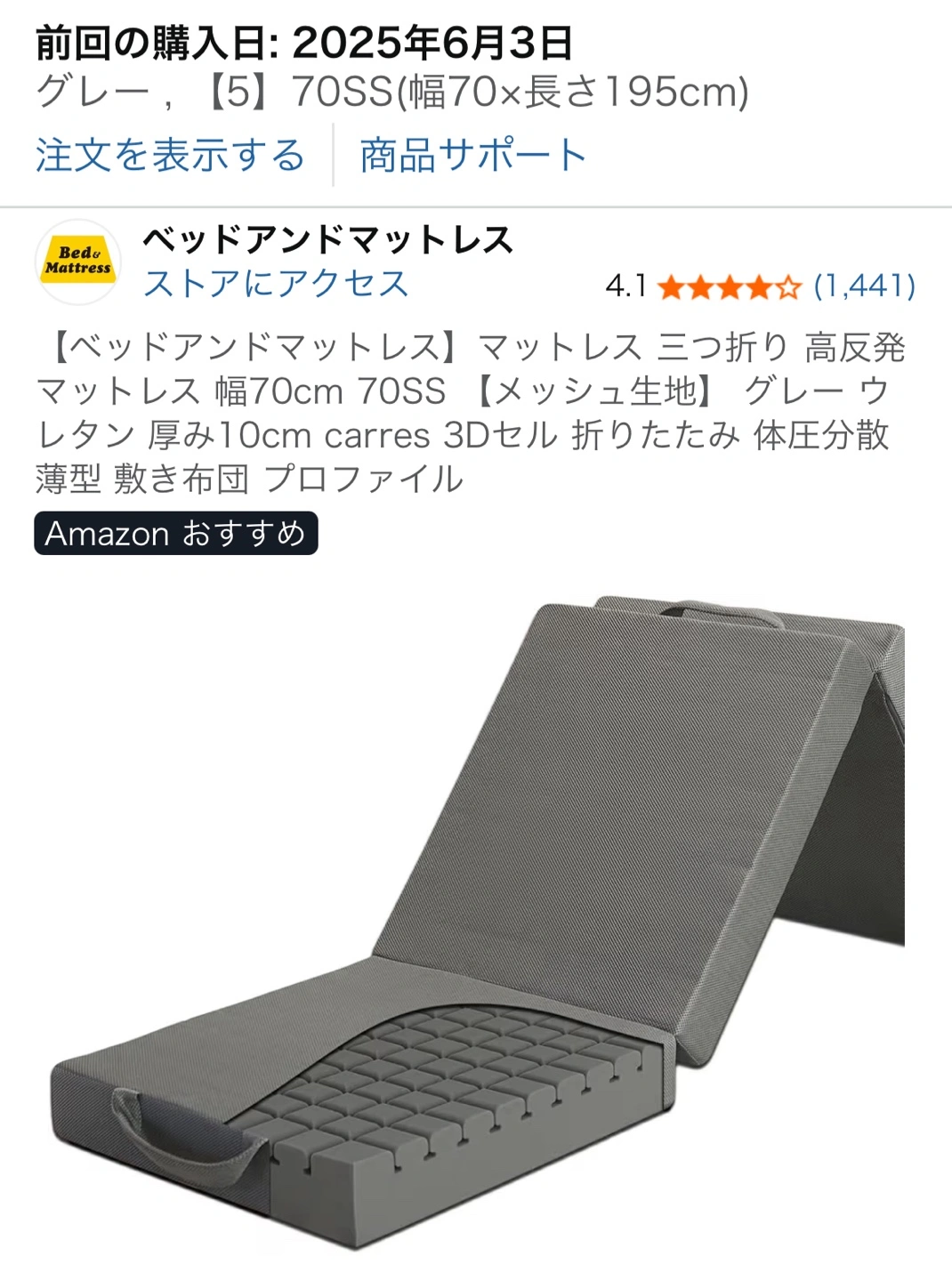 マットレス 三つ折り 高反発マットレス 幅70cm 70SS 【メッシュ生地】 グレー ウレタン 厚み10cm carres 3Dセル 折りたたみ 体圧分散 薄型 敷き布団 プロファイル ブランド: bed&mattress 2025年6月にAmazonから新品購入 サイズ違いのため開封して一度も使いませんでした