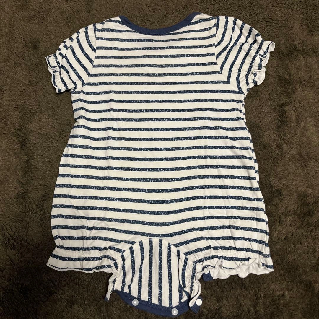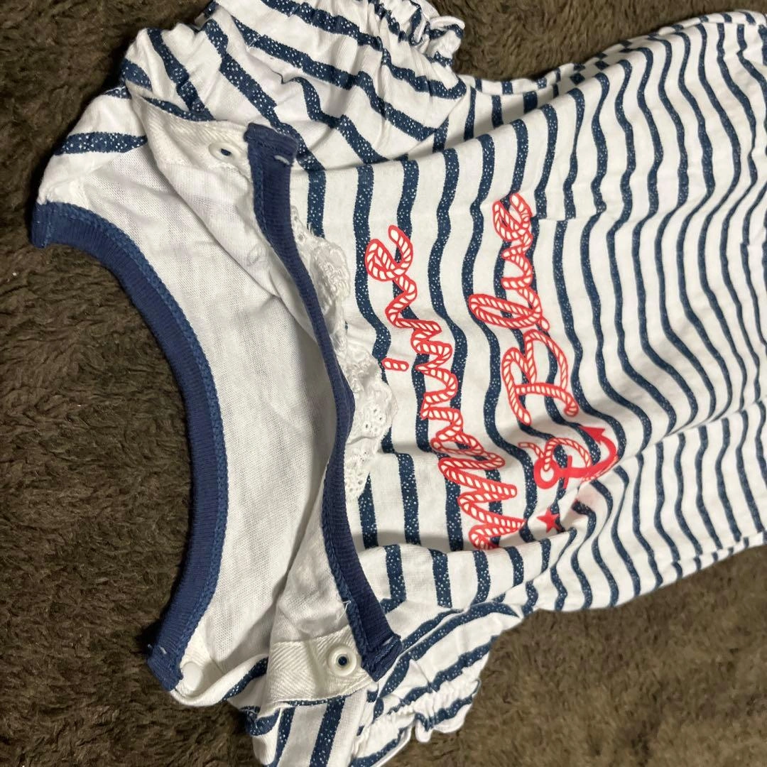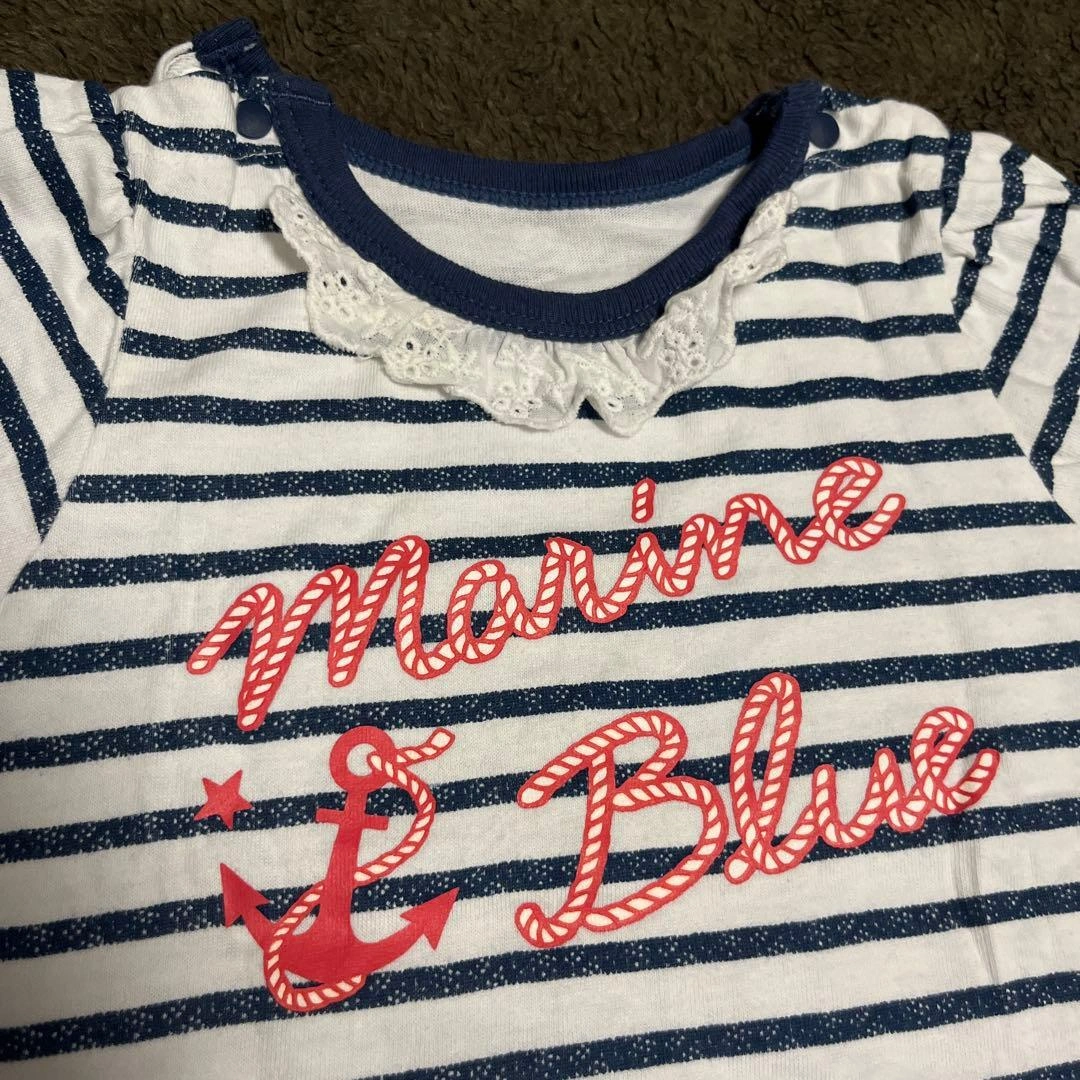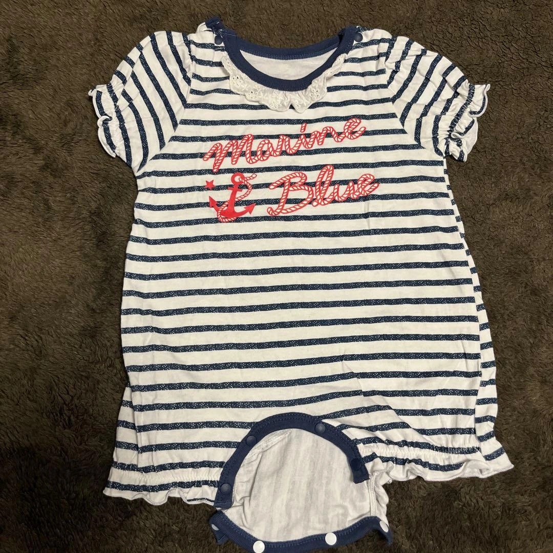ストライプ柄のマリン風ロンパース、レース襟付きです。 - デザイン: ストライプ柄、マリン風デザイン - 色: 白とネイビー - テキスト: Marine & Blue - 装飾: レースの襟、フリル袖 - ボタン: 股下にスナップボタン - サイズ: 80cmまで対応 - 素材: コットン100% ご覧いただきありがとうございます。 ご希望の方はお気軽にご連絡ください。