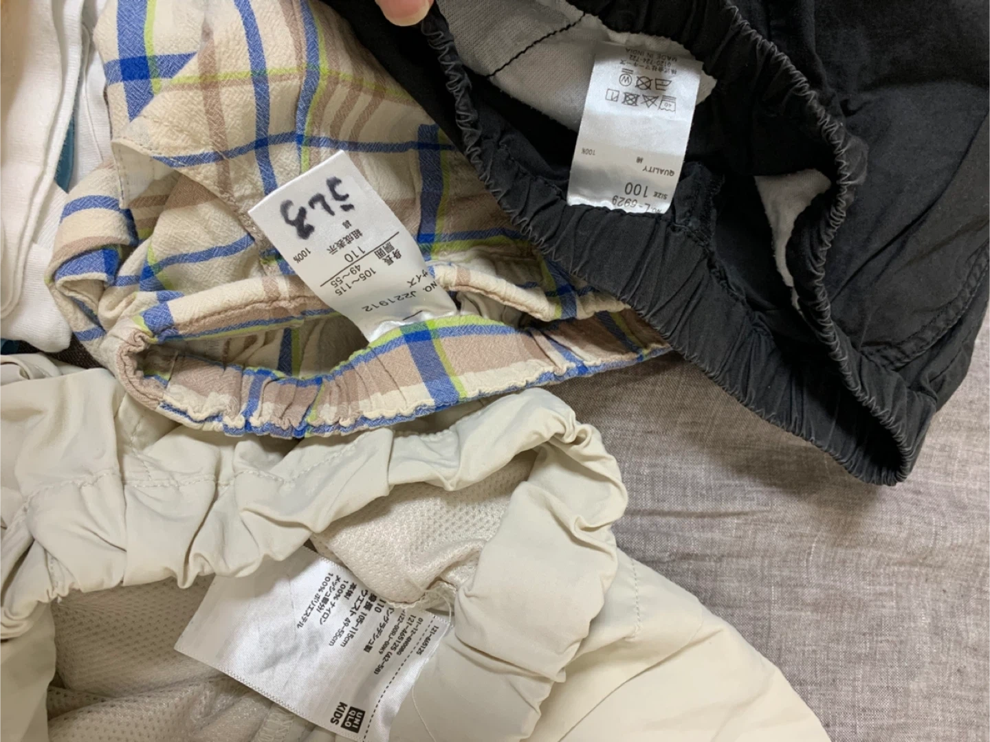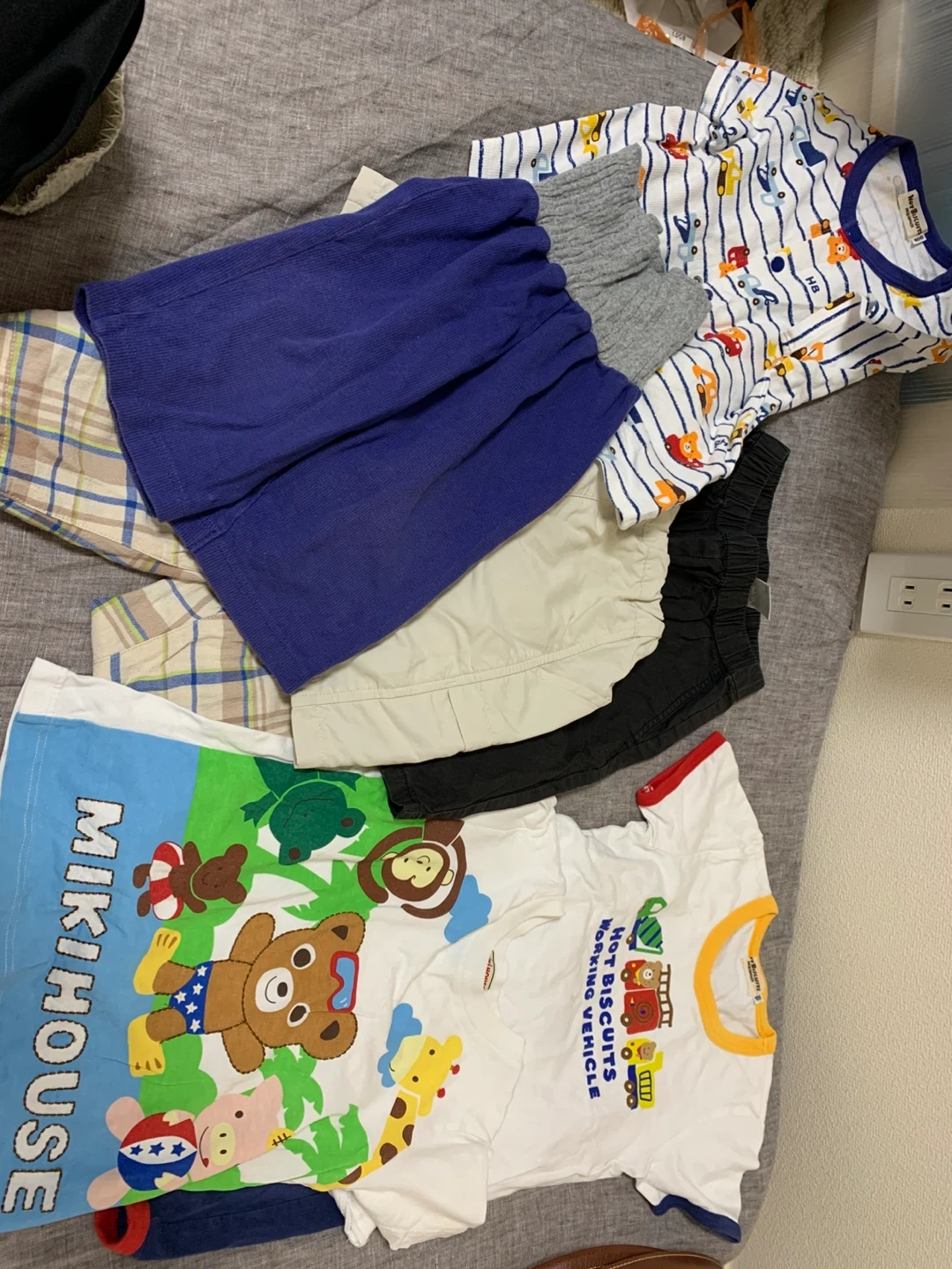 短パン2枚マーキーズ黒100.UNIQLOベージュ110ウエスト調整可能 チェックの薄い7部丈くらいズボン110、半袖ミキハウス110 半袖パジャマホットビスケッツ 100 半袖セットホットビスケッツ 100 運動着みたいな 無印の麻のシャツ100と110ネイビー など自宅宅配ボックスに入れておくので、 まとめて受け取ってくださるかたよろしくお願いします。