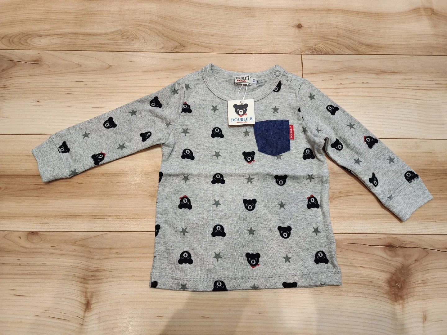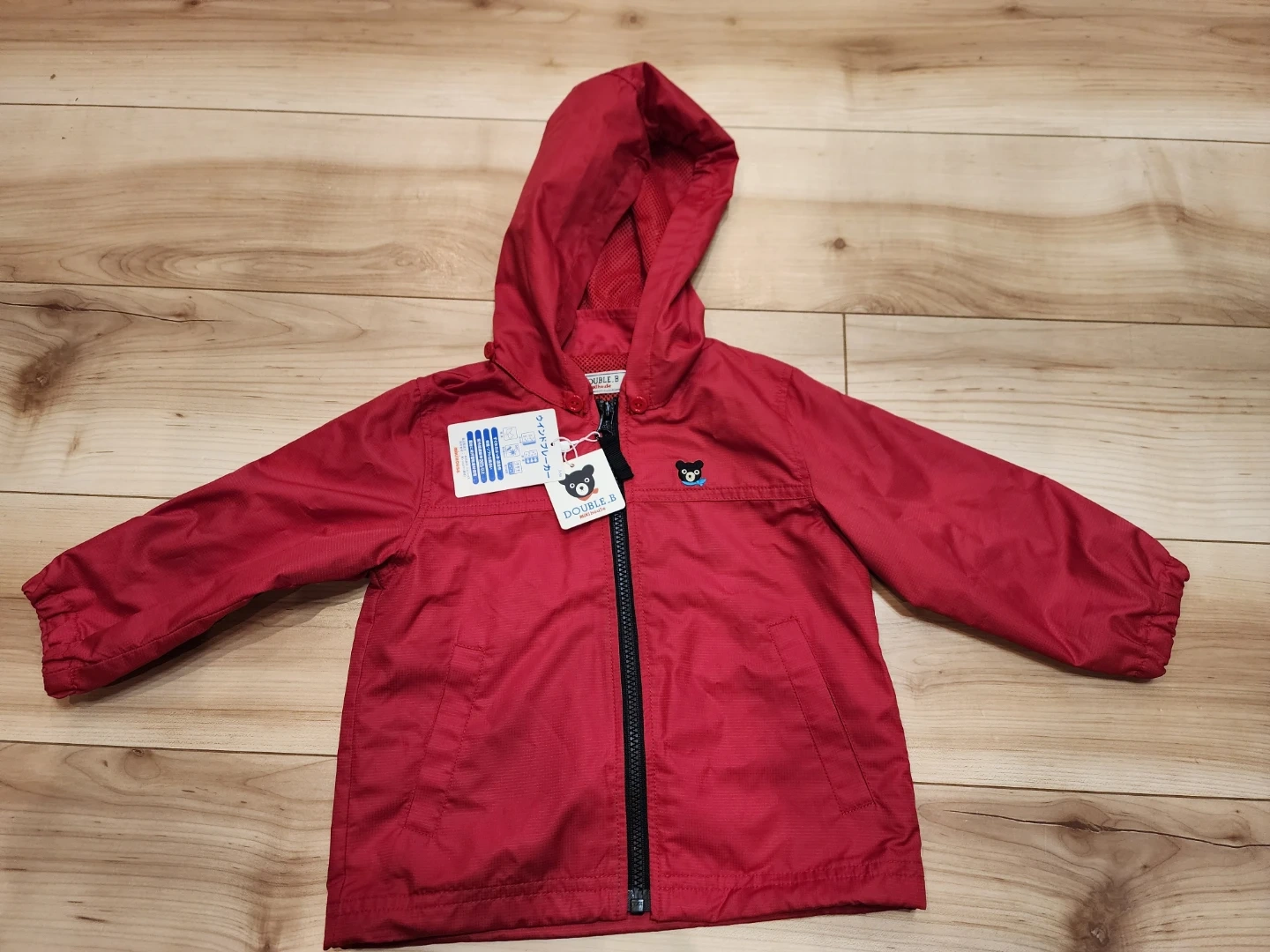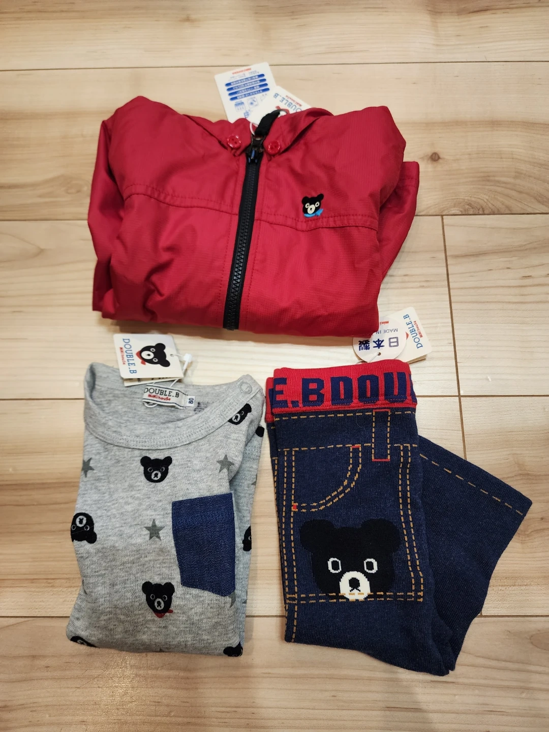 DOUBLE.Bのベビー服3点セットです。 ・赤色のウインドブレーカー ・灰色の長袖シャツ(星とクマの柄) ・紺色のズボン(おしりにもクマの顔付き) 新品タグ付きですが、自宅保管であることご了承ください。 #ミキハウス #MIKI HOUSE #ダブルビー