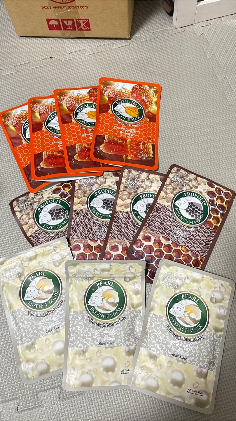 ミトモのエッセンスマスクセットです。 ・ロイヤルゼリー エッセンスマスク(5枚入りx 4パック 計20枚入り)EXP:20270401 ・プロポリス エッセンスマスク(5枚入りx 4パック 計20枚入り)EXP:20270801 ・パール エッセンスマスク(5枚入りx3パック 計18枚入り)EXP:20270401 原材料・成分 水、グリセリン、BG、DPG、フェノキシエタノール、クロルフェネシン、アラントイン、カルボマー、パンテノール、PEG-60水添ヒマシ油、TEA、アルブチン、EDTA-2Na、アロエベラ葉エキス、ボスウェリアセラタ樹脂エキス、香料、ヒアルロン酸Na、ポリアクリル酸Na 使用方法 使用方法: 1·洗顔後の清潔なお肌にご使用ください。2·シートマスクを袋から取り出し広げます。最初に目の位置を合わせてから口の位置を合わせ、顔全体にフィットさせてください。15分-20分程度おいてからマスクをはずしてください。 ご不明点があればお気軽にお尋ねください。