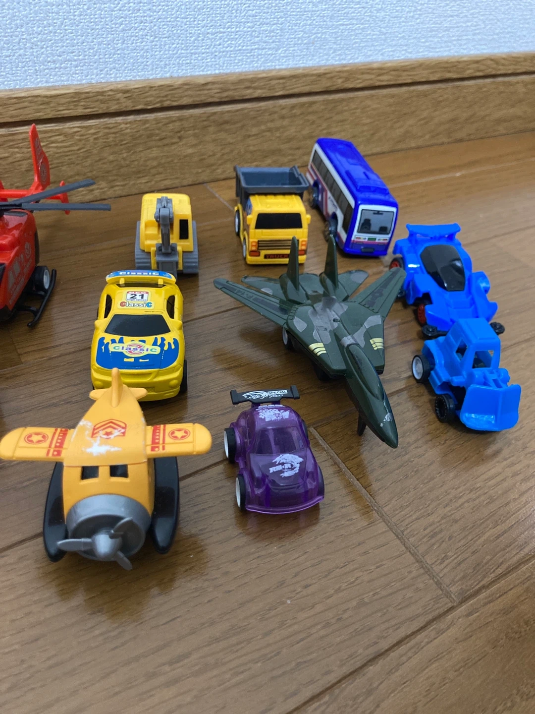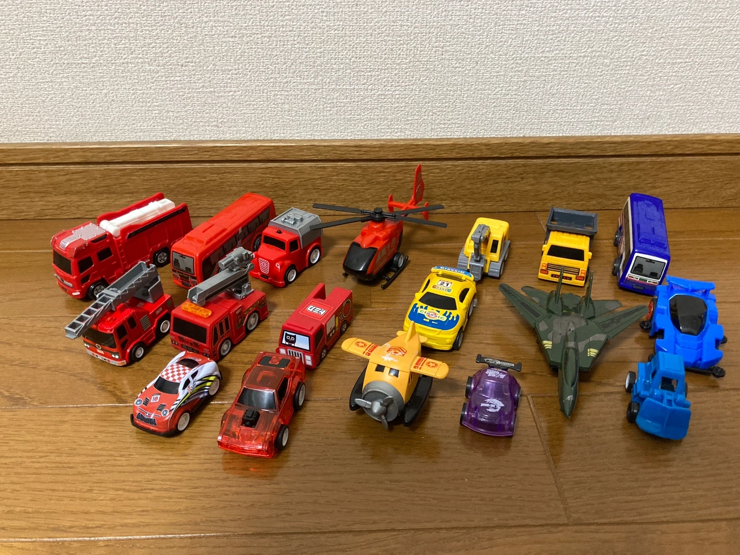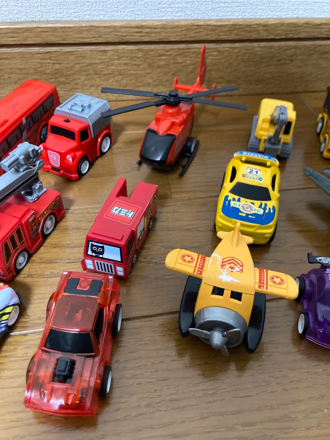 乗り物18点セットです。 乗り物好きなお子さん向けです。 様々な種類の乗り物があります。 主にお菓子のおまけ、飲食店でいただいたものです。 綺麗な状態なものの中にも動きの悪いものやシール・塗装のハゲ等、いろいろあります。 中古品であることご了承ください。