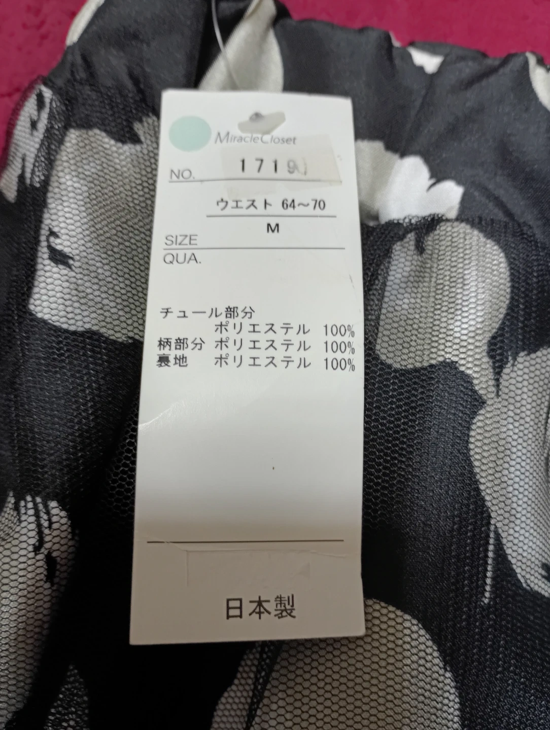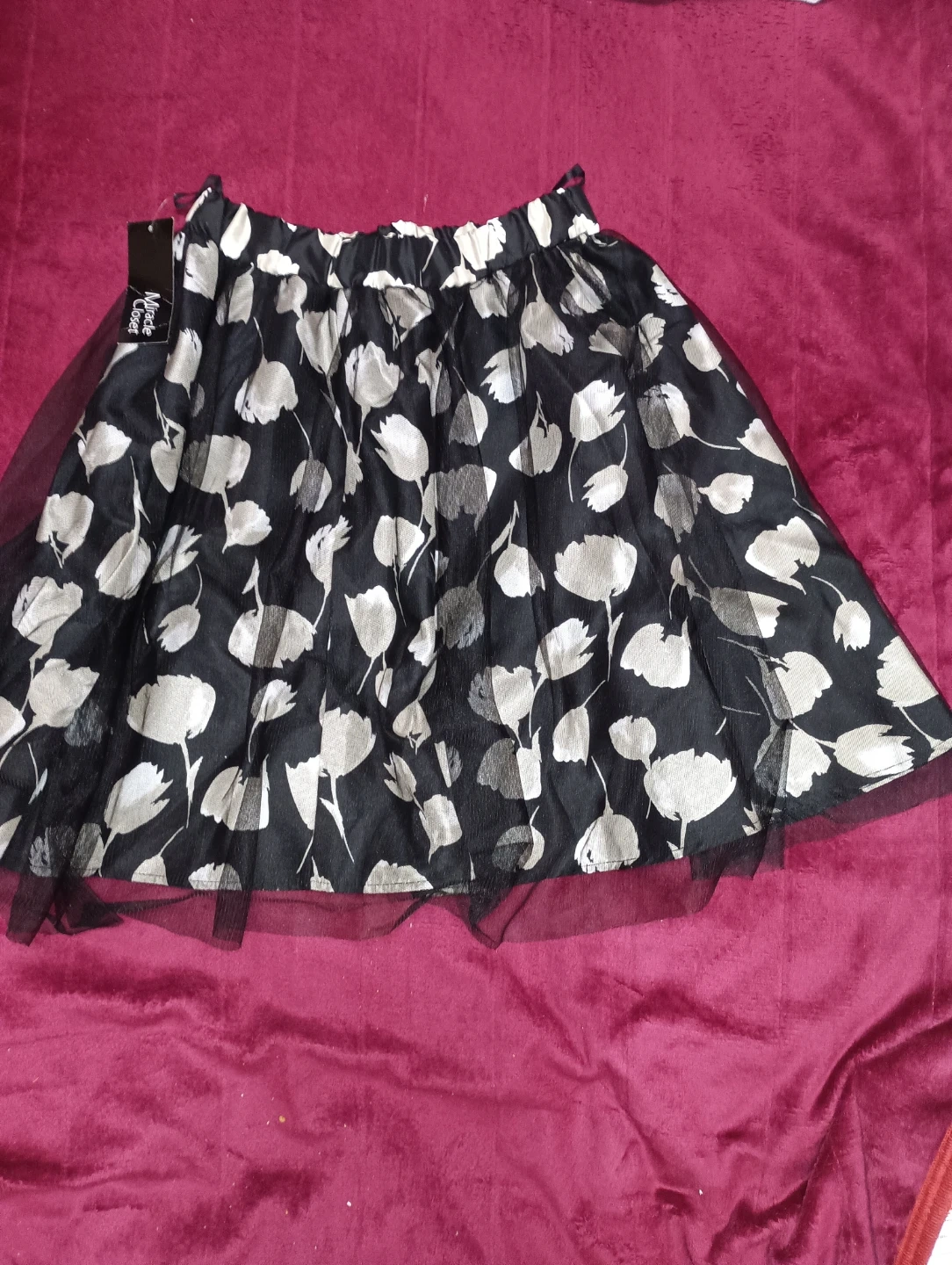 ミラクルクローゼットの花柄スカートです。 【情報】 ブランド:ミラクルクローゼット サイズ:M ウエスト:64~70cm 素材:  チュール部分 ポリエステル100%  柄部分 ポリエステル100%  裏地 ポリエステル100% 【状態】 1度も履いていません。 試着は2〜3回しています。お若い方、どうですか? 何かありましたら、ご相談をして下さい 一番上に、黒の網が付いています 素敵で本当は、離したくはしたくはないのですが、オババは悲しいけれども、何方かに譲りたいと、思うように、なりました