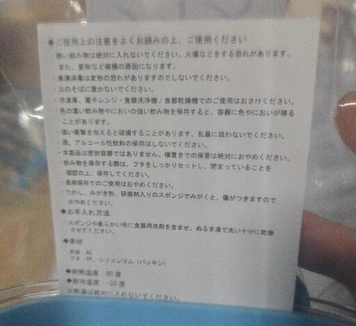 あたたかさ未使用ですが、自宅保管品のためご理解頂ける方のみご購入ください。 ●ご使用上の注意をよくお読みの上、ご使用ください ・熱い飲み物は絶対に入れないでください。火傷などをする恐れがあります。また、変形など破損の原因になります。 ・煮沸消毒は変形の恐れがありますのでしないでください。 ・火のそばに置かないでください。 ・冷凍庫、電子レンジ・食器洗浄機 食器乾燥機でのご使用はおさけください。 色の濃い飲み物やにおいの強い飲み物を保存すると、容器に色やにおいが移ることがあります。 ・強い衝撃を加えると破損することがあります。乱暴に扱わないでください。 ・酒、アルコール性飲料の保存はしないでください。 ・本製品は密封容器ではありません。横置きでの保管は絶対におやめください。 ・飲み物を保存する際は、フタをしっかりセットし、閉まっていることを確認の上、保存してください。 ・長期保存でのご使用はおやめください。 ・たわし、みがき粉、研磨剤入りのスポンジでみがくと、傷がつきますのでおやめください。 ◆お手入れ方法 スポンジ 柔らかい布に食器用洗剤を含ませ、ぬるま湯で洗い十分に乾燥 させてください。 素材 本体:AS フタ:PP、シリコンゴム (パッキ ン) ●耐熱温度:80度 ●耐冷温度:20度 ※熱湯は絶対に入れないでください。 ご覧いただきありがとうございます。