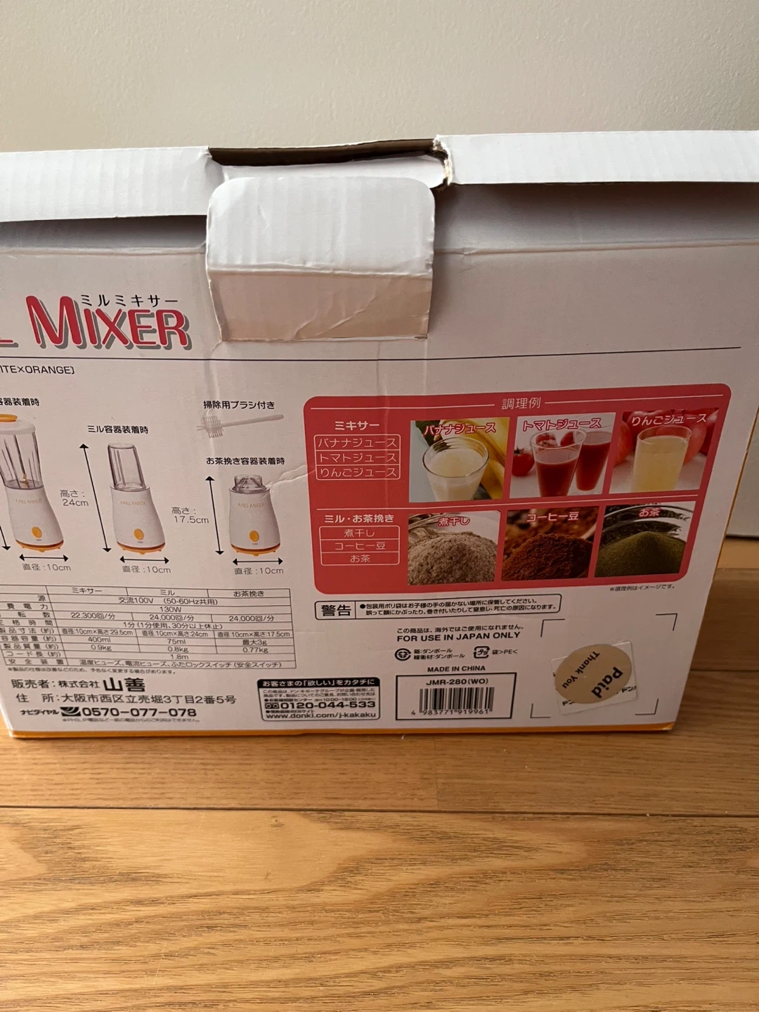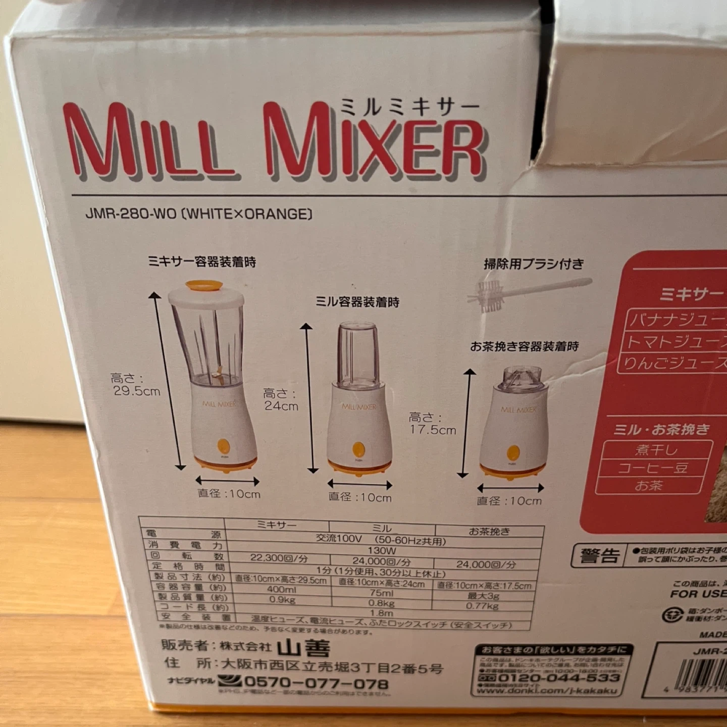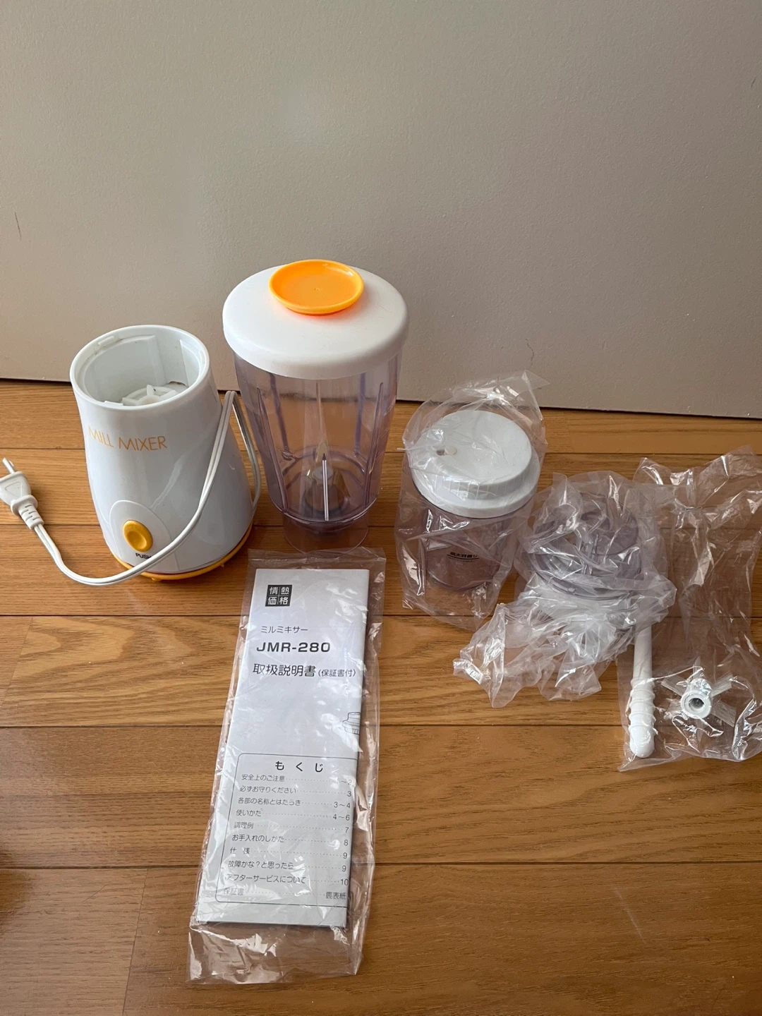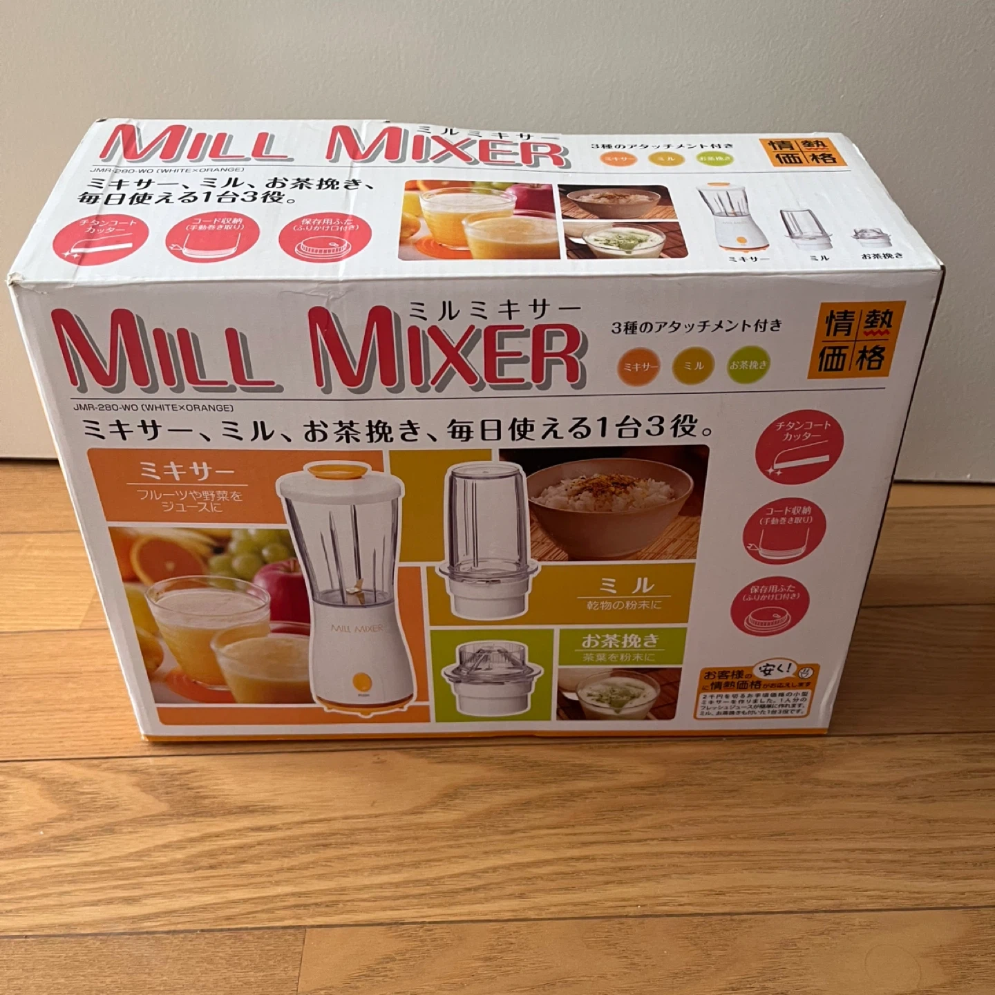 ミルミキサー JMR-280-WO(WHITE×ORANGE)です。 数年前に購入し、ミキサーのみ使用していました。 離乳食や介護食づくりにも役立ちます。 クリスマス ディナー作りでも重宝すると思います。スープや手作りドレッシング、ジュースも作れます。 箱は汚れや破れがあります。 動作に問題や不具合はありません。 【情報】 *型番: JMR-280-WO (WHITE×ORANGE) 【状態】 * 本体とミキサーは使用済み 使用中の細かい汚れや傷があります。 *ミルミキサー、お茶挽き、掃除関連用具は新品未使用です。 【付属品】 * ミキサー容器 * ミル容器 * お茶挽き容器 * 掃除用ブラシ * 説明書 中古品であることご了承ください。