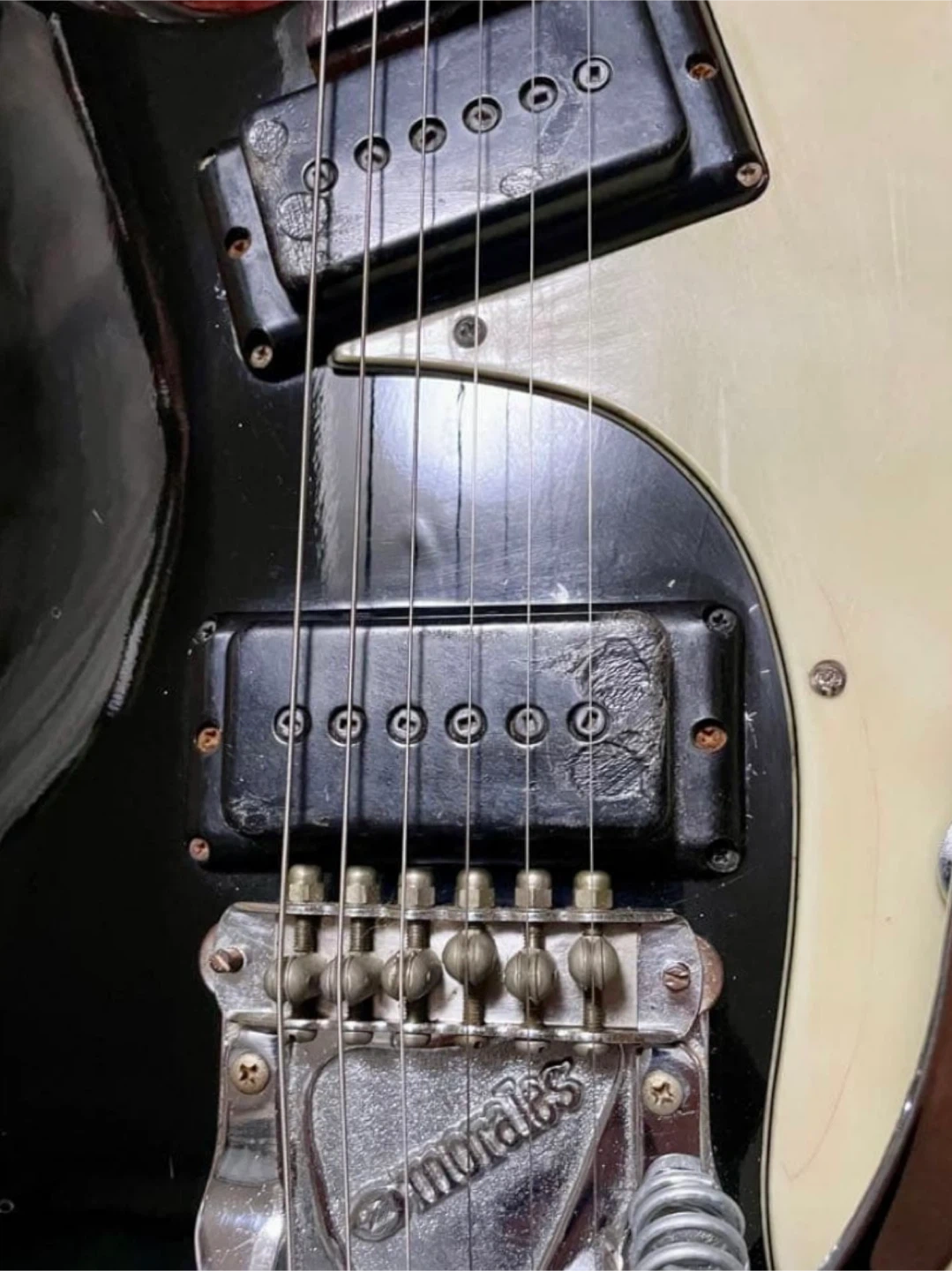 モラレス モズライト エレキギター 日本製 ジャパンヴィンテージ ボディ 黒 ブラック ピックガード 白(3枚目の写真が近いです) モズライトらしい良い音します。 出音に問題はありませんが 写真の様に傷などあります。 中古品にご理解ある方のみご検討ください アームとスプリングは純正品ではありません。 トグルスイッチは純正ではないと思います。 ジャックはピュアトーンに変えてあります。 ピックアップの表面は恐らく熱で溶けた様な跡がありますが出音は問題ありません。 ネックは弦を張った状態でほぼストレート。 フレット残りは8割位かと思います。 ペグは恐らく純正ですがくすみ、さびがあります。 ケースはありません。 現状のままお 渡しになります。 よろしくお願いします。 市場に出ている同タイプの品物より 大変お安く出しております。 ★近隣でしたら無料でお届けします。 少し遠い場合は500円〜お届けします。 Nirvana カートコバーン ラモーンズ ベンチャーズ