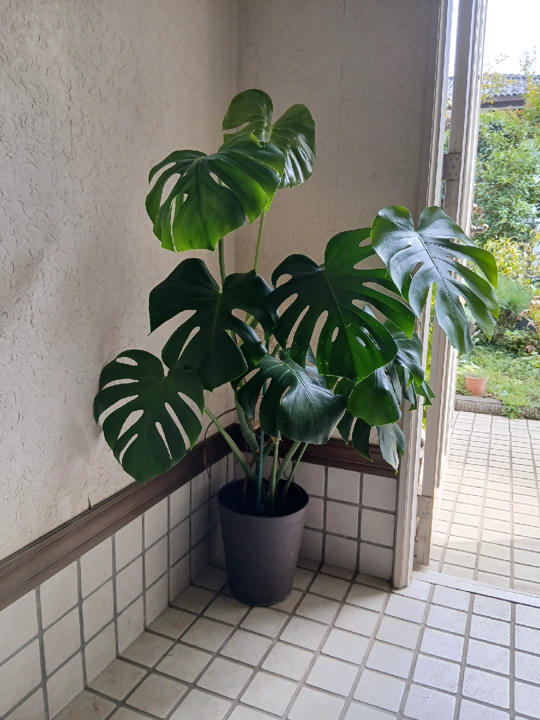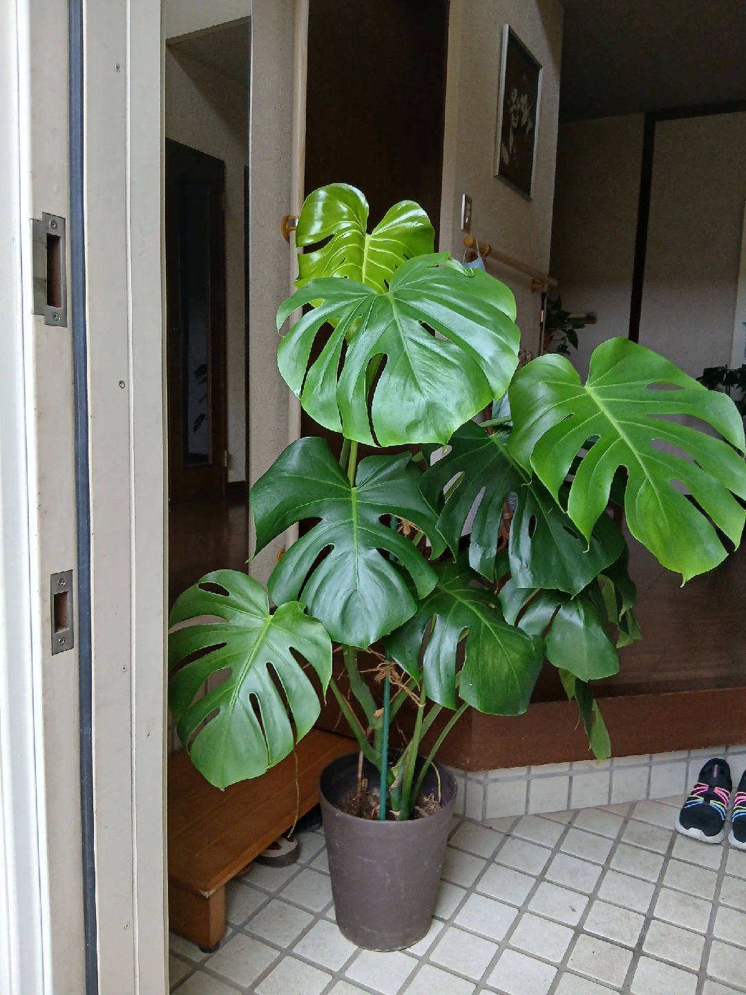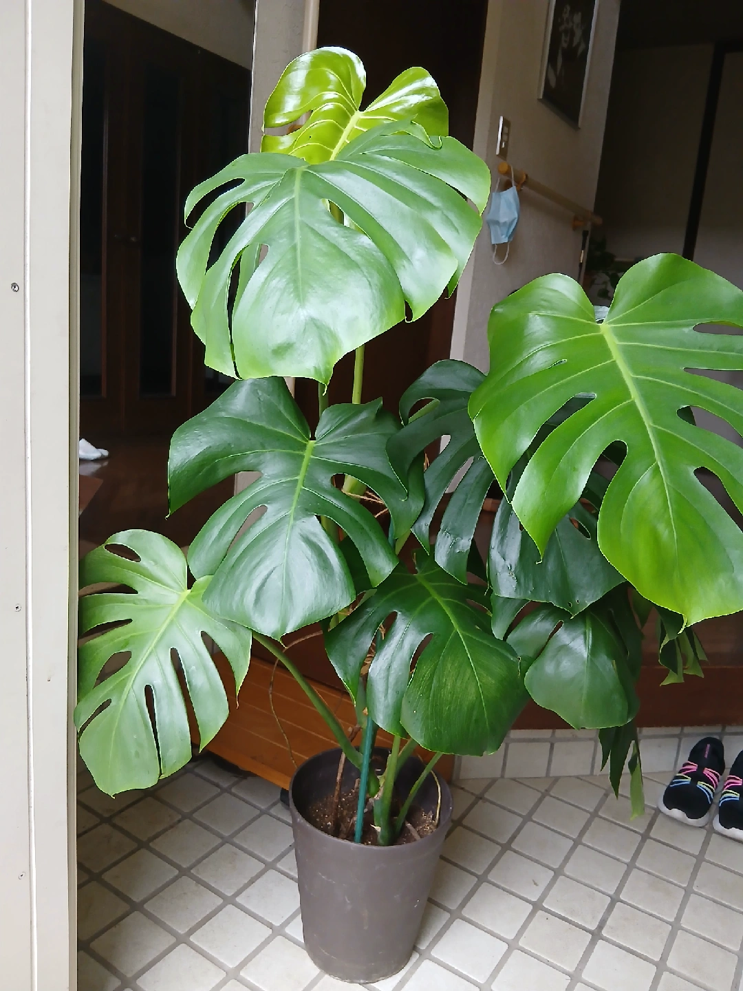 観葉植物のモンステラです ・鉢の色:ダークブラウン ・状態:非常に良好 大切に育てた、モンステラデリシオザ5年物のトップをカットして、移植後2年経過中、10枚の美しい葉をつけています、これからが楽しみな鉢です。10枚目の葉が開きました。とてもきれいです。 おまけにポトスの鉢をお付けします。元気に育っています。 高さは、鉢底から115センチ 幅は、短い支柱を使用して、80センチです。 置場所は南東向きの玄関。 明るいカーテンごしの光が入るリビングにも最適です。 他にも多数育てているので、バランスの良い物から出品して参ります。