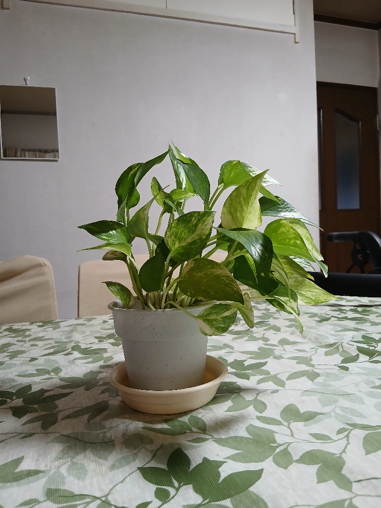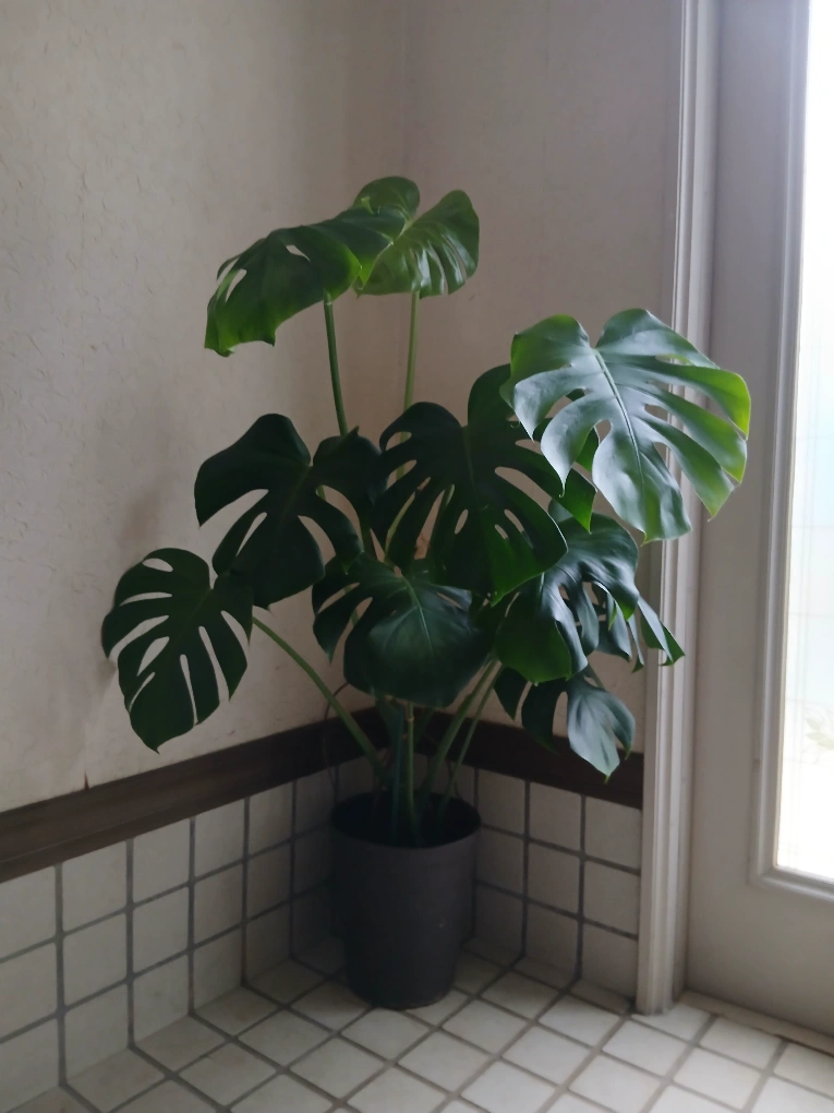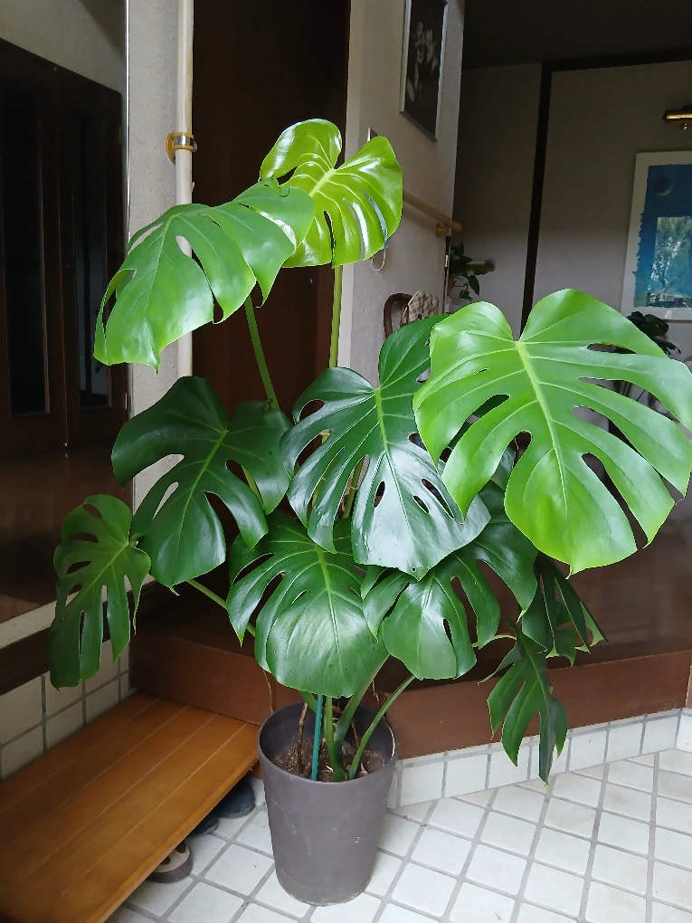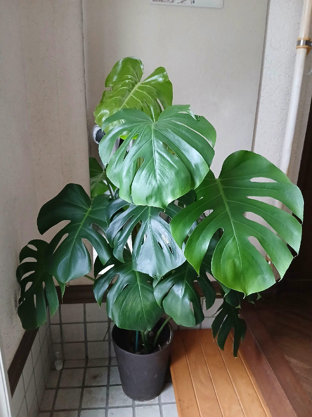 観葉植物のモンステラです ・鉢の色:ダークブラウン ・状態:非常に良好 大切に育てた、モンステラデリシオザ5年物のトップをカットして、移植後2年経過中、10枚の美しい葉をつけています、これからが楽しみな鉢です。10枚目の葉が開きました。とてもきれいです。 おまけにポトスの鉢をお付けします。元気に育っています。 高さは、鉢底から115センチ 幅は、短い支柱を使用して、80センチです。 置場所は南東向きの玄関。 明るいカーテンごしの光が入るリビングにも最適です。 他にも多数育てているので、バランスの良い物から出品して参ります。