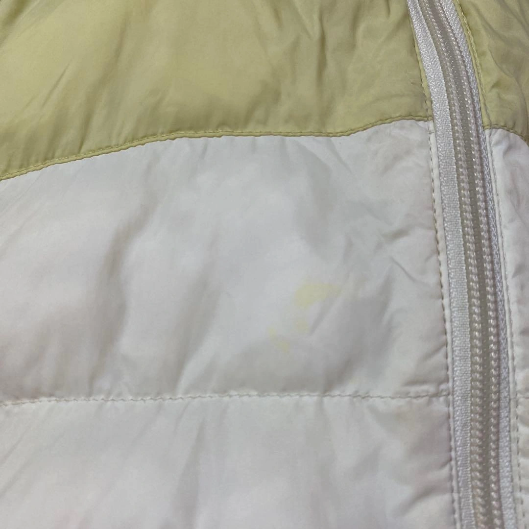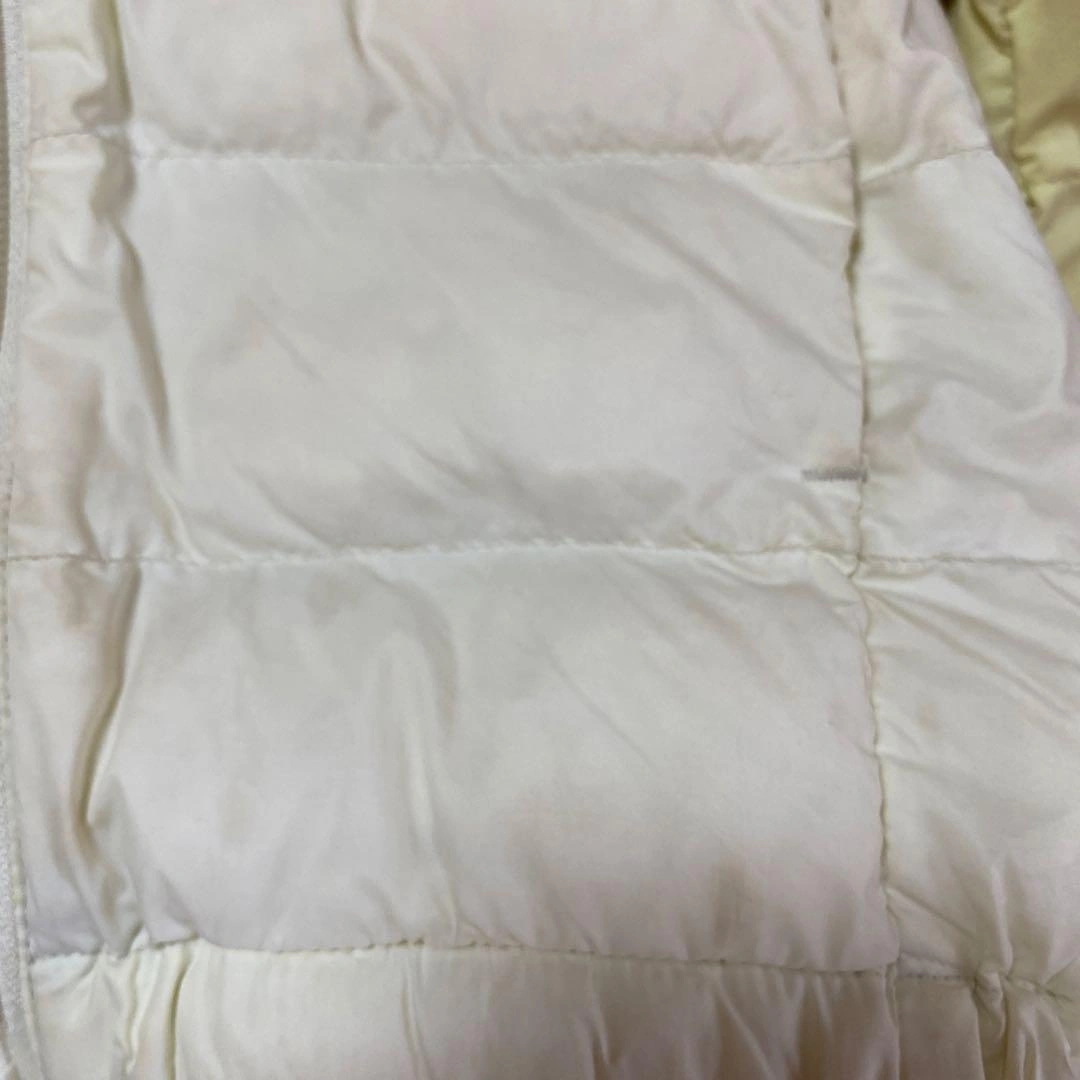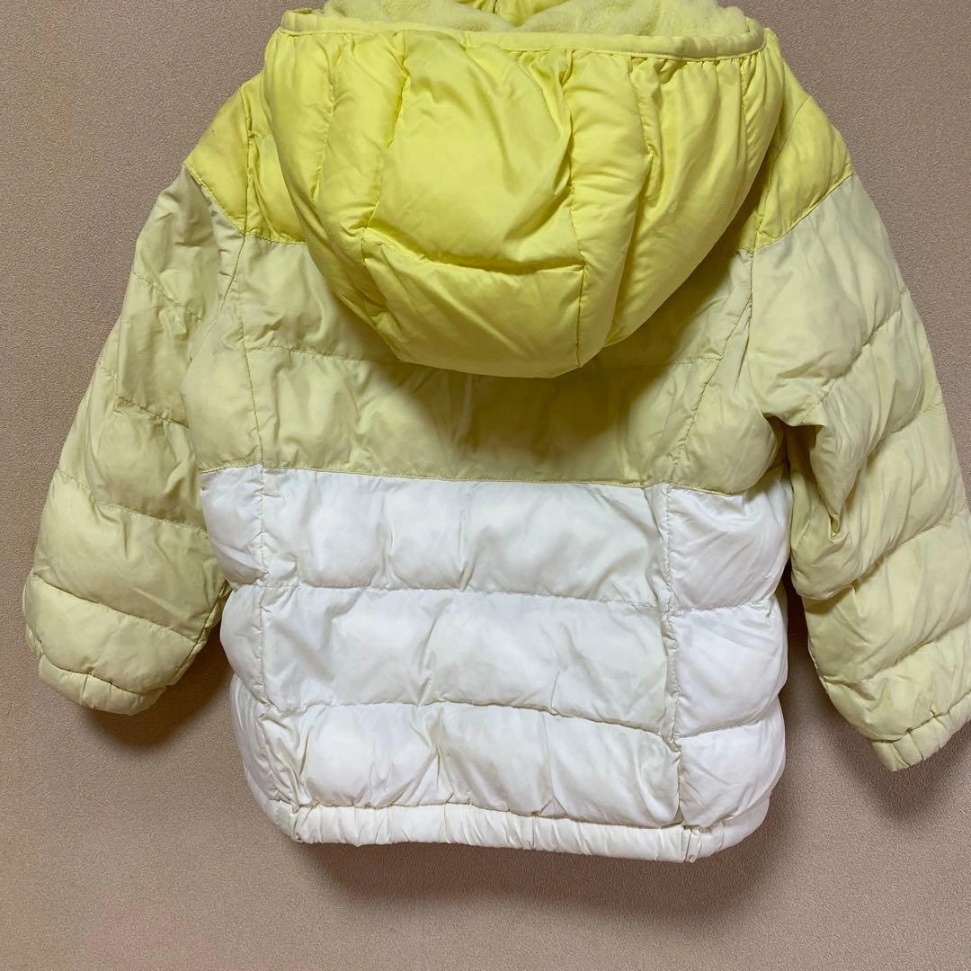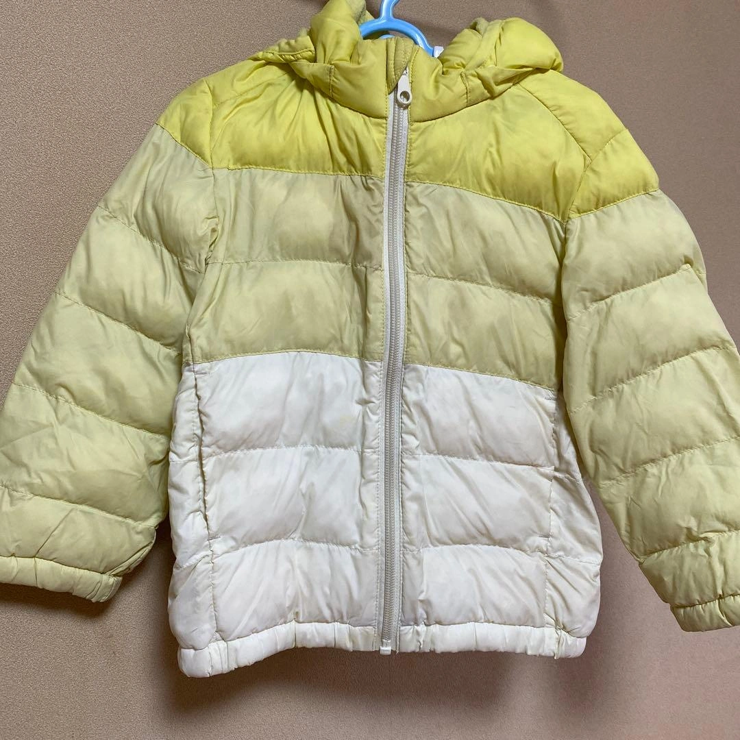 ユニクロの中綿ダウンです。 フードは未使用です。 外遊び用で愛用していましたので、首元含め全体的に黒ずんでおり、前見ごろに黄色の絵の具?と泥汚れのシミもあります。中綿もフカフカ感は減っています。 タグにお名前シールの剥がした跡があります。 ご希望の方はお気軽にご連絡ください。