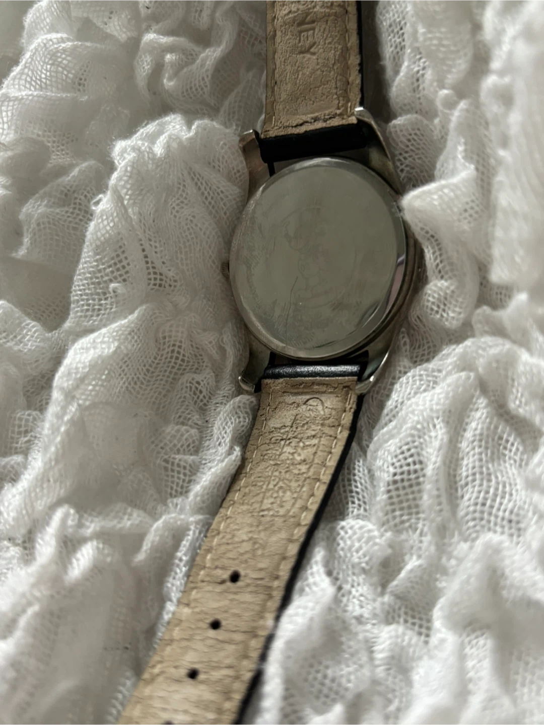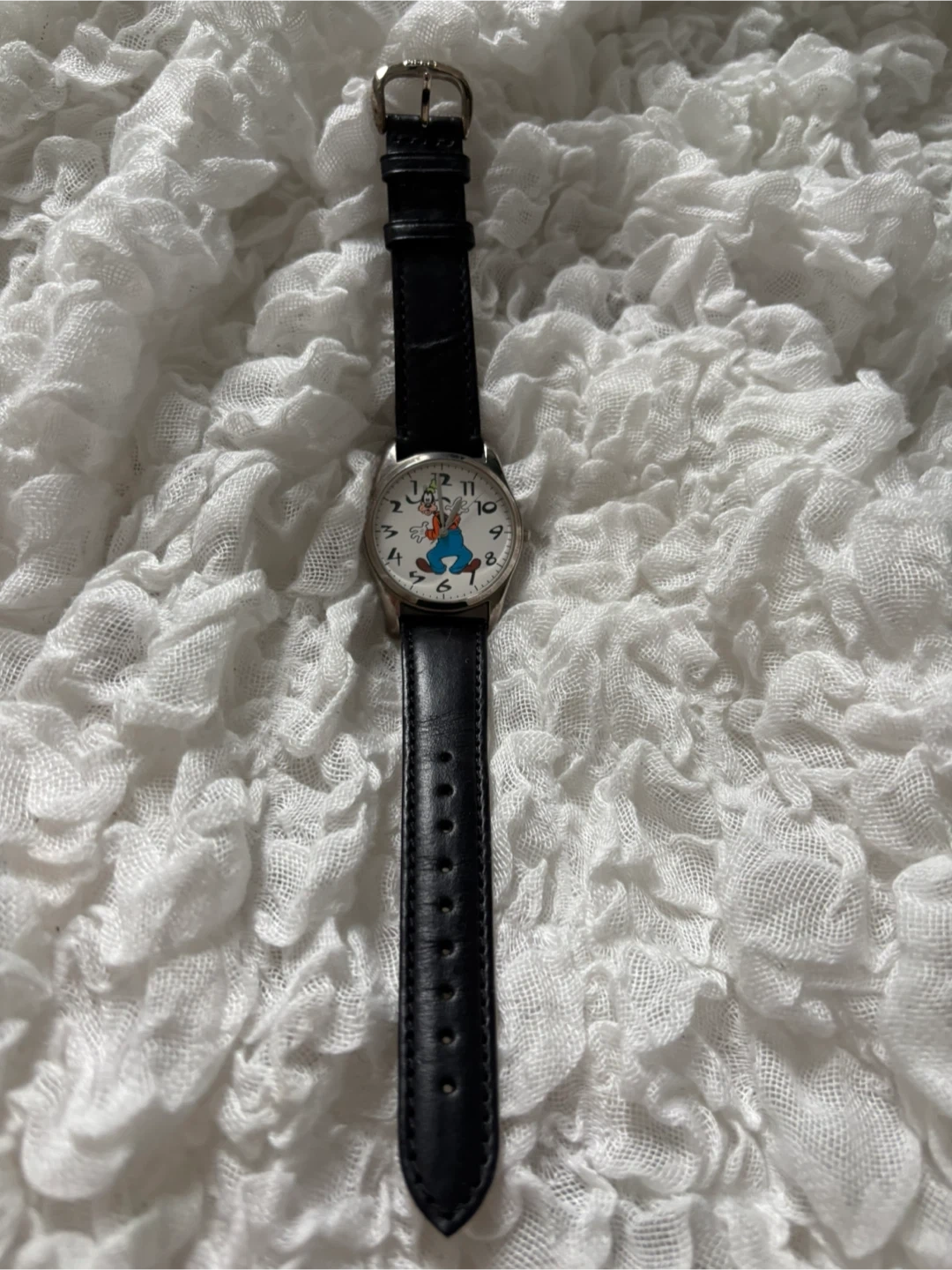 90年代前半にアメリカのディズニーストアで購入した腕時計です。 クォーツ式 文字盤を見て頂ければわかると思いますが反時計回りに動きます。 過去数回電池交換しましたが現在は交換しておらず止まった状態で保管してました。電池交換すれば動くと思いますが保証はできません。 ベルトは購入時のオリジナルで劣化が激しく内側がポロポロと剥がれてきます。 ケース及び外部金属パーツにクスミや小傷あり。ガラス面には目立つ傷なし。 電池、ベルトを交換すればまだまだ使用可能だと思いますが動きがユニークすぎてあまり実用的ではないと思ったので出品します。