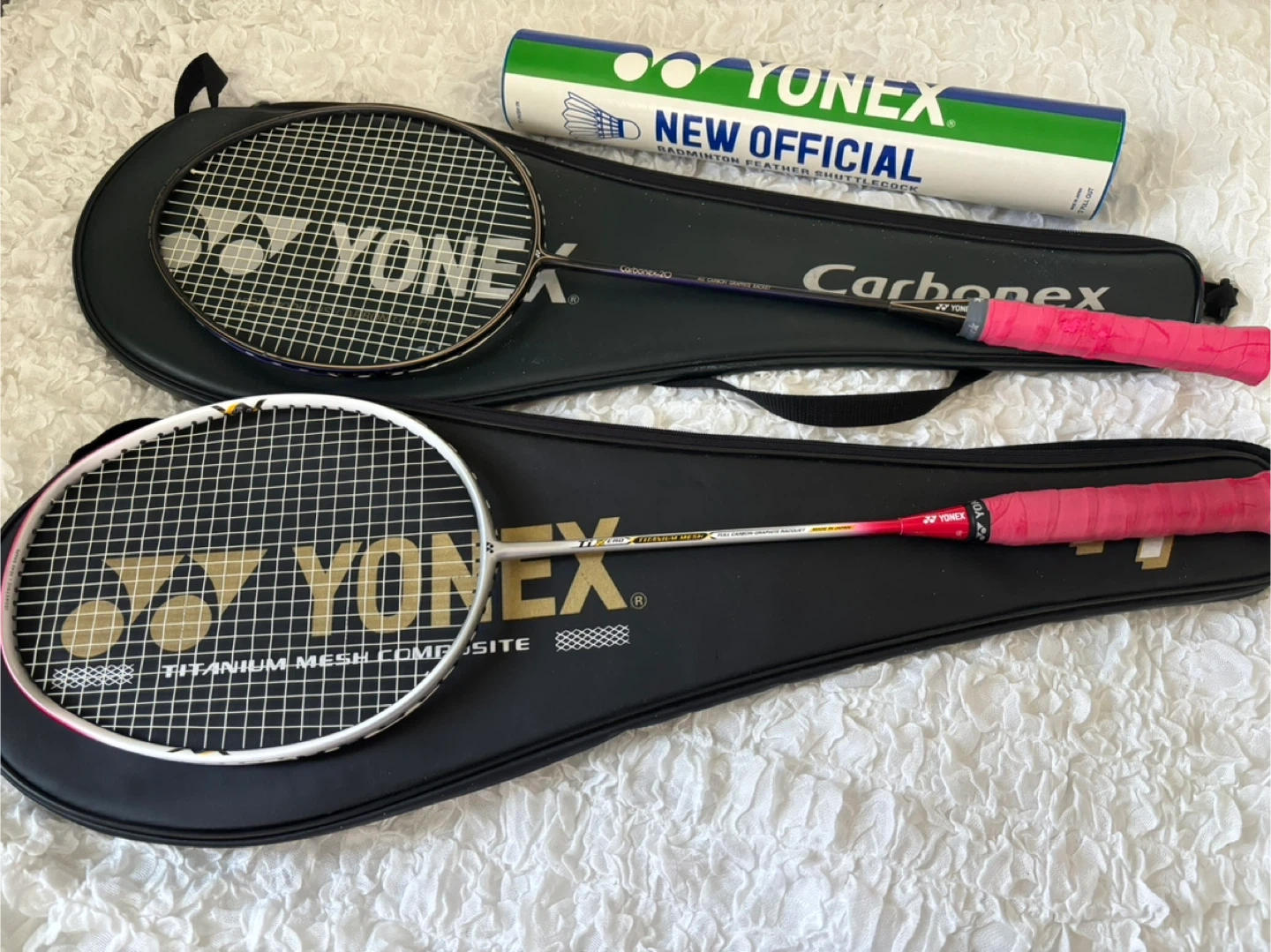 ⭐︎旧モデルのcab20 所々フレームに傷や剥がれあり。オリジナルのグリップは剥がしてしまい後から自分のサイズにグリップテープを巻き直してます。  カバーつき(傷、ペンキの跳ね汚れなどあり) ⭐︎TiZ ERO フレーム、ガット共に良好。 カバーつき(ペンキの跳ね汚れ、スレなどあり) どちらもグリップテープにベタつき、剥がれが出てますのでテープ交換をおすすめします。 ⭐︎未使用シャトル 一部長期保管によるダメージあり(画像参照) 羽部分は問題なし。 ラケット2本とシャトルを纏めて引き取れる方に。