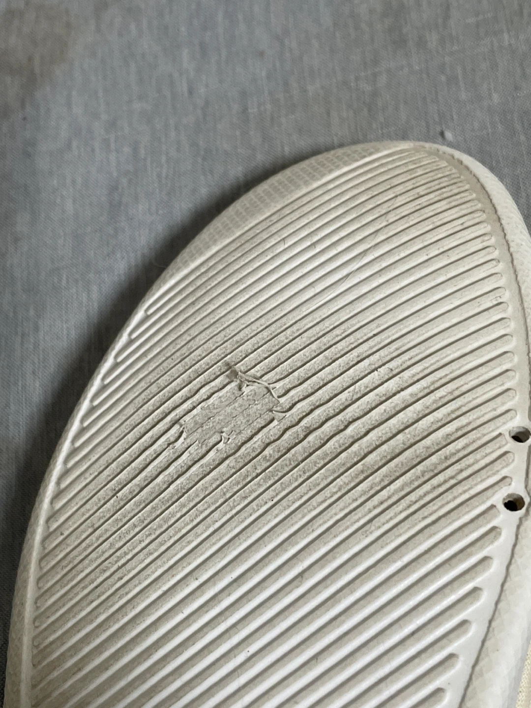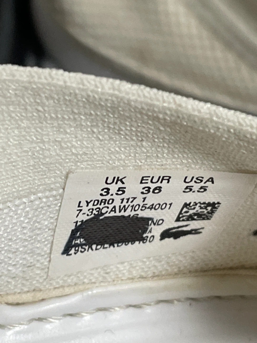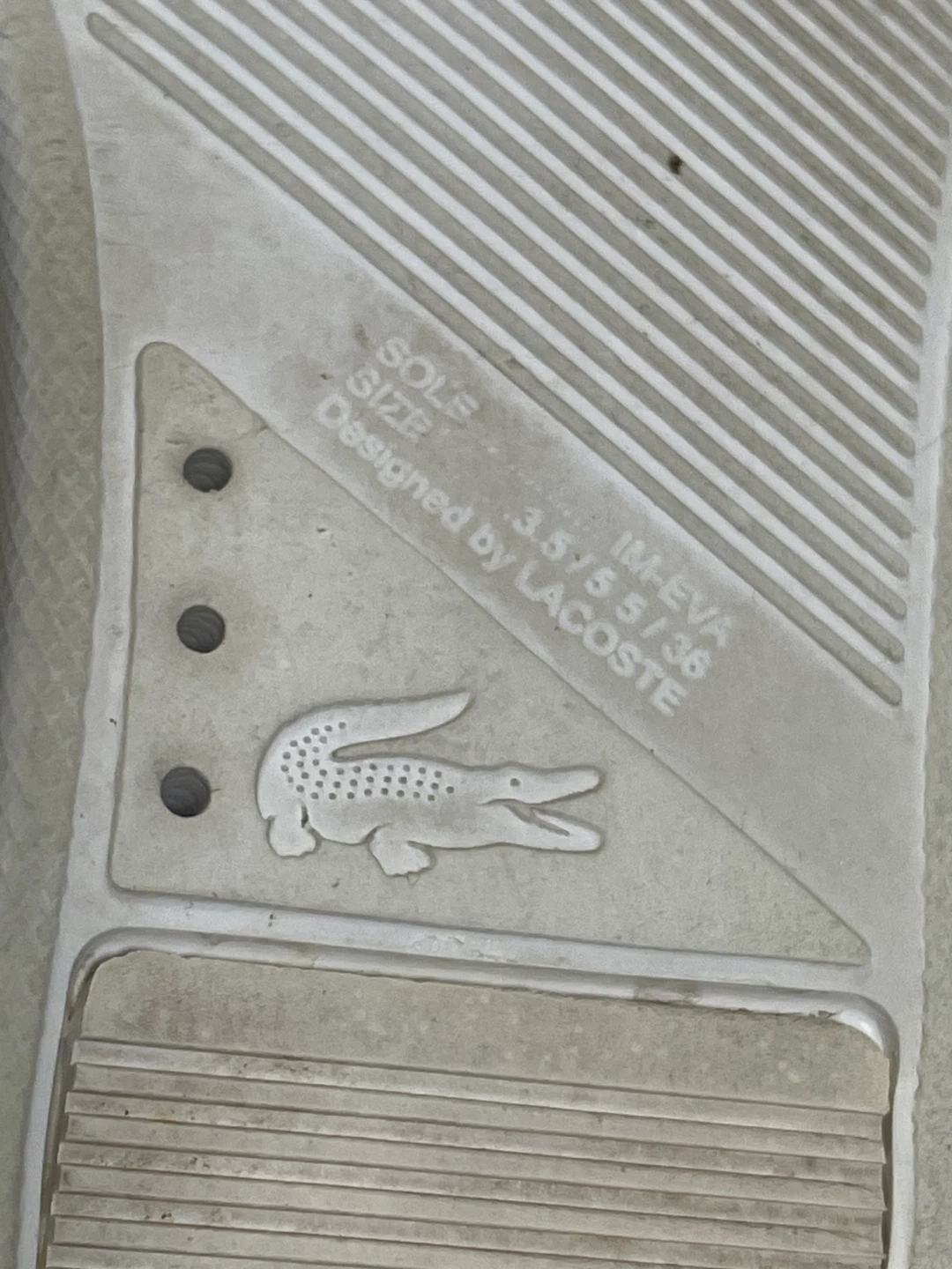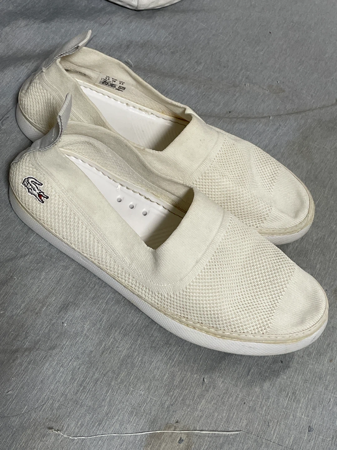ラコステのスリッポンです。孫が 合宿の時の上履きで1日使用しました。その後履くことなくしまっていました。洗濯の際 歯ブラシで擦ってしまったか らか、靴底の溝が右足側だけはがれてしまいました。また、2年程靴箱に保管していたので、洗いました。中古品であり、この状態でもご理解いただける方にお譲りします。 ・カラー:オフホワイト ・サイズ:36(23cm相当) ・使用感あり 中古品であることご了承ください