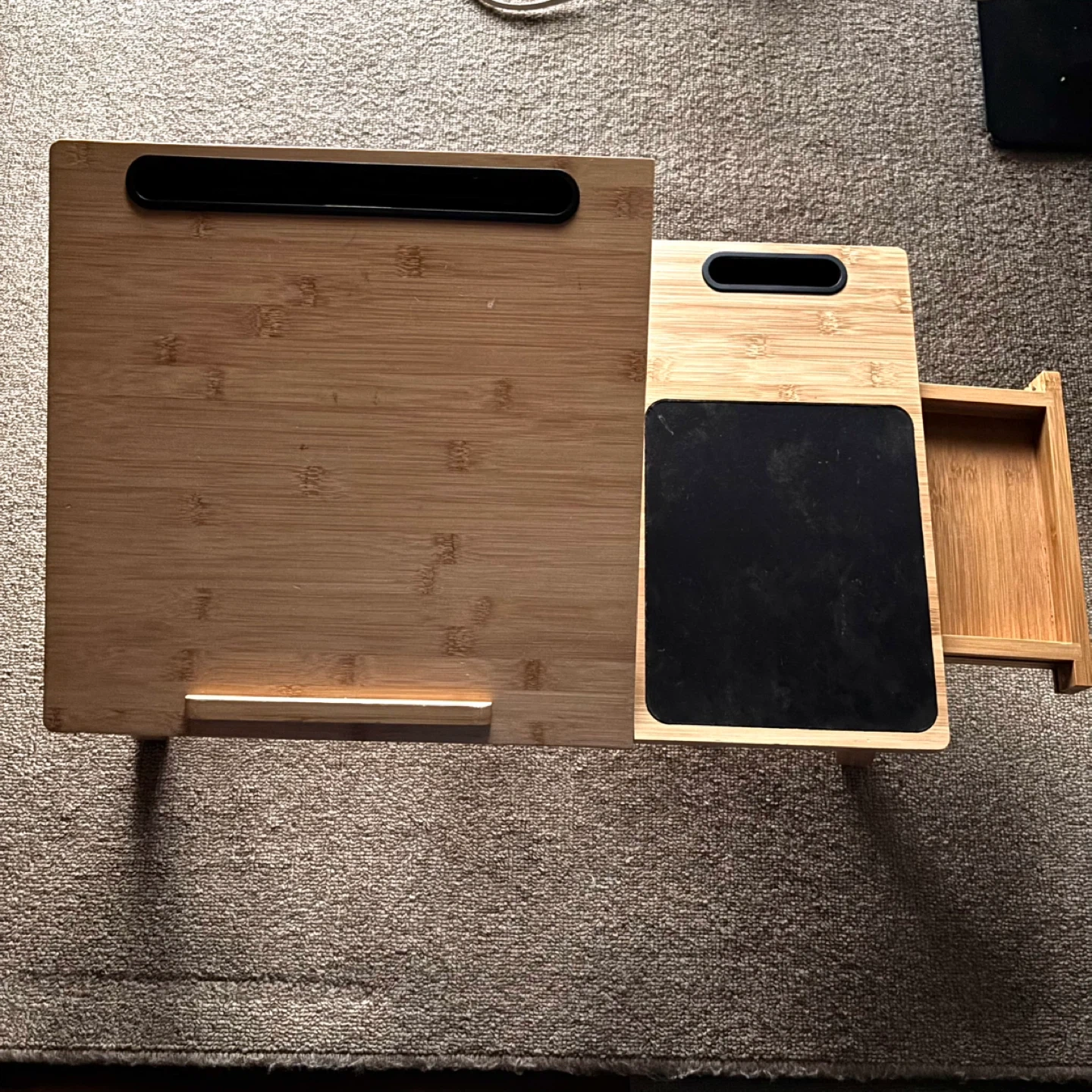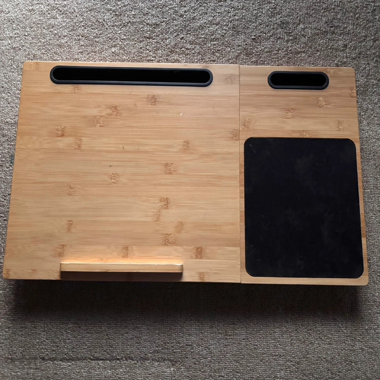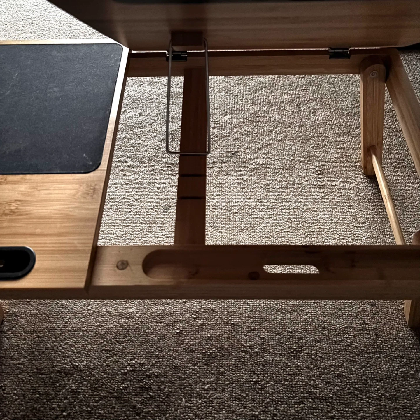 あたたかさラップトップトレイ 多機能ローテーブル 写真3枚目はフル展開した場合です 上の黒い部分はスマホやタブレットを差し込めます(下部にケーブルを通せる穴があるので充電しながら動画などを見たり出来ます) お問い合わせ多数の場合早くお取り引きいただける方を優先します 個人使用ですので傷汚れはございますのでご理解いただける方のみお問い合わせ下さい