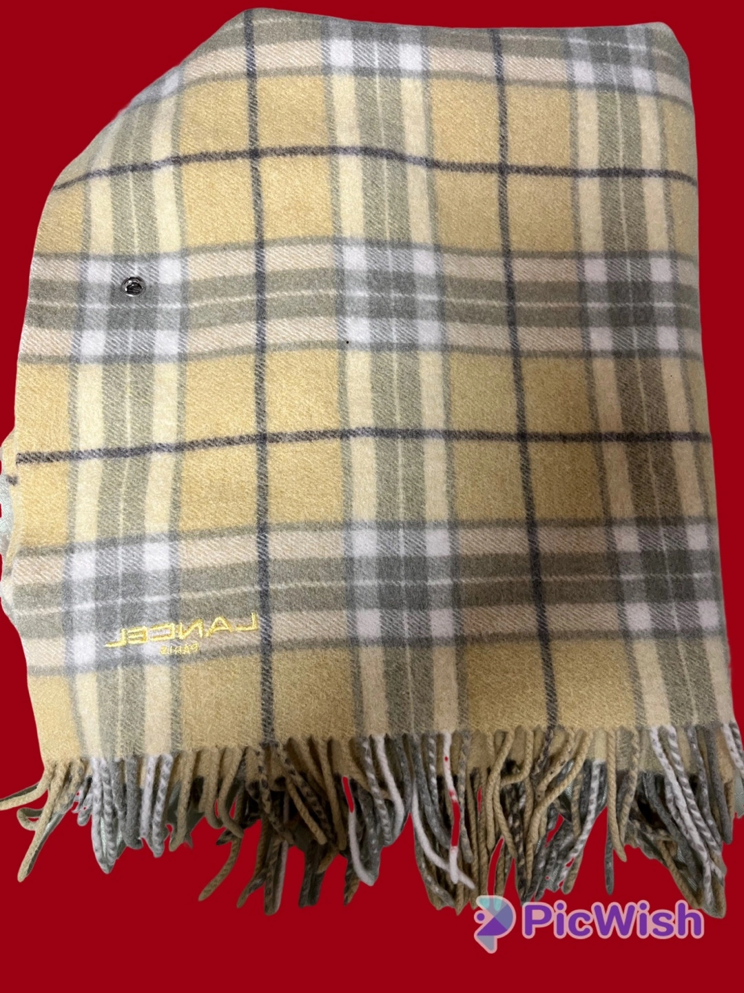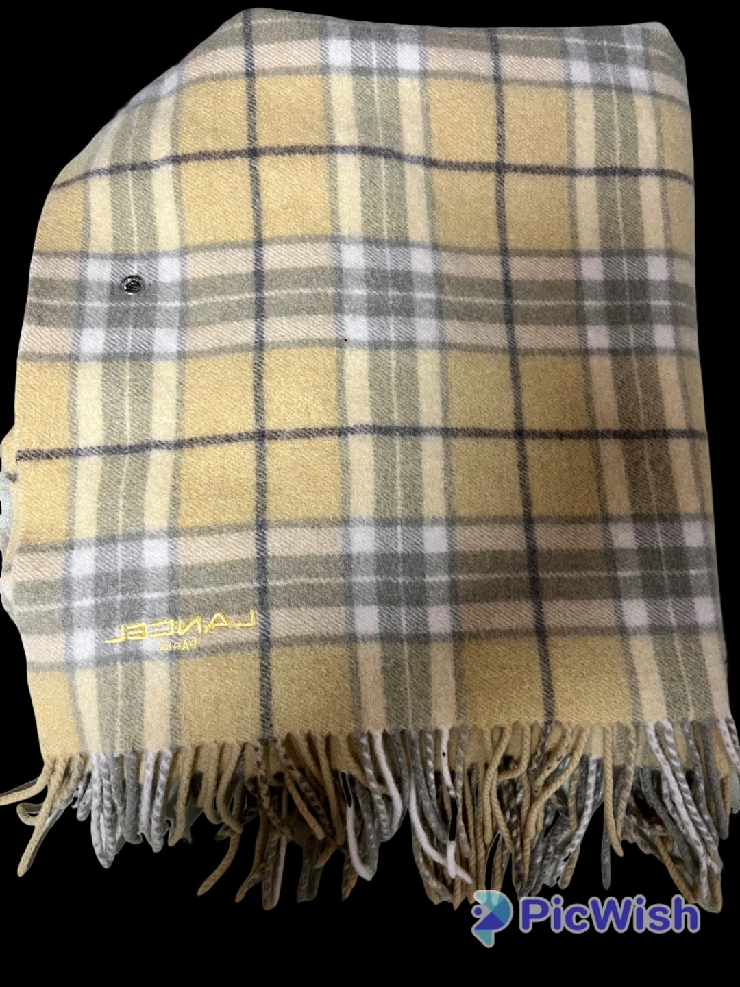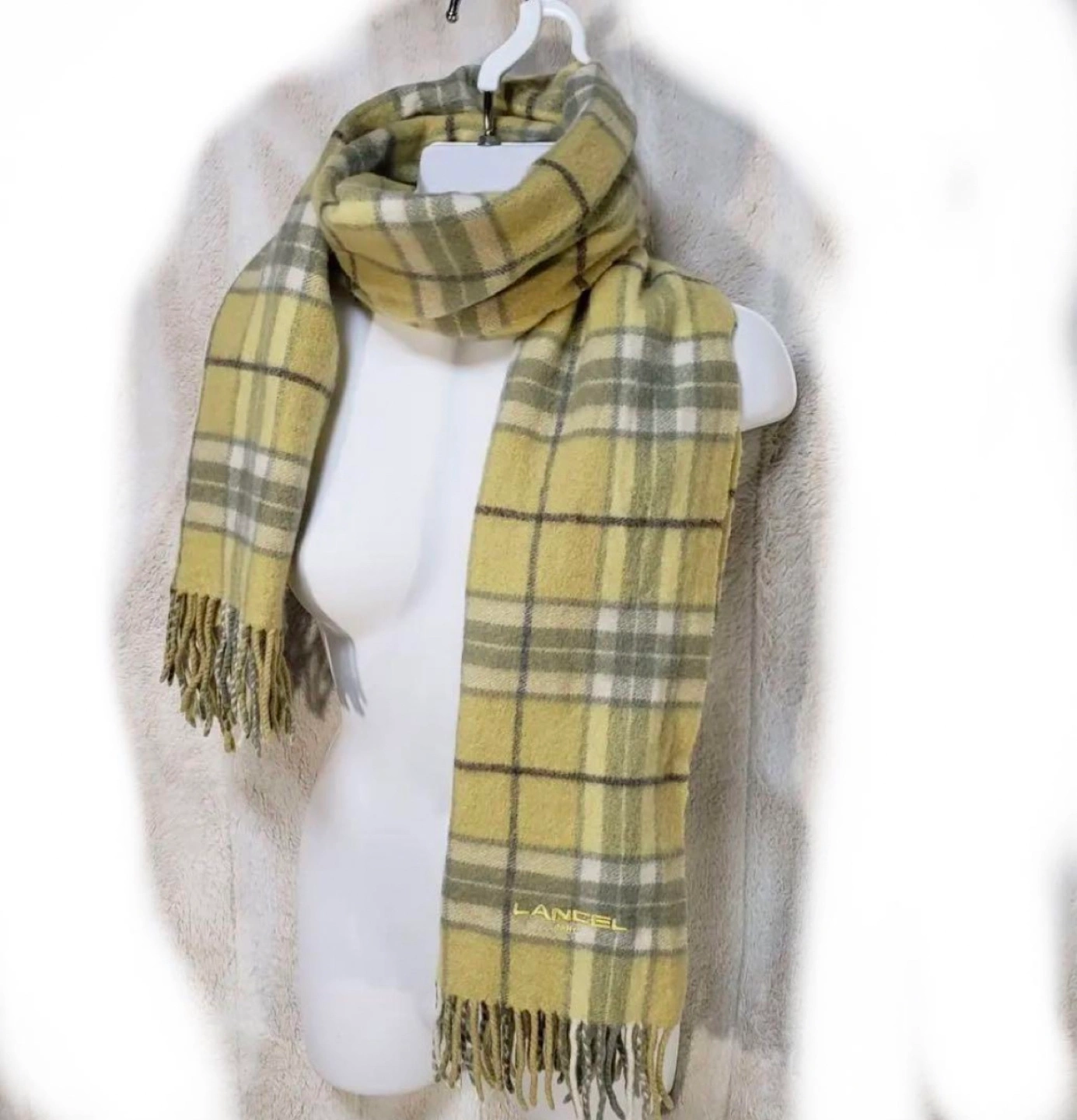 【ランセル】LANCEL 大判ストール 素材···カシミヤ 【商品の説明】 黄色地にチェック、LANCELの文字刺繍は金がかった黄色糸 【商品の状態】 使用状況:年に一度使うか使わないかの程度です。 注意事項:目立ったシミや汚れはありませんが、古物です。 細かな点で見落とし等がある場合があります。 神経質な方は入札をご遠慮ください。 ●サイズ 約65cm× 約170cm(フリンジあり) フリンジ約6cm 素人採寸ですがご参考になさってください。 *★首の毛皮は自分がDIYしたものなので、お気になさらなければ、取り外します。 しっかりとした厚みもあり、首や肩に巻くととっても暖かいです。 膝掛けにもなります。