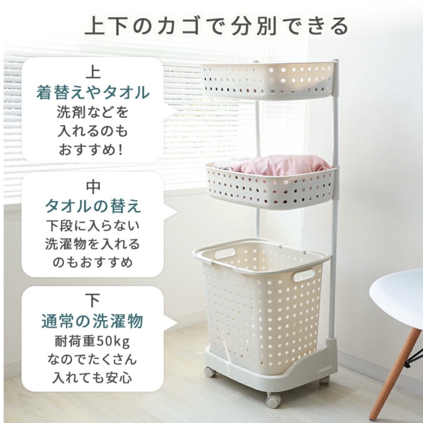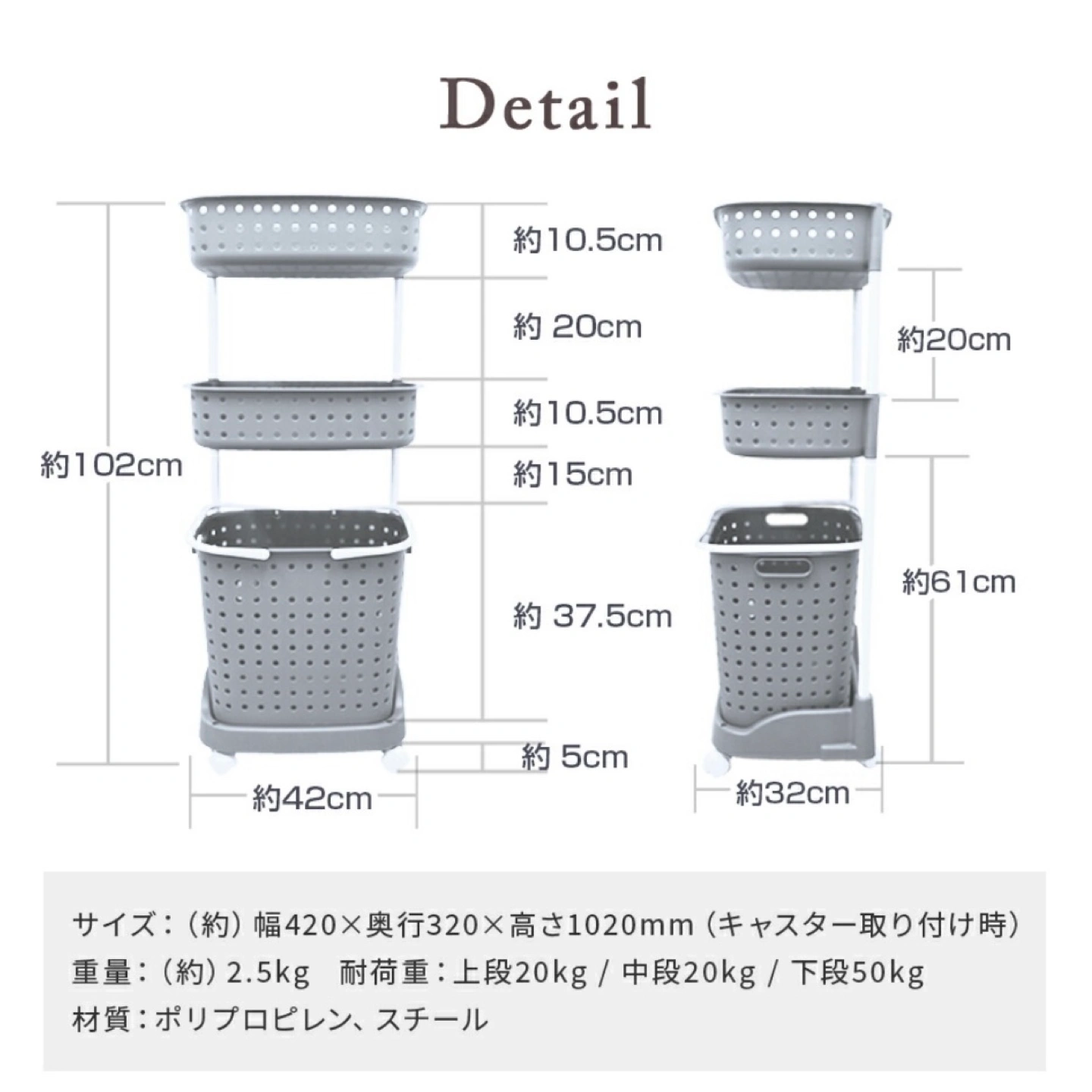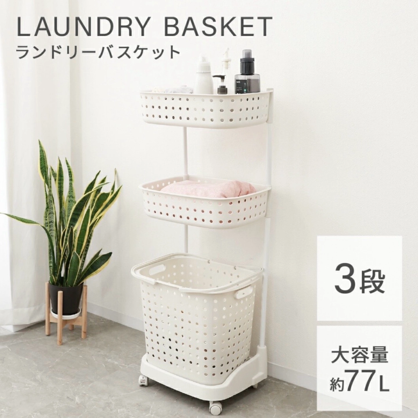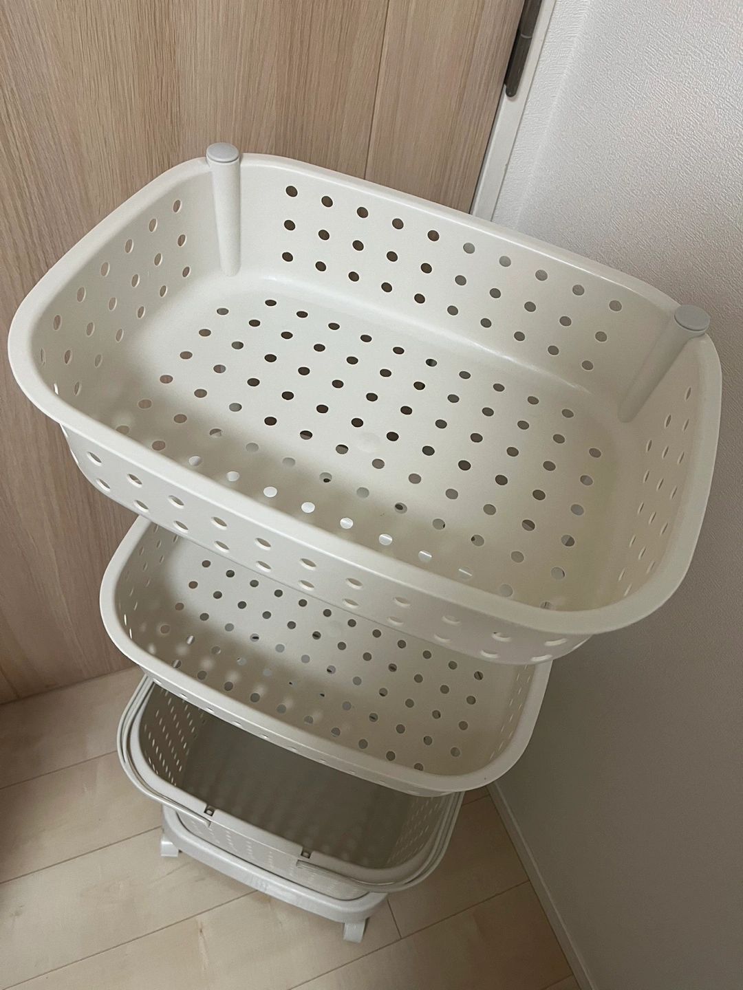 2021年9月に楽天市場で購入し、先月まで使用しておりましたが、引越しに伴い置く場所がなくなってしまったので出品いたします。 そのままのお渡しとなりますことをご了承ください。 定価:3,480円 3年ほど使用しておりましたため、多少の汚れや歪みがございます。 中古品であることをご了承の上、ご購入くださいませ。 ご不明点などございましたらお気軽にお尋ねください。 以下、商品説明です。 \スリムでも大容量!メッシュ仕様で通気性バツグン!/ シンプルなデザインとナチュラルカラーで使いやすい♪ 一人暮らしの方、ファミリーでのご使用にオススメ な3段タイプのランドリーバスケットです。 ■スッキリ置けるスリムなボディ 幅わずか42cmでデッドスペースを活用できます。 コンパクトなパウダールームやサニタリーでも省スペースに収納できます。 ■容量77Lと収納力もたっぷり 上段の浅バスケットには、バス用品、洗濯機まわりの小物が収納できます。 入浴時の着替えや脱衣カゴとしても重宝します。 下段のバスケットは、大容量の深型タイプ ワゴンから降ろして持ち運び可能なので、 洗濯機から出した衣類をバスケットに入れ、ベランダなどにそのまま持ち運べます。 ■移動に便利なキャスター付き 軽量で移動しやすく使い勝手がいいです♪ 360°回転するキャスターで、お掃除の時もストレスフリー。 軽い力でワゴン全体をラクラク移動できます。 【サイズ】(約)幅420×奥行320×高さ1020mm(キャスター取り付け時) 【重量】(約)2.5kg 【耐荷重】 上段:(約)20kg 中段:(約)20kg 下段:(約)50kg 【材質】ポリプロピレン、スチール