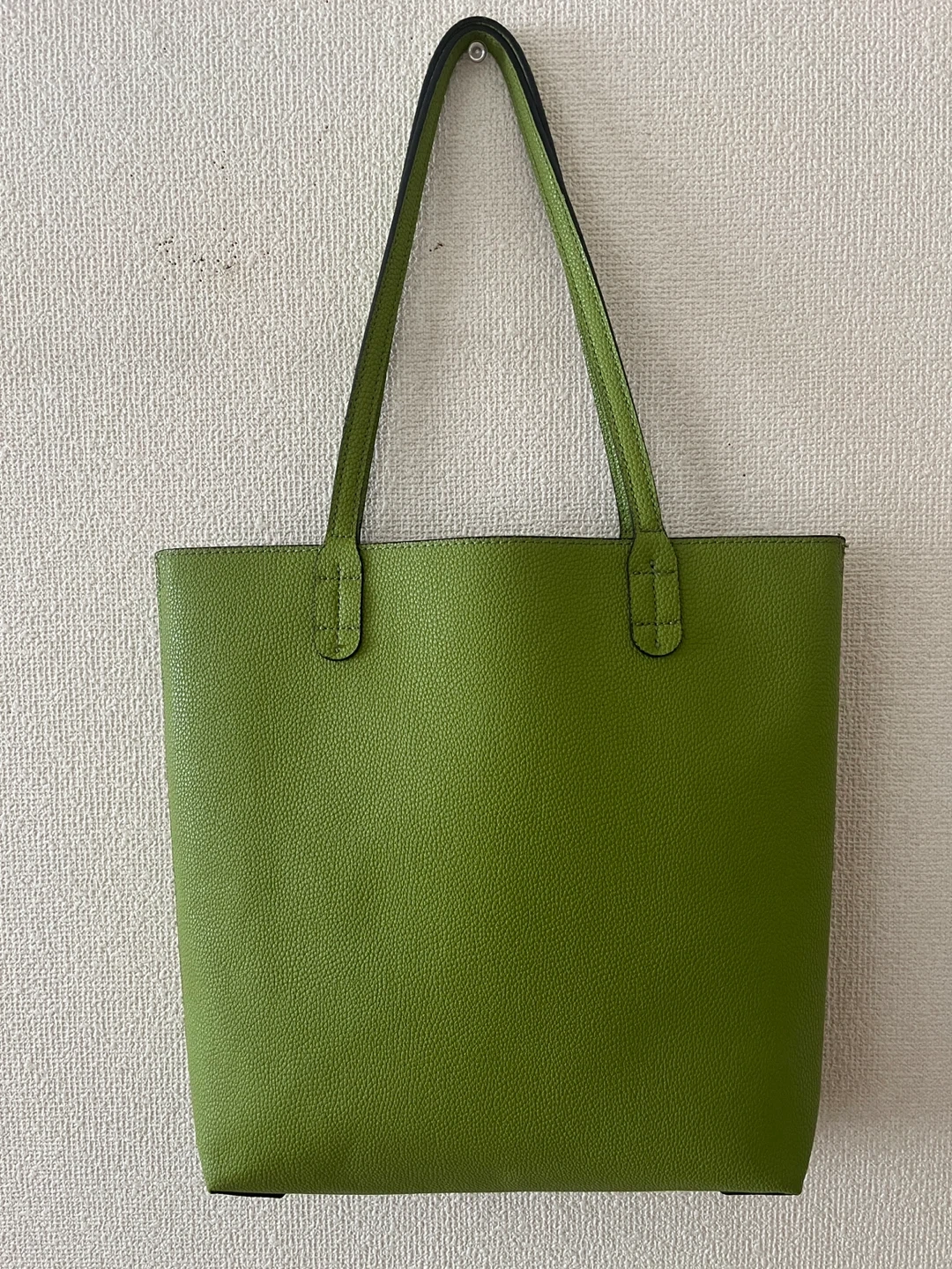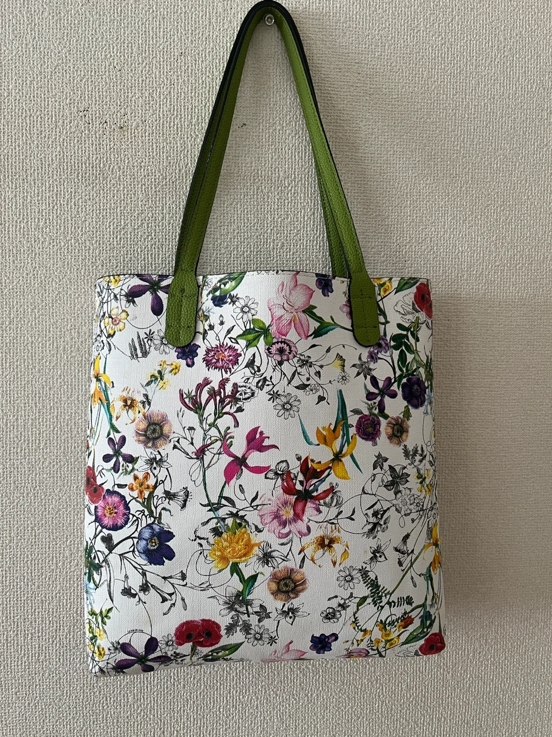 かなり前に購入し、2回ほど使用しました。 リバーシブルですが、無地のグリーンの状態でのみ使用しました。 花柄も素敵と思います。 自宅保管をご理解いただける方 よろしくお願いいたします。 合皮 約31x約35x約7 肩がけできます。