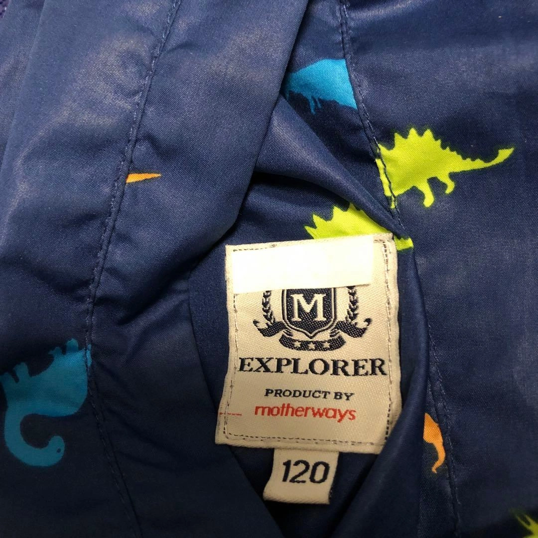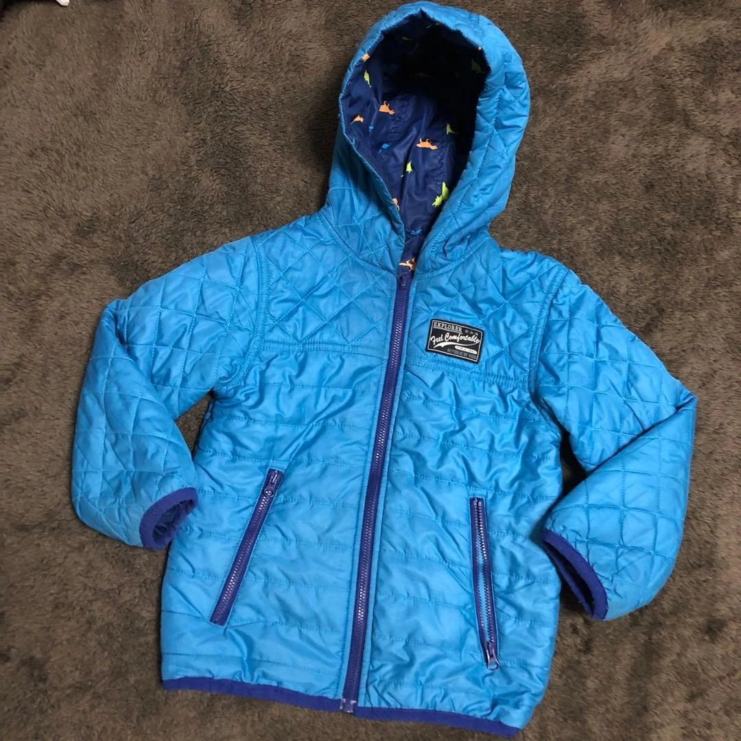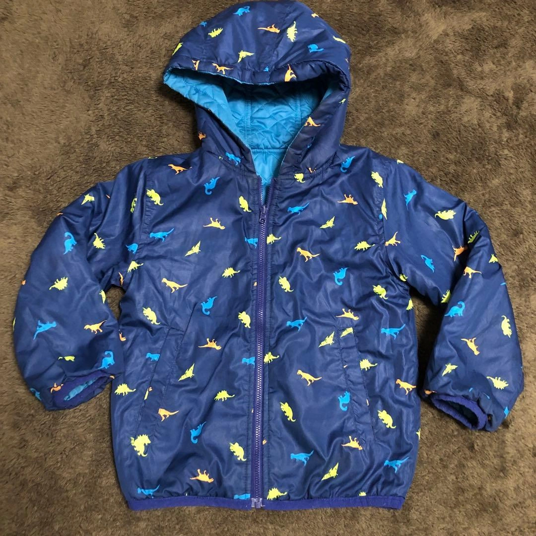 motherwaysのリバーシブルアウターです。 恐竜柄のポケットの中にタグがあります。 冬の寒い時期に重 宝します。 【デザイン】 恐竜柄が特徴的なジャケットで、子供たちに人気のデザインです。フード付きで、寒い日にも安心して着用できます。 【素材】 中綿素材を使用しており、軽量でありながら保温性に優れています。内側は青色です。 【サイズ感】 100cm以上のキッズ向けです。 - 色: 青 - 素材: キルティング - デザイン: フード付き - 内側の色: 青 - デザイン: 恐竜柄 - 色: 濃紺 - 内側の色: 青 フード···フードあり(取外し不可) 季節感···冬 カラー···ブルー 幼稚園、保育園、低学年 ご希望の方はお気軽にご連絡ください。