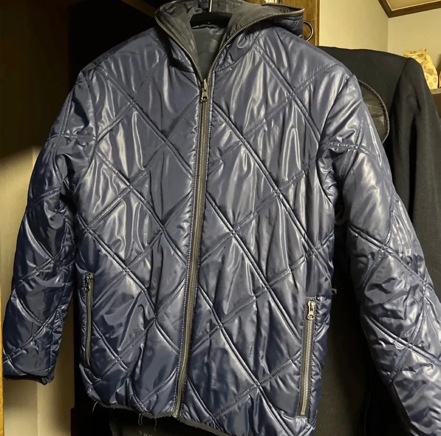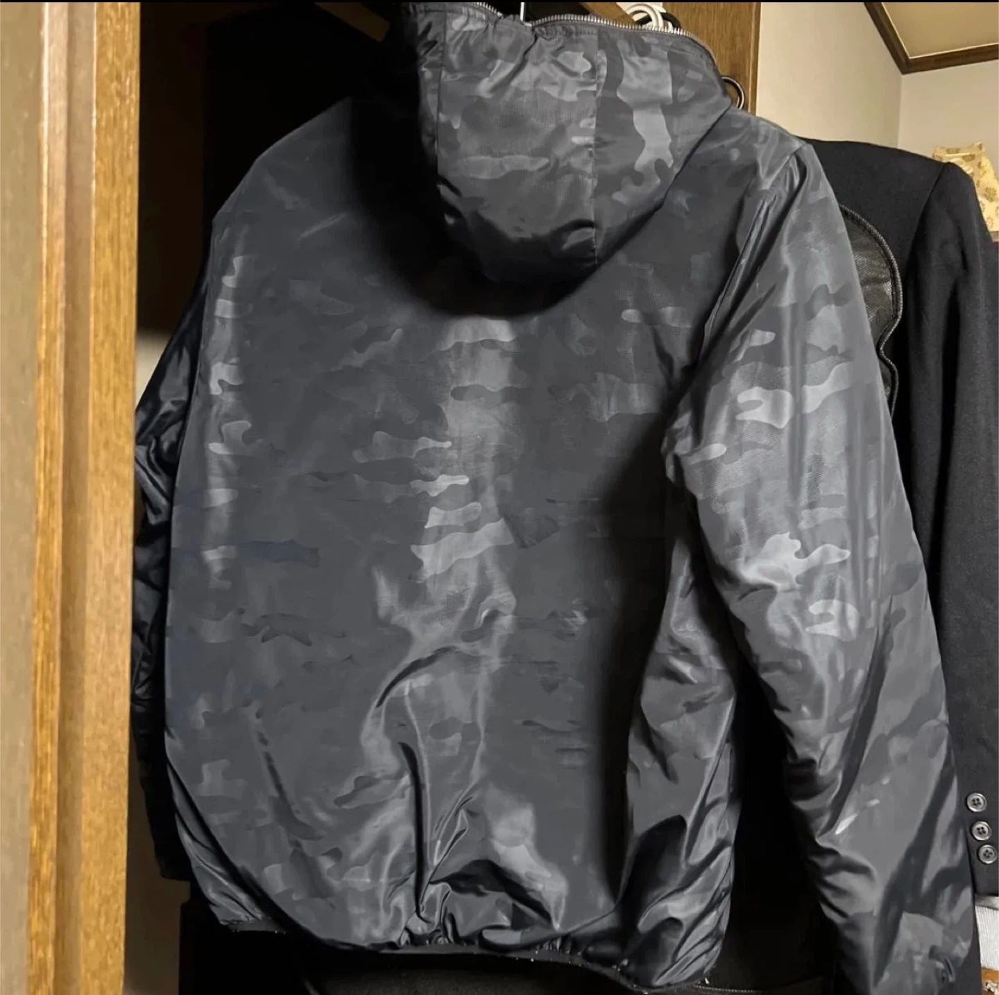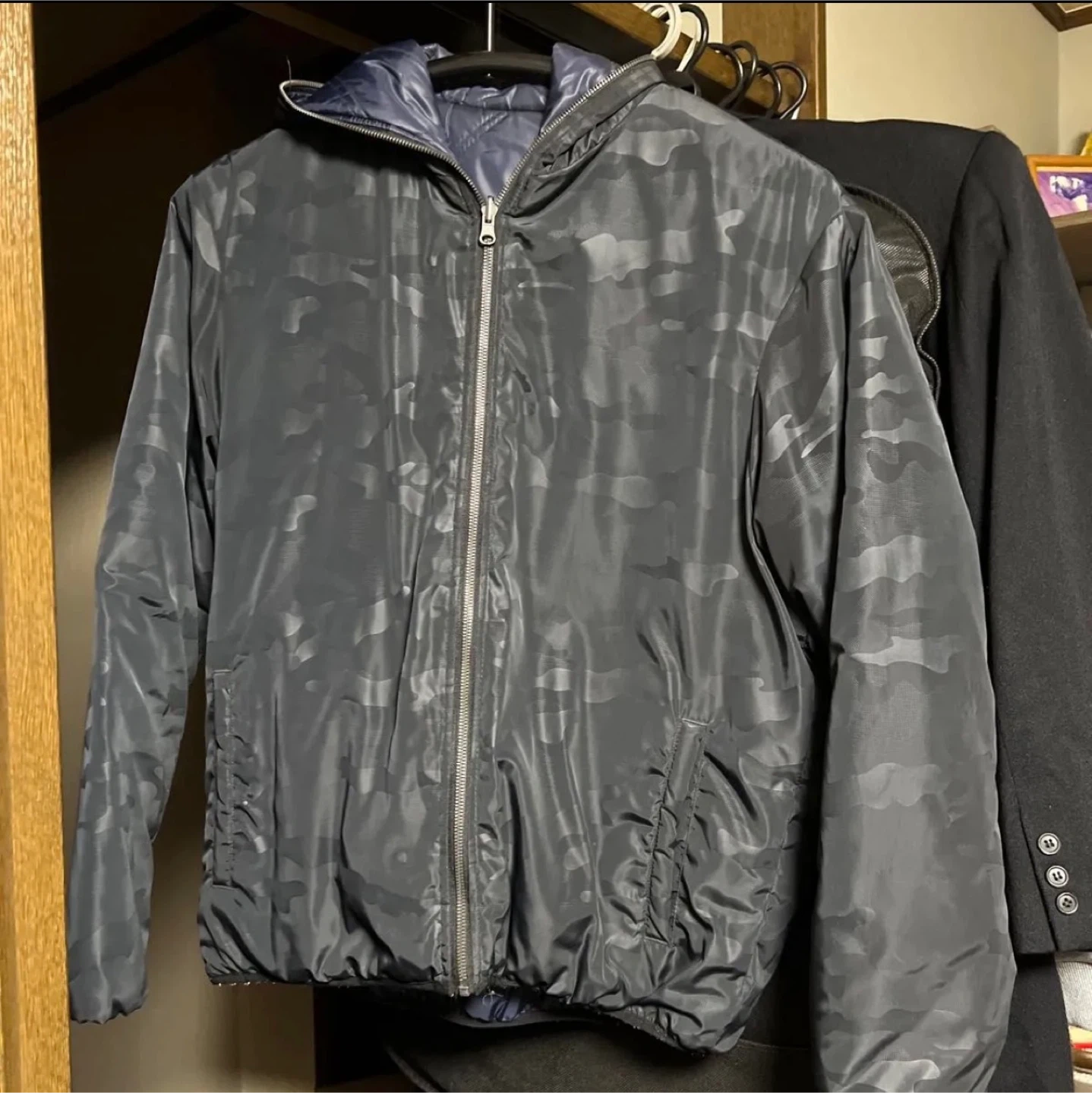 ダウンジャケット リバーシブル サイズ LL 肩幅 約50cm 胸周り(脇下) 約58cm×2 着丈 約68cm 袖丈 約64cm 素材は画像3を参照ください ポケット ネイビーブルー側はファスナーあり      黒迷彩側はファスナーなし ポリエステルダウンですが軽くて暖かいです