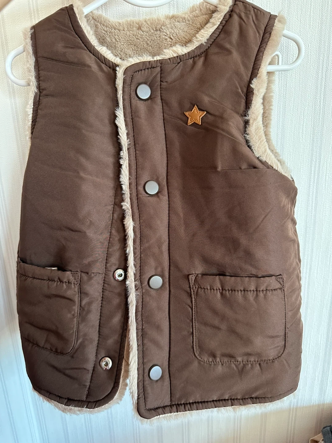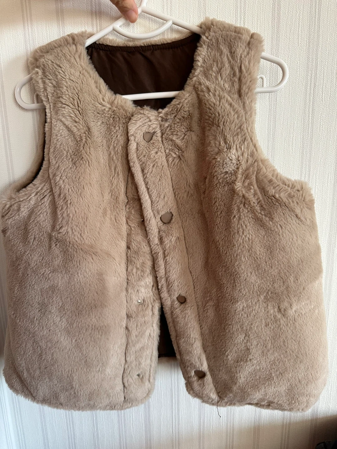 リバーシブル ベストです ・色:ベージュ ・裏地の色:茶色 ・サイズ 95cm ・ほとんど使用していないため綺麗な状態かと思います。 これからの季節にいかがですか? 中古品であることご了承ください。