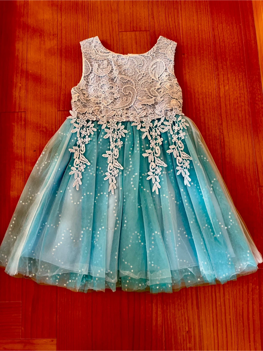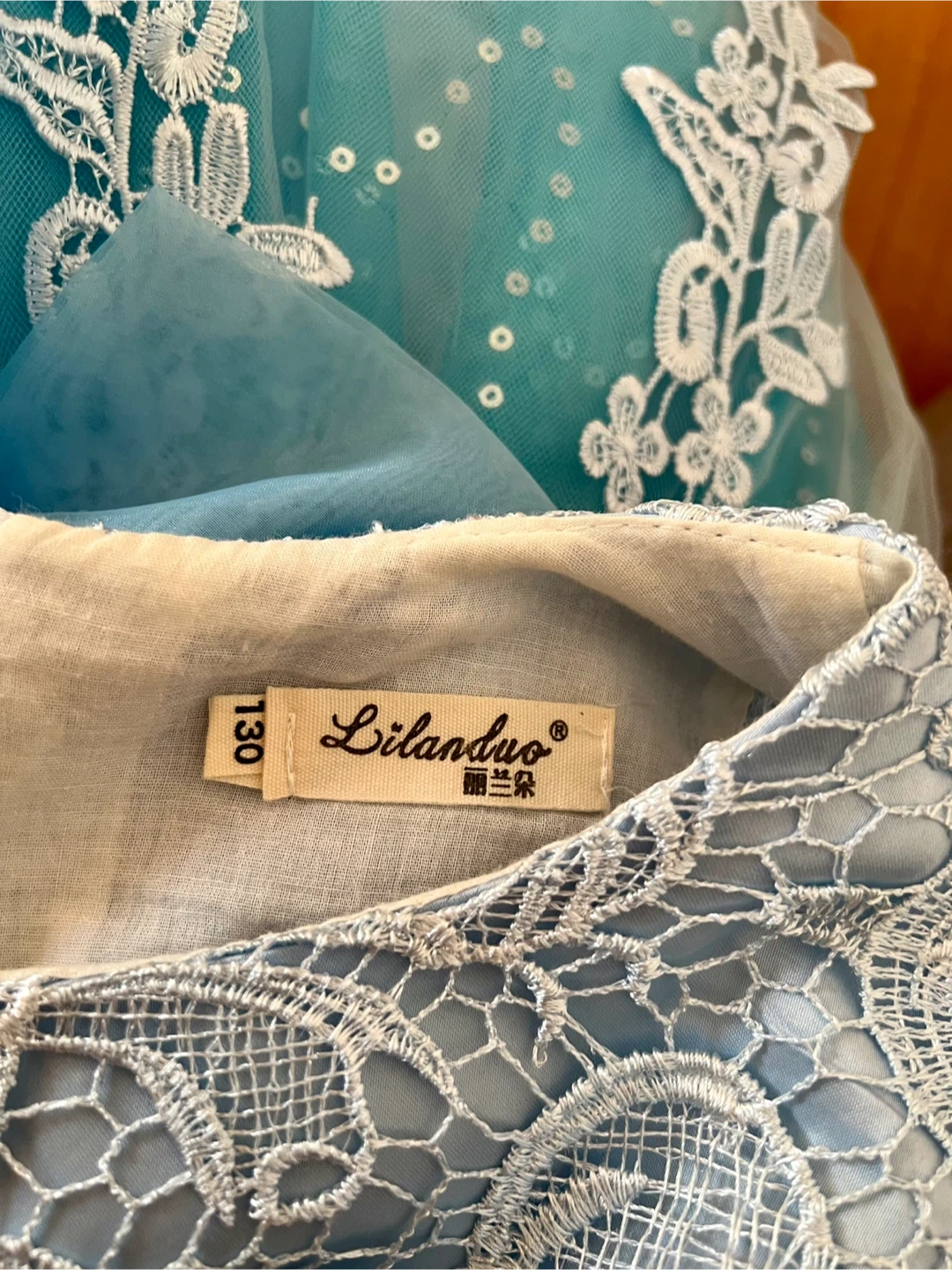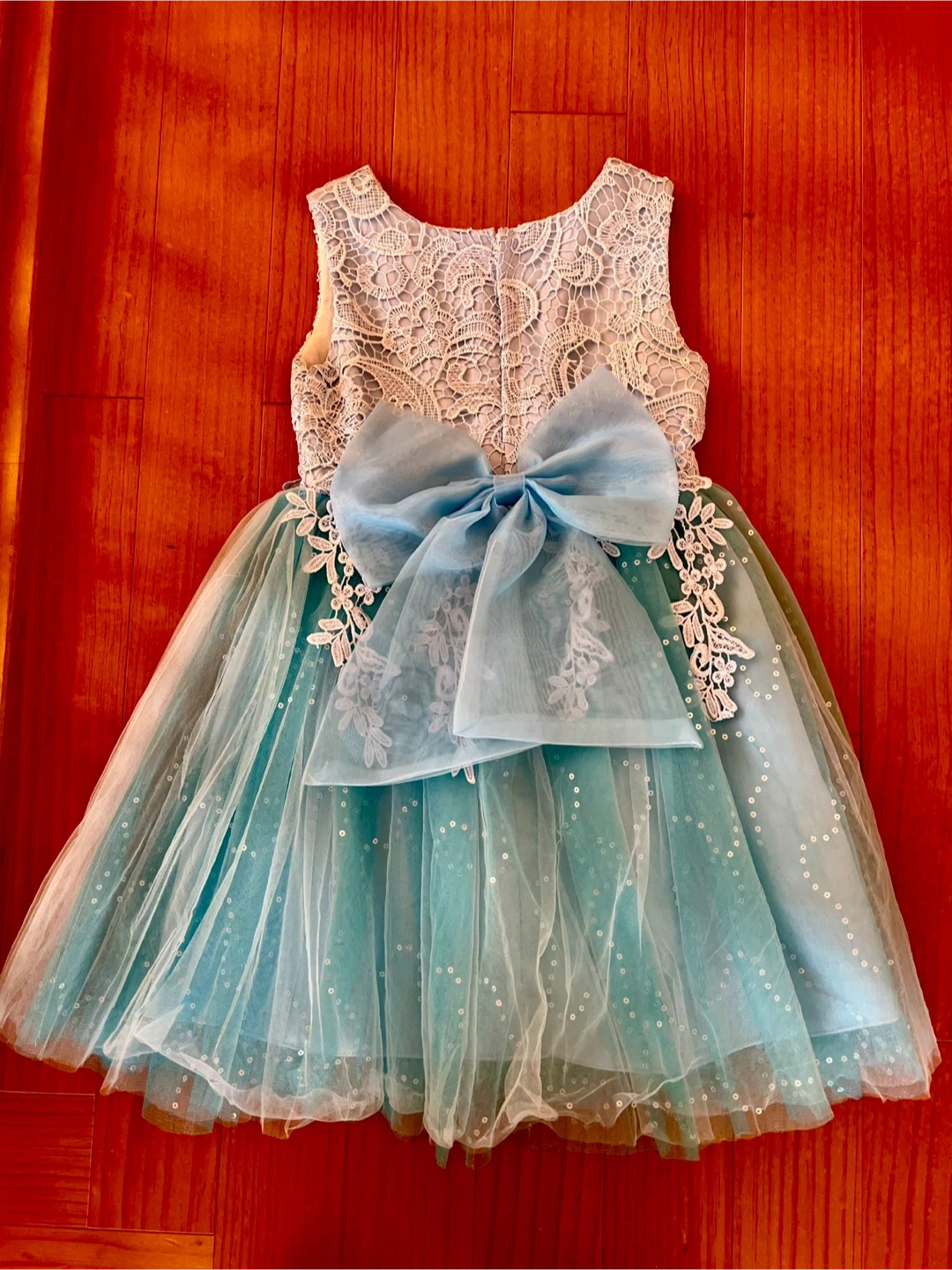 子供用ドレスです。 ピアノの発表会で2回使用しました。 ・ブランド:リランドゥー ・サイズ:130 ・色:水色、白 ・デザイン:レース、リボン、スパンコール ・状態:目立つ傷や汚れなし 中古品であることをご了承ください。