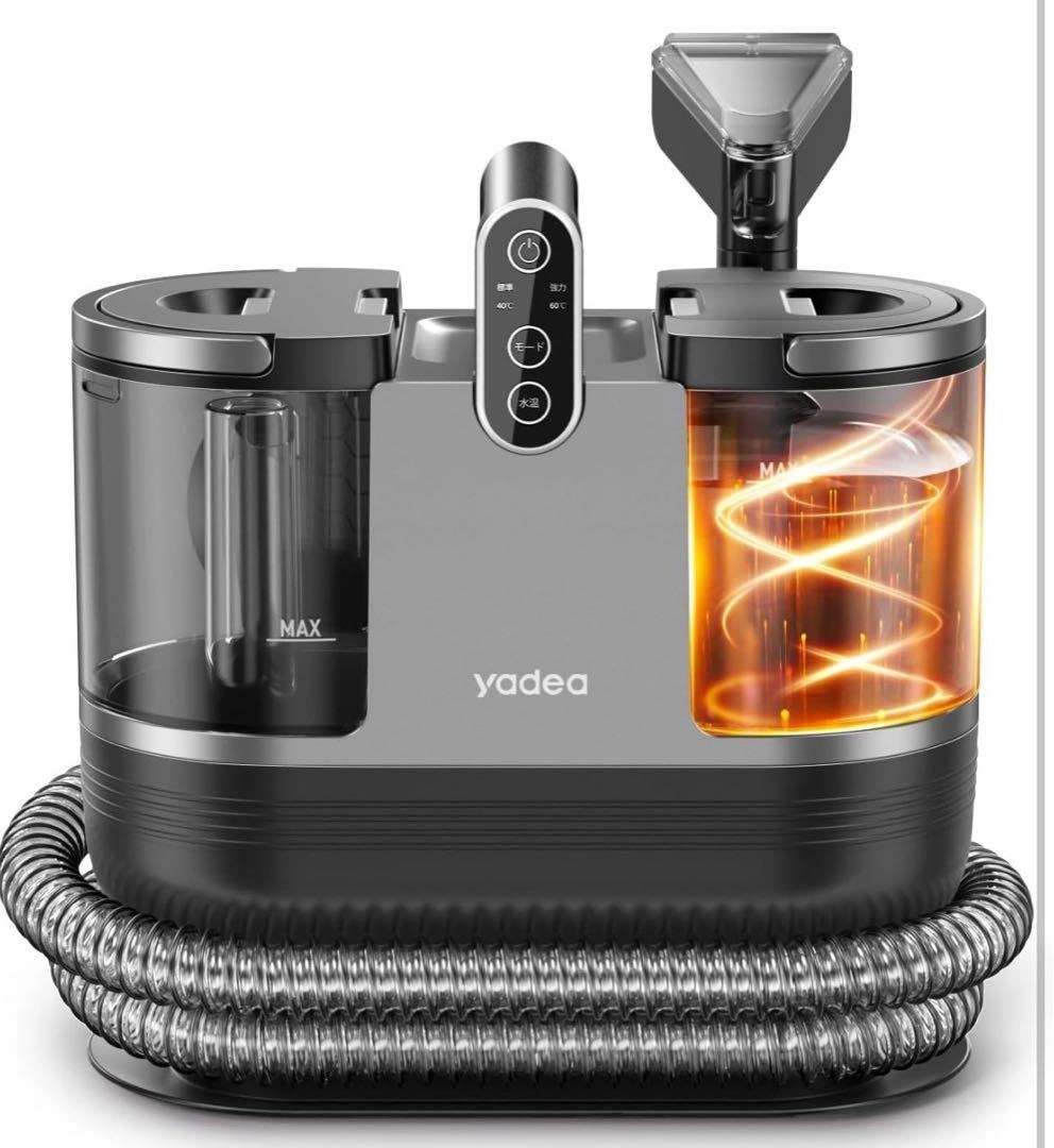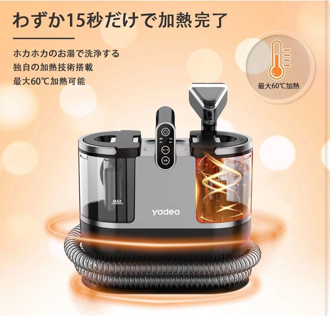 数ある中からご覧頂きありがとうございます(^○^) Yadea加熱式カーペットクリーナーです。汚れた箇所に水を吹きかけ汚れを浮かせ、汚れと水を一緒に吸引します。湿った液体の汚れだけでなく乾いた汚れや、洗剤を使用した後から水分ごと吸い取ることができます。 定温加熱機能が搭載し、15秒だけで最高60℃のお湯が出来上がりより簡単に布製品を清浄できます。従来品はお湯を清水タンクに注水する必要がありましたが、加熱式なら注水・保温の問題を解決します! 丸洗いできないほとんどの布製品を洗浄できます。適用範囲:敷布団、布製ソファー、布製イス、絨毯、カーペット、ラグ、フロアマット、カーテン、車のシート、布製マットレス、ぬいぐるみ、ペットシートなど。 最大15000PA吸引力で布製品に長年蓄積した埃/シミ/カビ/あぶら、子供の食べこぼし、ペットの吐瀉物/粗相/足跡、蓄積された頑固な汚れを奥からどんどん吸い出せます。(洗剤使用可能) LEDタッチパネルで操作できます!11000Pa標準モードと15000Pa強力モードがあり、加熱温度は40℃と60℃が設定可能、洗浄対象によって簡単に選べます。ブラシヘッド、大型ブラシヘッドまたホース洗浄用のセルフクリーニングヘッドを提供します。 ご希望の方はお気軽にご連絡ください。
