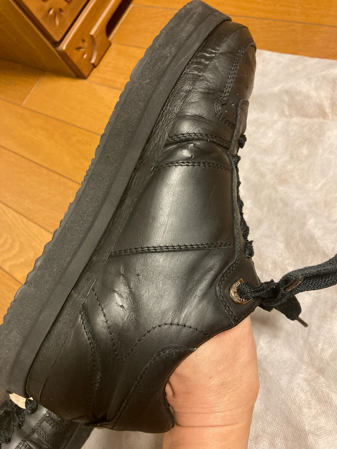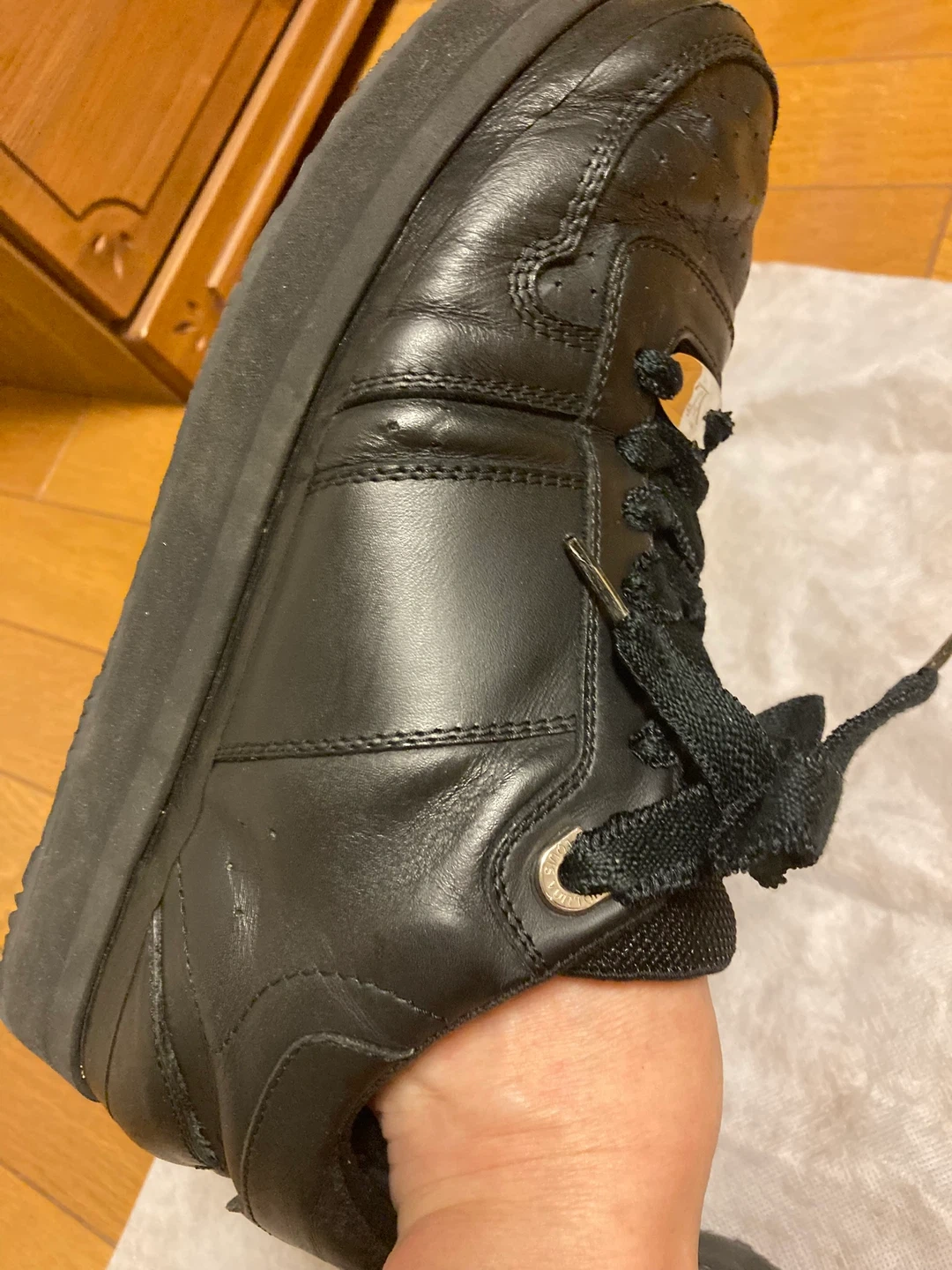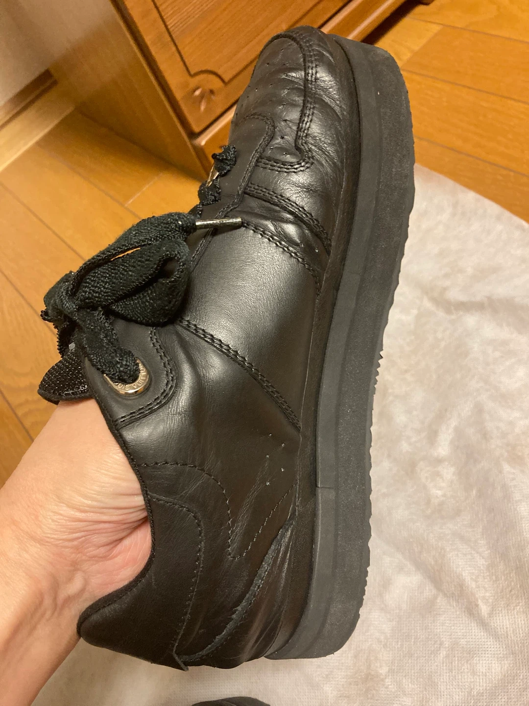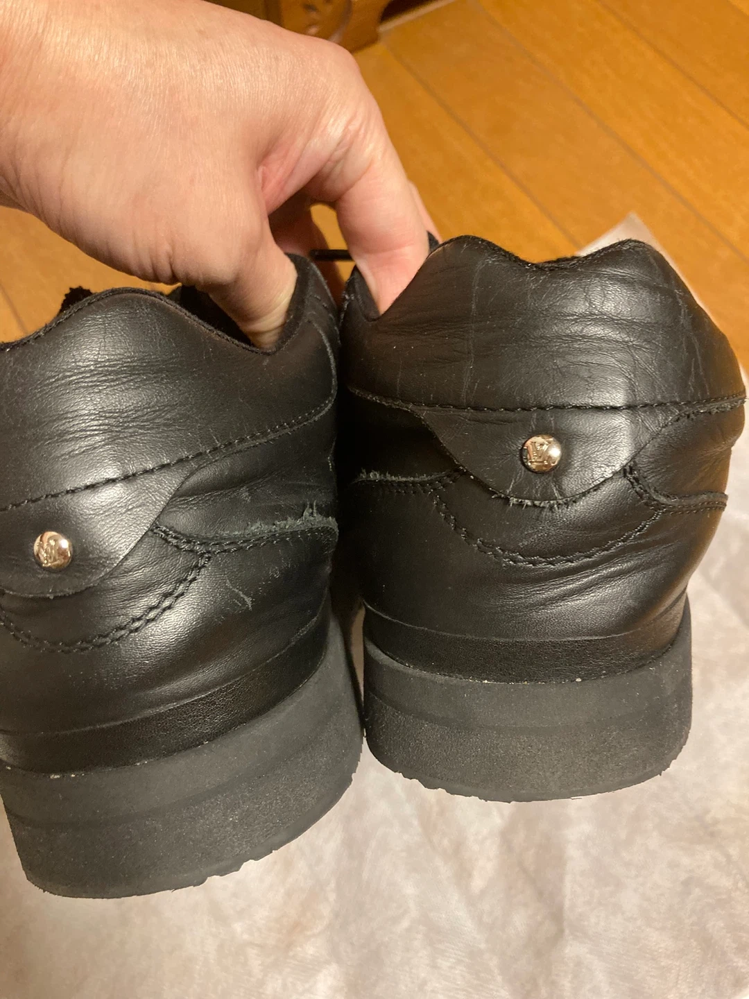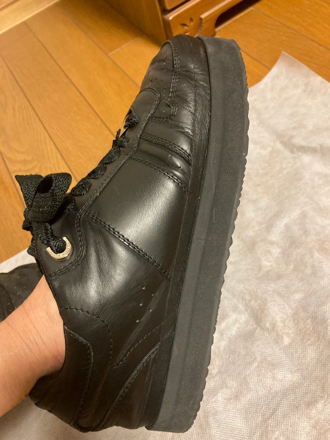 ルイヴィトンのレザースニーカーです。 ・ブランド:ルイヴィトン ・色:ブラック ・素材:レザー ・状態:使用感あり ・箱有ります。 大切に履いていましたが、ソールが割れてしまい交換しました。 リペア品であることをご了承ください。 普段26cmを履いていますが、少し大きく感じました。26.5〜27cm履いている方ならサイズが合いそうです。