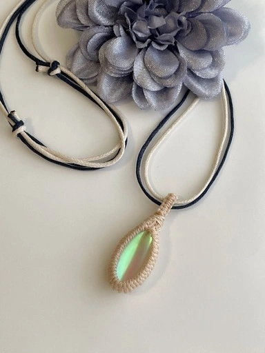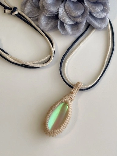 ルナフラッシュマクラメ編みペンダント(ホワイト)です。 ホワイトのマクラメにクリスタルカラーのルナフラッシュの組み合わせ。 紐長さ 85cm 男女兼用 長さ調節タイプ ネックレス紐はワックスコードを2本どり。白と紺色にすることで洋服に合わせる幅を広げました。 ※ペンダント紐は、包装の際になるべく優しくお纏めしておりますが、どうしても若干の纏め癖がついていると思われます。開封後はペンダントを掛けて収納されることをお勧め致します。また、紐のペンダントトップ部に当たる箇所はまだ癖付けしてない為に丸く感じるかと思います。ご使用の際には紐をお好きな具合に癖付けされますと、更に見た目のバランスがとれ馴染みやすくなります。 ☆ルナフラッシュは石の中央に光沢のフィルムを挟んで作る人口石です。内部に光が宿って見えるのが特徴。月を思わせる輝きはとてもエレガントです。ルナフラッシュは心の傷を癒すヒーリングストーンとして優れたエネルギーがあると言われており、新しいチャンスを引き寄せポジティブな光を人生にもたらすきっかけを与えてくれるパワーストーンです。 こちらの商品はハンドメイドアクセサリー「Divina AmoR」が製作しています。 1点1点、全て手作業で心を込めてつくっておりますので同じデザインのもでも少しずつ個体差があり、すべて世界でひとつだけの作品となっております。 使用しているパーツも特に天然石、ビーズを使ったアクセサリーはひと粒ひと粒の型や色に違いがございます。ディヴィナのアクセサリーはそのひと粒の違いもニュアンス、味わいと捉えており、更に1点1点に個性がでるデザインをそのまま楽しんで頂けたら幸いです。 金属アレルギーの方の為にもなるべくアレルギー反応が少なくなるように心がけ製作しておりますが、全てにおいて100%の保証はございません。お買い求めの際はお客様の判断となります。ご理解の上ご了承くださいますようお願い致します。
