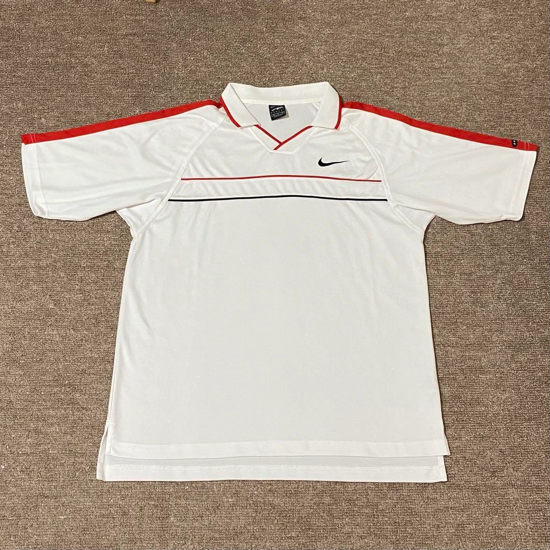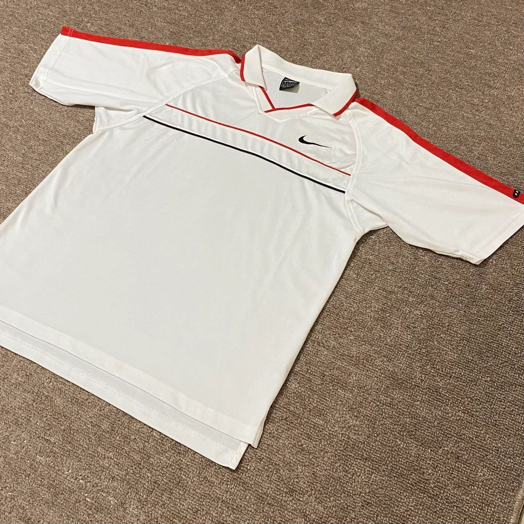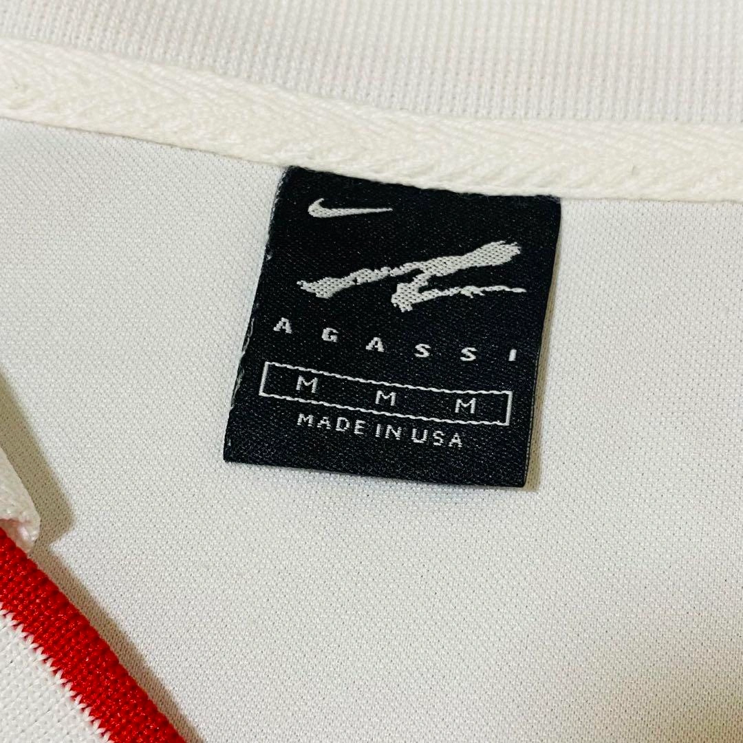 ナイキ テニスウェア 1997年 アンドレ・アガシモデル DRI-FIT 半袖ポロシャツ カラー:ホワイト×レッド×ブラック 素材:NIKE DRI-FIT(ポリエステル100%) アンドレ・アガシがピート・サンプラスやマイケル・チャンなどと世界ランキングの上位を争っていた90年代後半頃、正確には1997年春夏モデル 左袖の『DRI-FIT』のラベルや、朽ちやすい首元のアガシのロゴの入ったタグも剥がれておらず良い状態です(写真⑥,⑧参照)。 表記サイズはUSサイズのM 実寸です ◆身幅 57cm ◆着丈 74cm ◆裄丈 53cm ※【状態について】→目立った傷や汚れもなく良い状態ですが今から約24年前の品物です。わずかな経年劣化などあるかもしれません。 貴重なアガシモデルのコレクションの一品とお考えください。 完璧な品質をお求めになる方はご遠慮ください。ご理解いただける方のみご購入ください。 家族全員タバコは吸いませんしペットもいませんので独特の嫌な臭いはないと思います。 袖···半袖 性別···メンズ