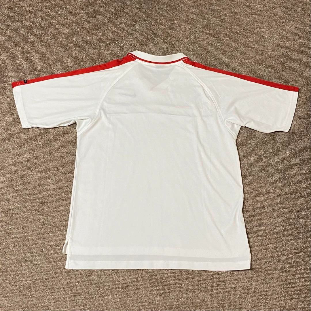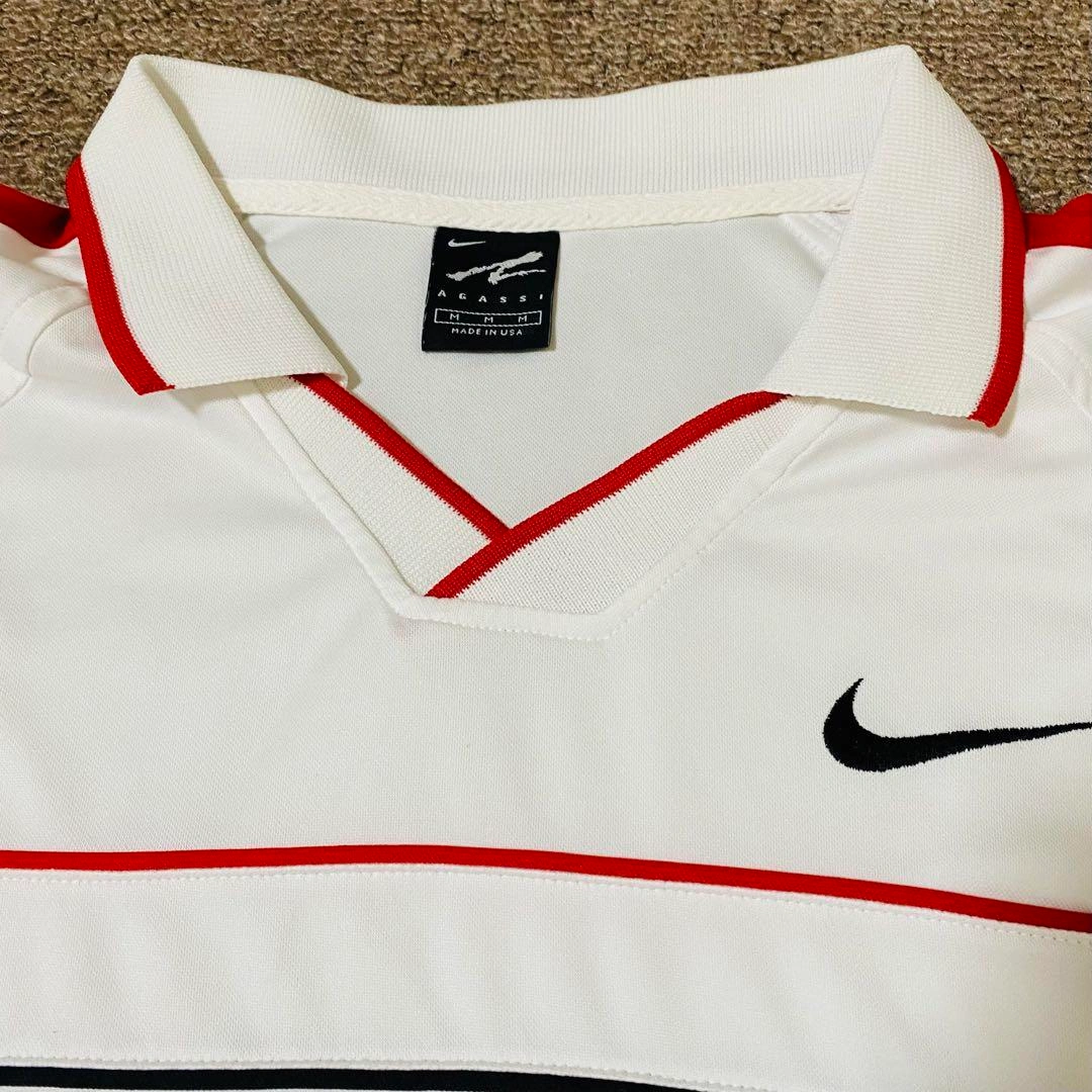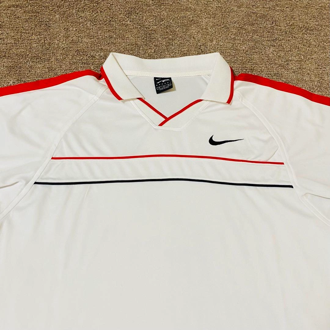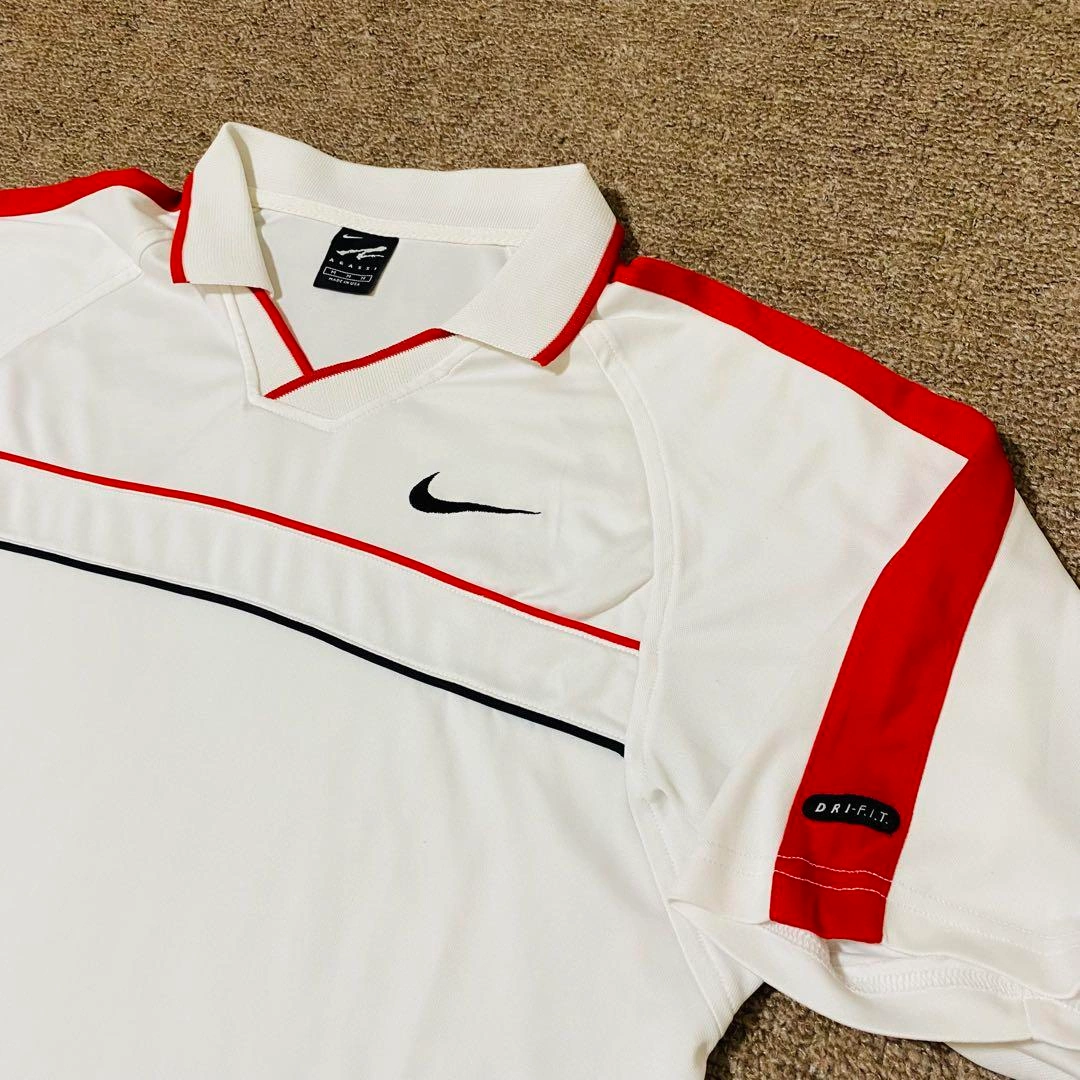 ナイキ テニスウェア 1997年 アンドレ・アガシモデル DRI-FIT 半袖ポロシャツ カラー:ホワイト×レッド×ブラック 素材:NIKE DRI-FIT(ポリエステル100%) アンドレ・アガシがピート・サンプラスやマイケル・チャンなどと世界ランキングの上位を争っていた90年代後半頃、正確には1997年春夏モデル 左袖の『DRI-FIT』のラベルや、朽ちやすい首元のアガシのロゴの入ったタグも剥がれておらず良い状態です(写真⑥,⑧参照)。 表記サイズはUSサイズのM 実寸です ◆身幅 57cm ◆着丈 74cm ◆裄丈 53cm ※【状態について】→目立った傷や汚れもなく良い状態ですが今から約24年前の品物です。わずかな経年劣化などあるかもしれません。 貴重なアガシモデルのコレクションの一品とお考えください。 完璧な品質をお求めになる方はご遠慮ください。ご理解いただける方のみご購入ください。 家族全員タバコは吸いませんしペットもいませんので独特の嫌な臭いはないと思います。 袖···半袖 性別···メンズ